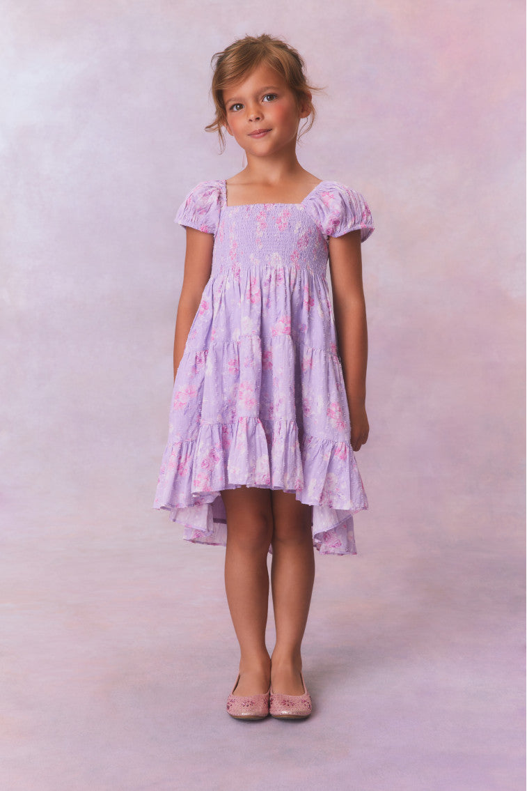 The Muriella returns to match your Morningim fragrance. In our new dreamy floral prints. this dress features sweet flutter sleeves. a smocked top falling to a three-tiered skirt with ruffles throughout and an asymmetrical hem.