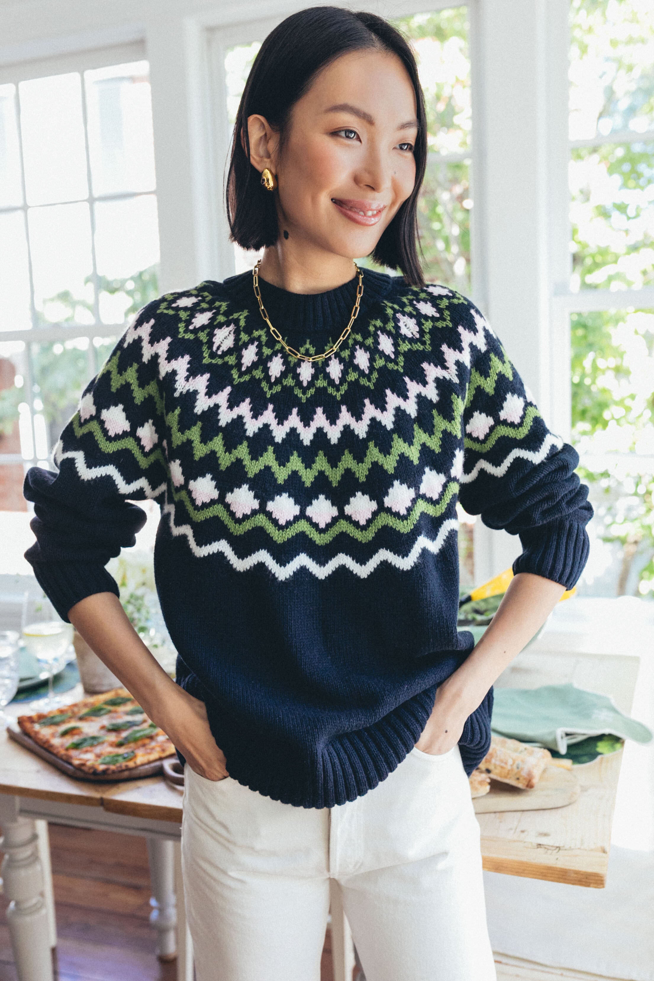 A fresh take on Fair Isle. the Chesil Knit is keeping us cozy this season. With a chic crewneck. long sleeves with ribbed cuffs. and a slightly relaxed fit perfect for layering or tucking in. this classic navy sweater is exactly what you need for sitting by the fire. sipping a hot toddy. or braving the cold. Pair with a midi skirt and tall boots to dress it up. or keep it classic with denim and gold hoops for everyday wear.