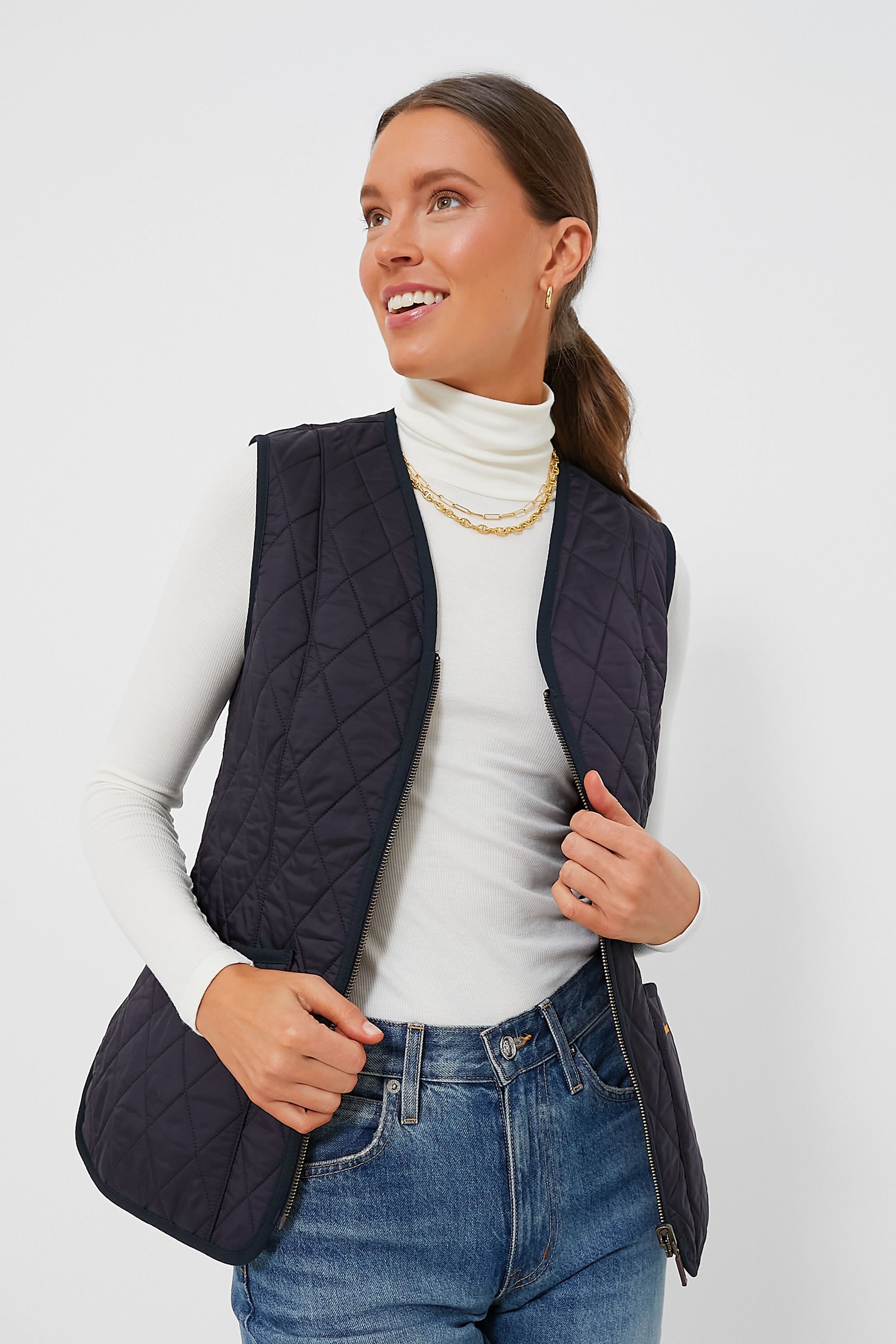 Offering the same fuss-free looks and timeless style as the original Betty Liner. this updated version adds a cozy fleece lining for extra warmth. Deep patch pockets are ideal for keeping hands out of the cold and essentials close by. while grosgrain binding and contrast embroidery enhance the premium appearance. Perfect worn alone. zipped into a Beadnell. or over a turtleneck. this vest is versatile and comfortable. featuring the signature diamond quilt. flattering angle patch pockets. and a feminine fit.