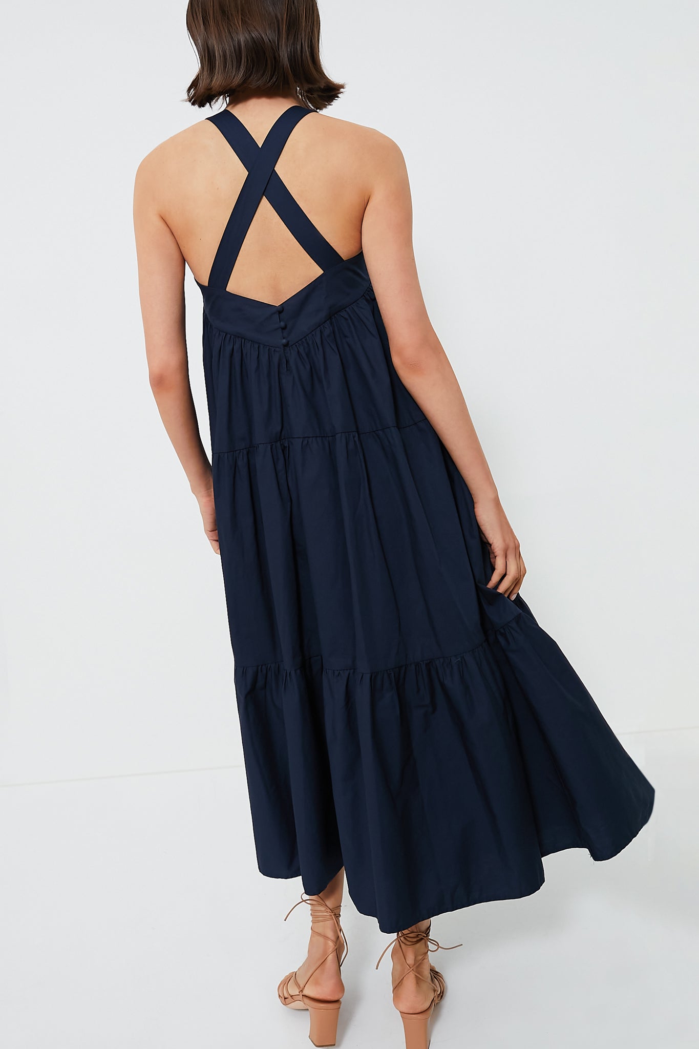 The Navy Irene Dress is effortless and oh-so-elegant. This maxi boasts a halter neckline. criss-crossed straps. and a full tiered body that will move with you every step you take. Opt for a casual look with simple sandals and a tote. or dress up with heels and accessories.