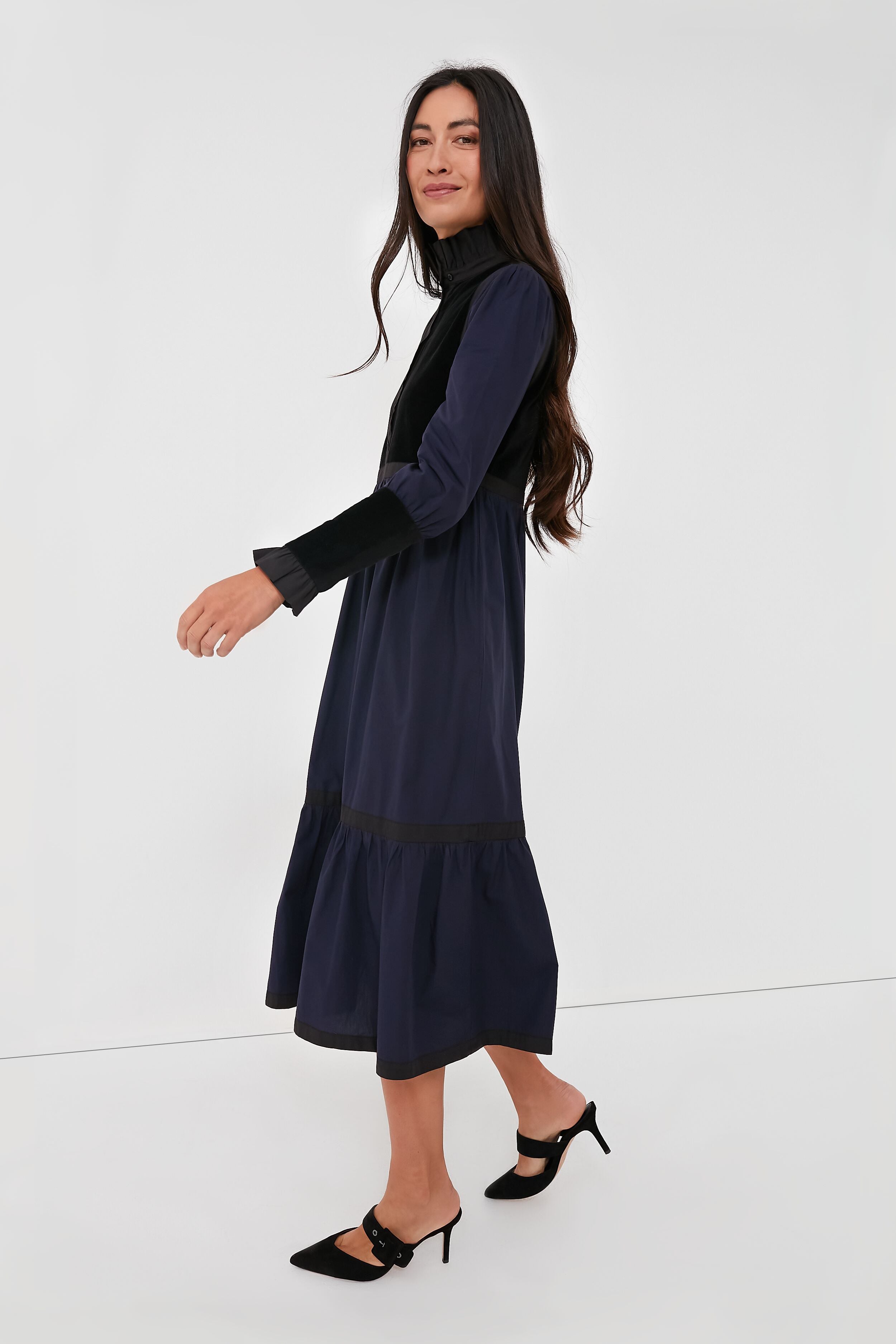 Crafted from a crisp cotton with a contrasting velvet bodice. the Navy Kavita Dress is chic without compromising functionality. Featuring romantic ruffles along the collar and cuffs. this piece is distinctly feminine without being too sweet. Perfect for dinner parties and upcoming social events. we are styling this midi with heels and a handbag for an elegant ensemble. or with leather boots and gold hoops for a day of exploring a new city.