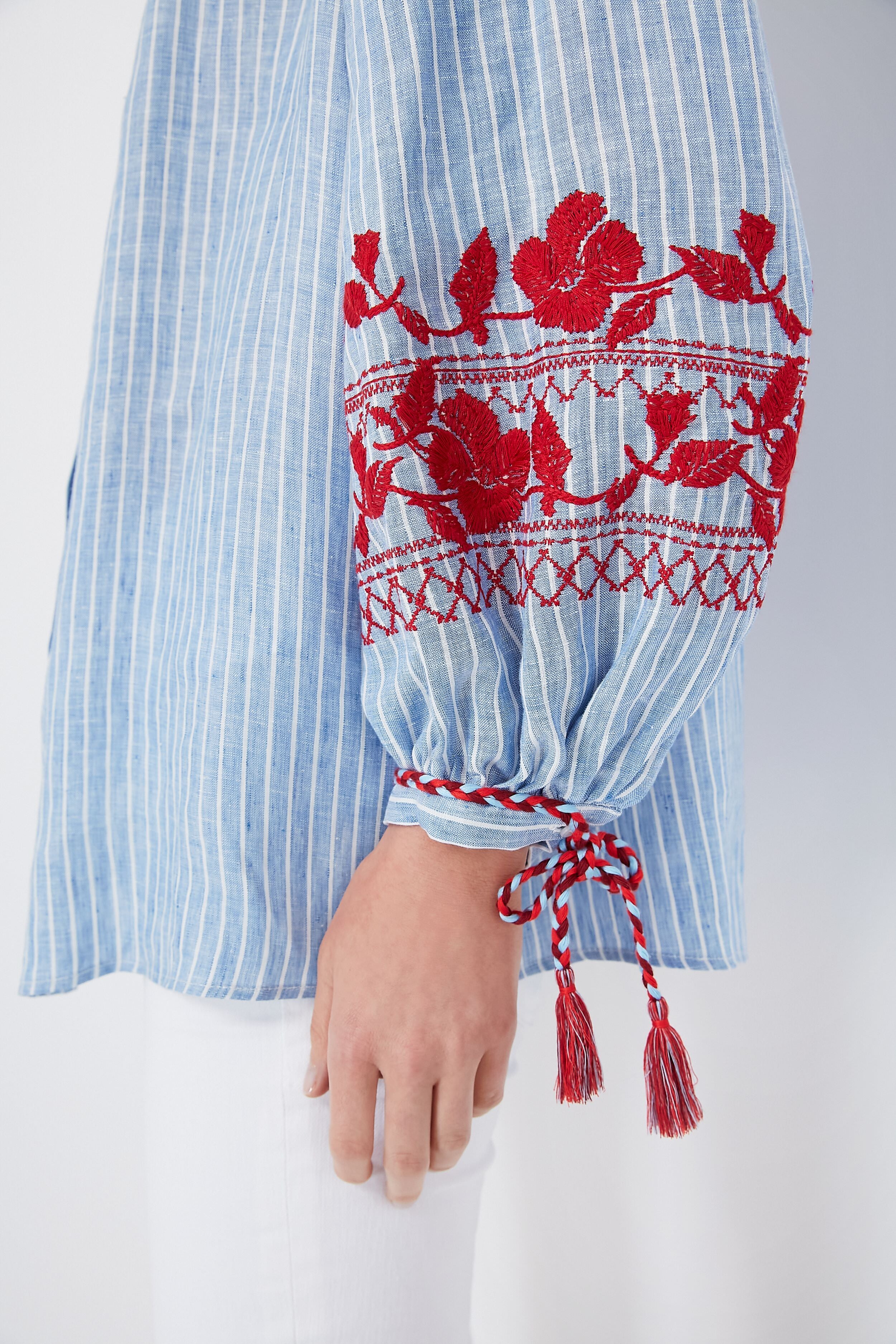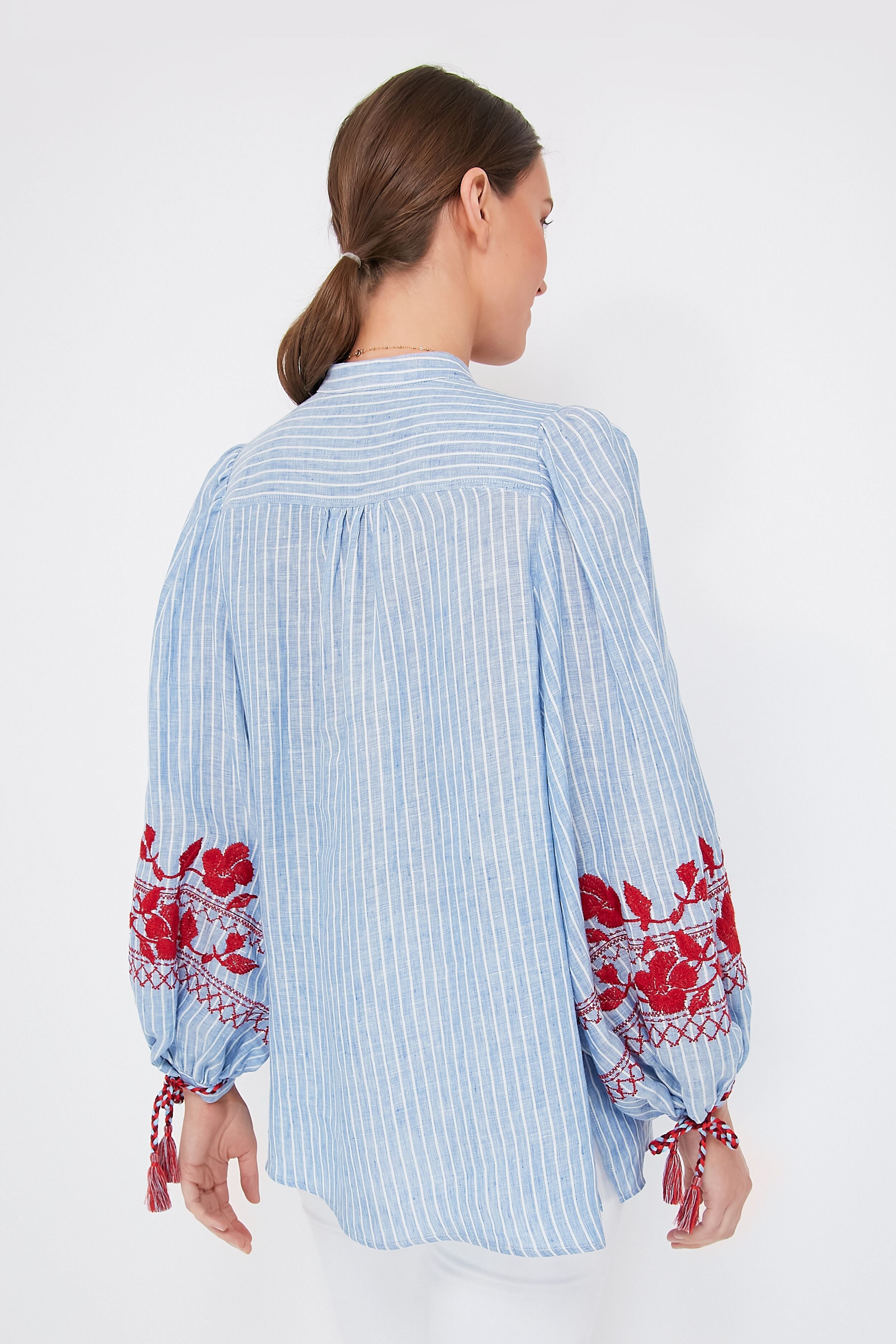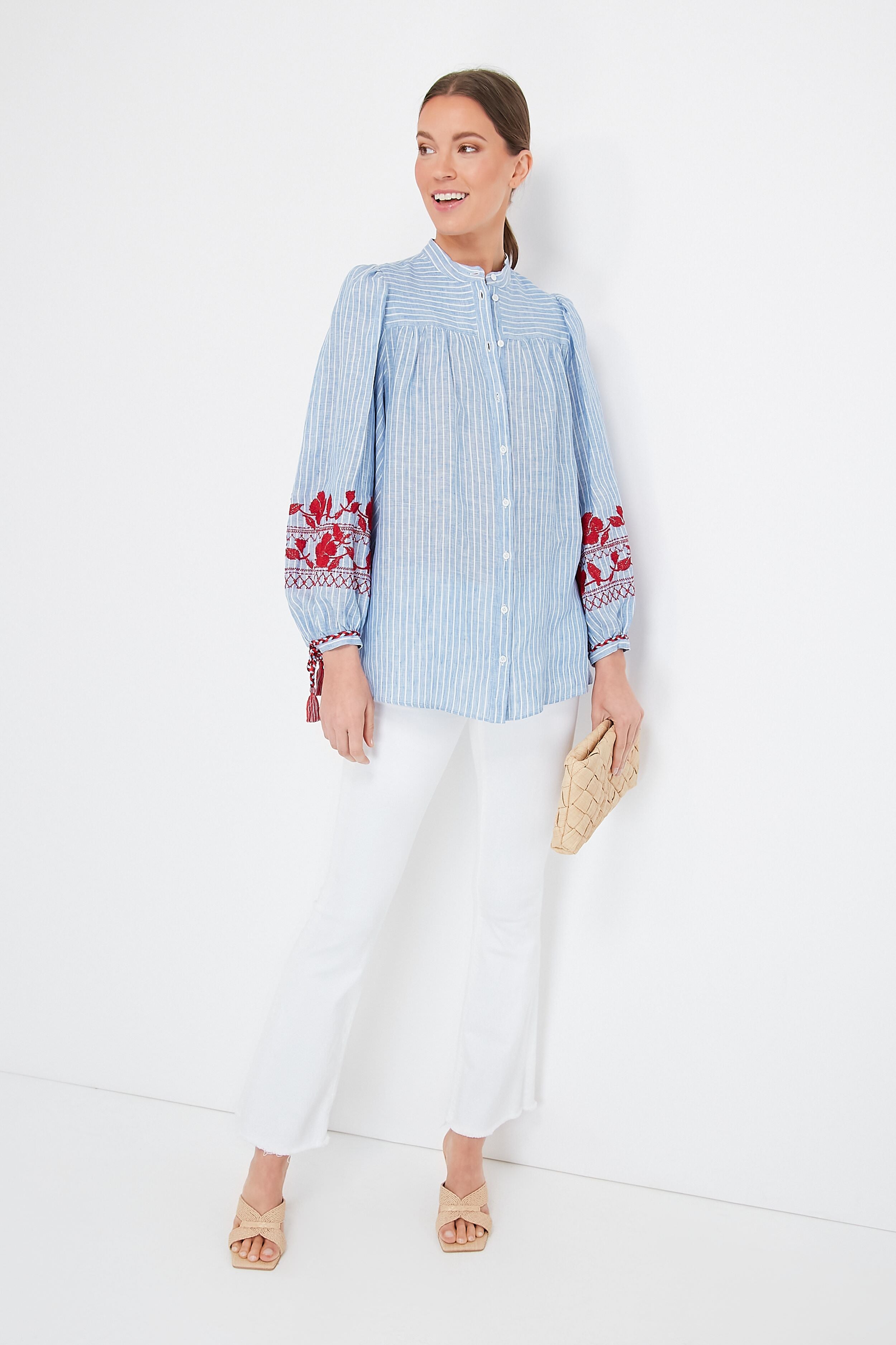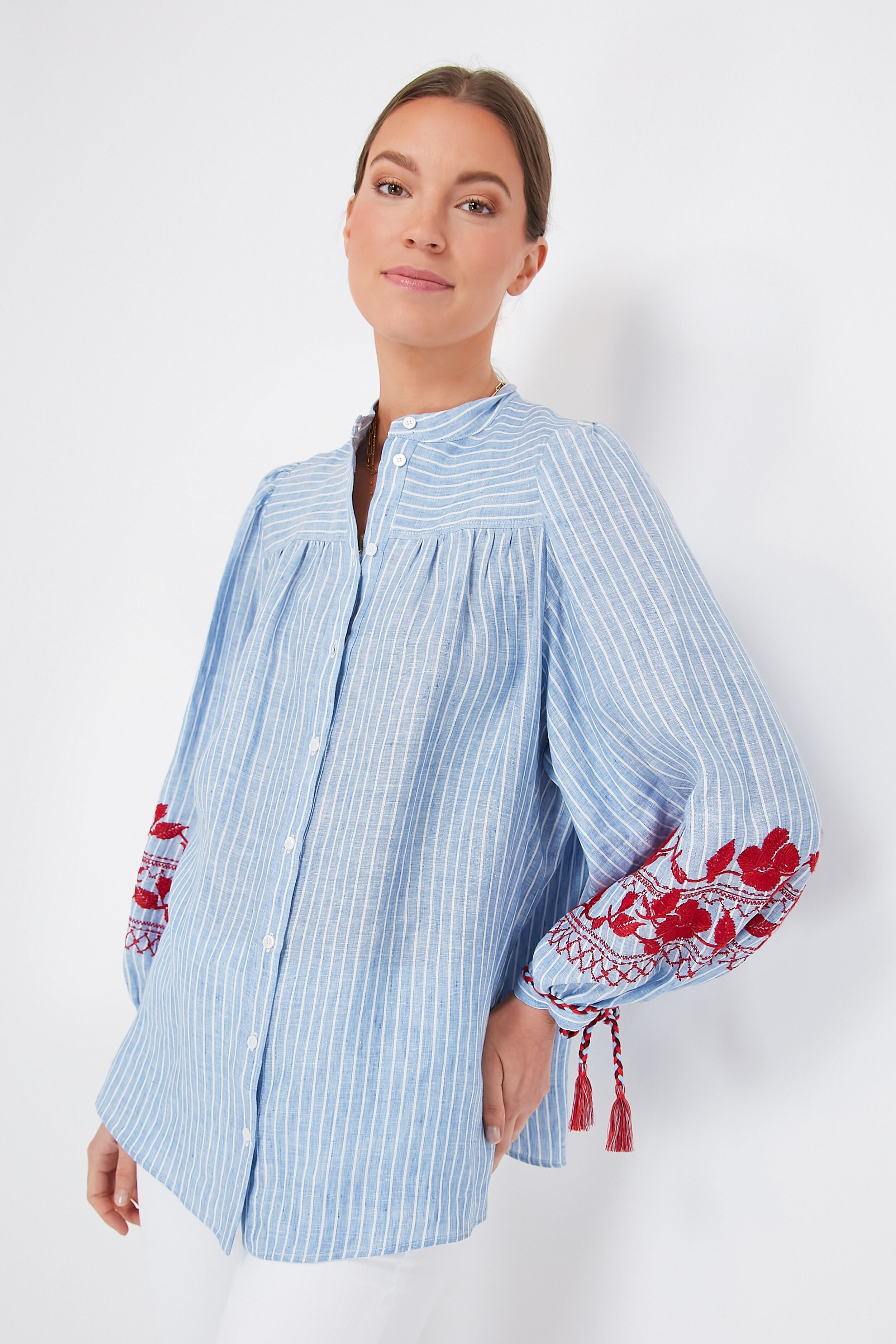 Talk about a statement top! The Navy Legno Blouse makes a real splash with its standout sleeves — a balloon shape. contrasting floral embroidery. and tassel ties all bring the flair. Bohemian-inspired details like a mandarin collar and a relaxed fit take a pinstriped button down to new heights. so we know you'll be excited about this stunning silhouette. Pair with white denim and sandals for a lowkey yet lovely look. or with a flowing maxi skirt and a raffia clutch to lean into beachy boho.