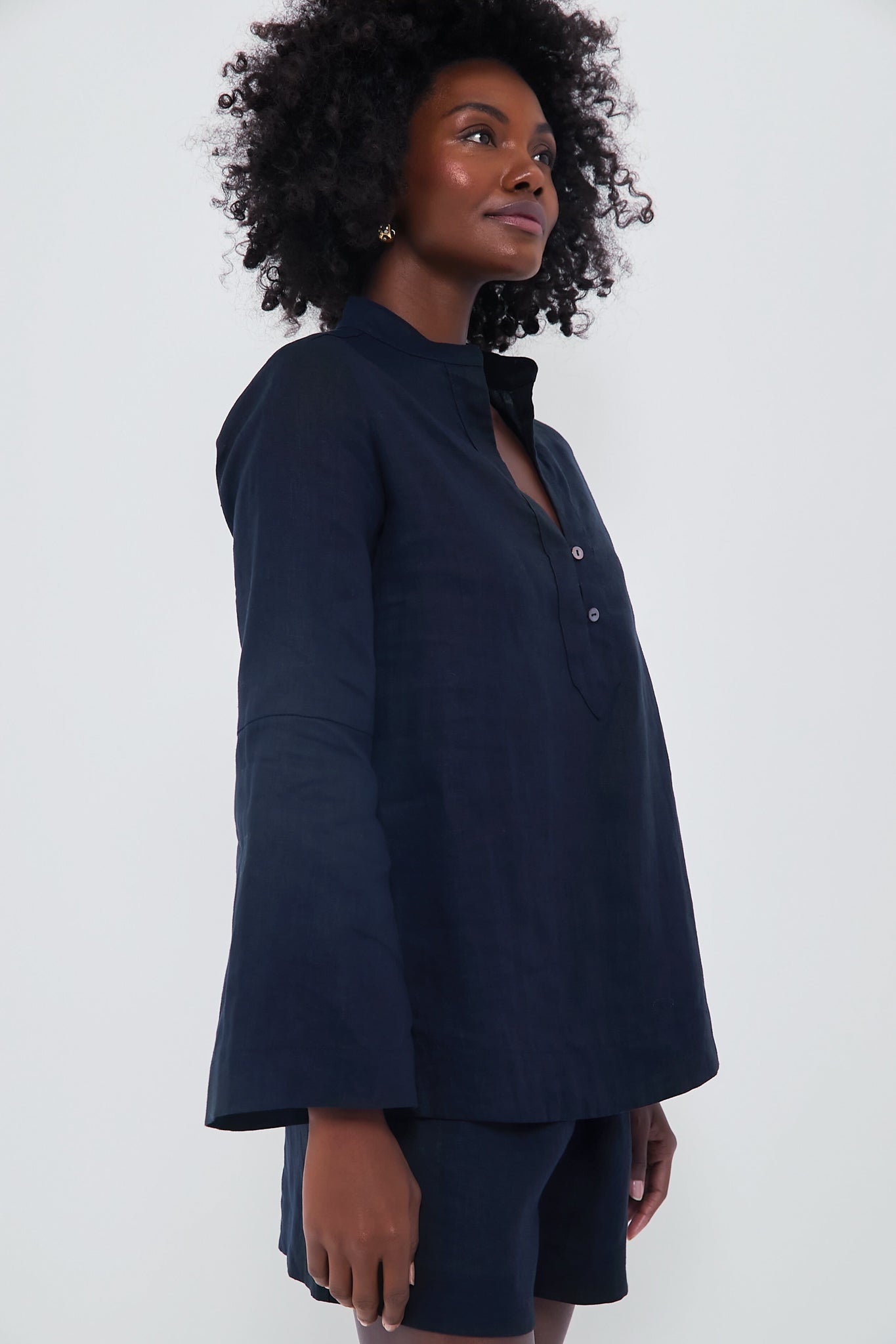 Meet your new vacation tunic because. as India says. “It's obvious why anyone would love this shirt.” We agree—breezy linen and a bell-sleeve have never looked so good. However. the star of this top is that you can unbutton for a revealing V-neck or button it up for a more conservative look. Wear it with the matching Navy Linen Eleuthera Shorts for poolside lounging. or as a separate piece with your favorite jeans.