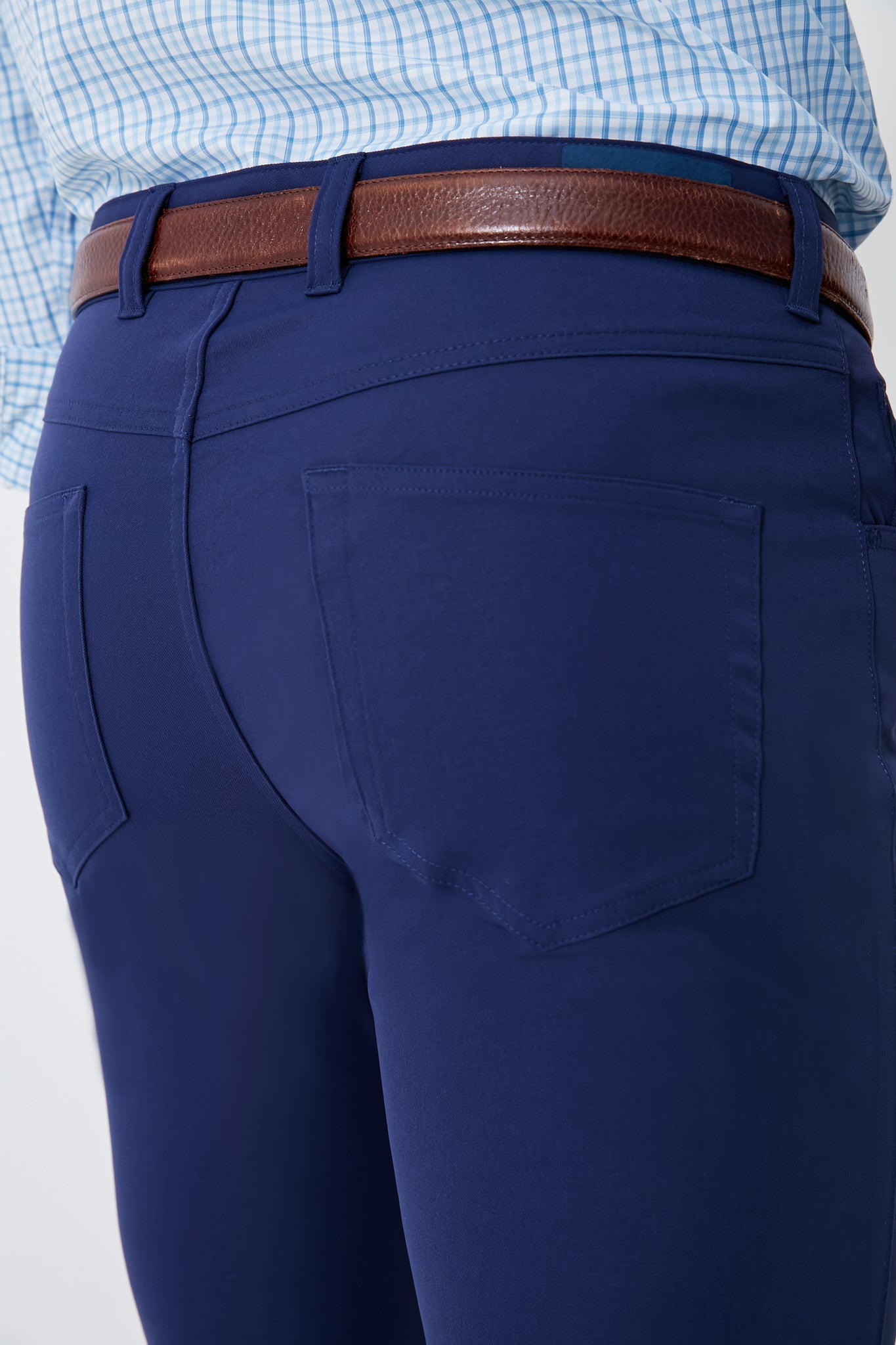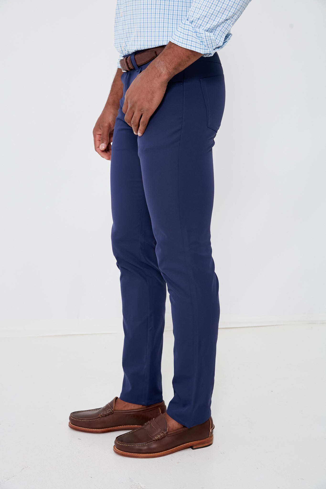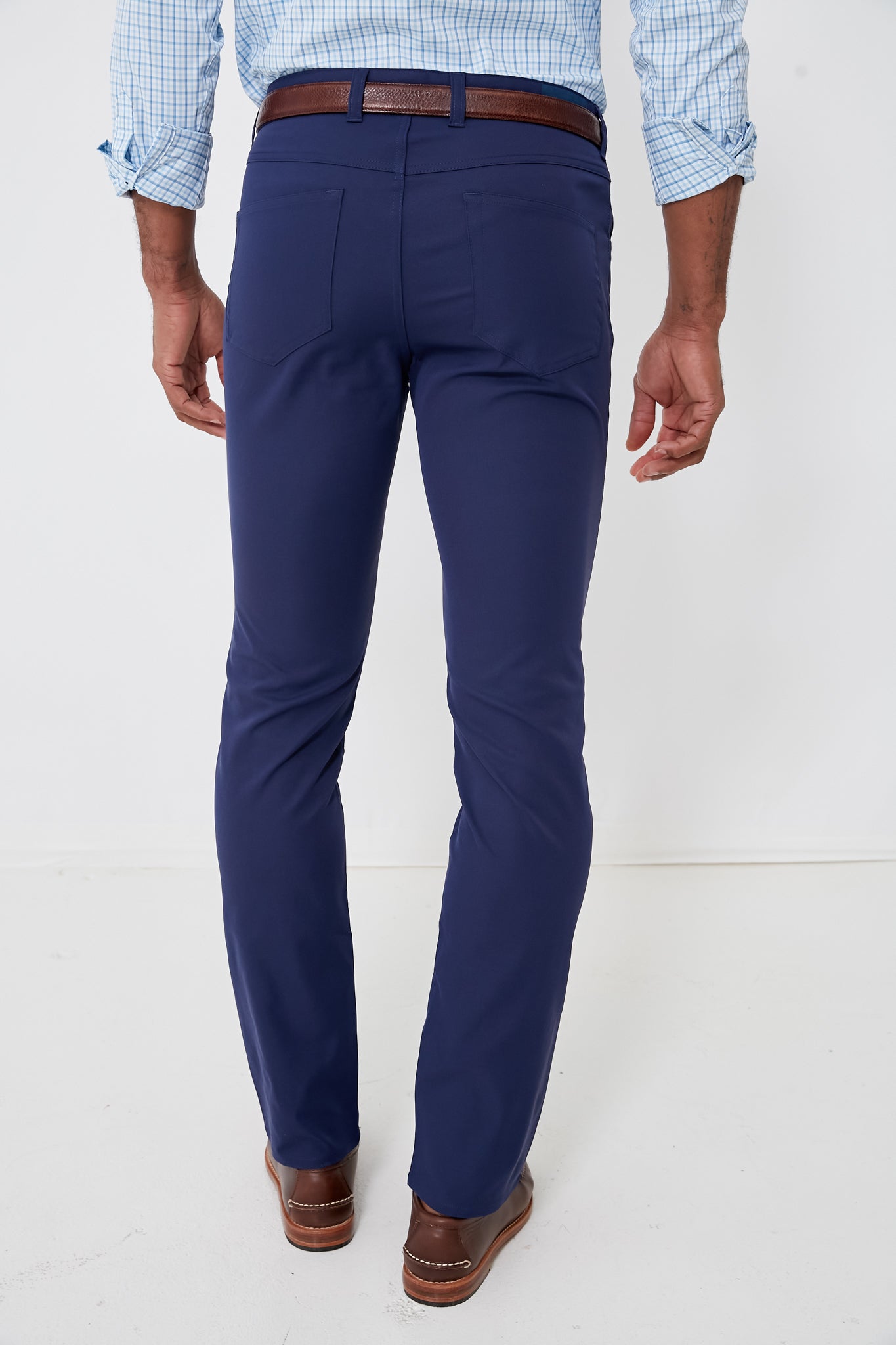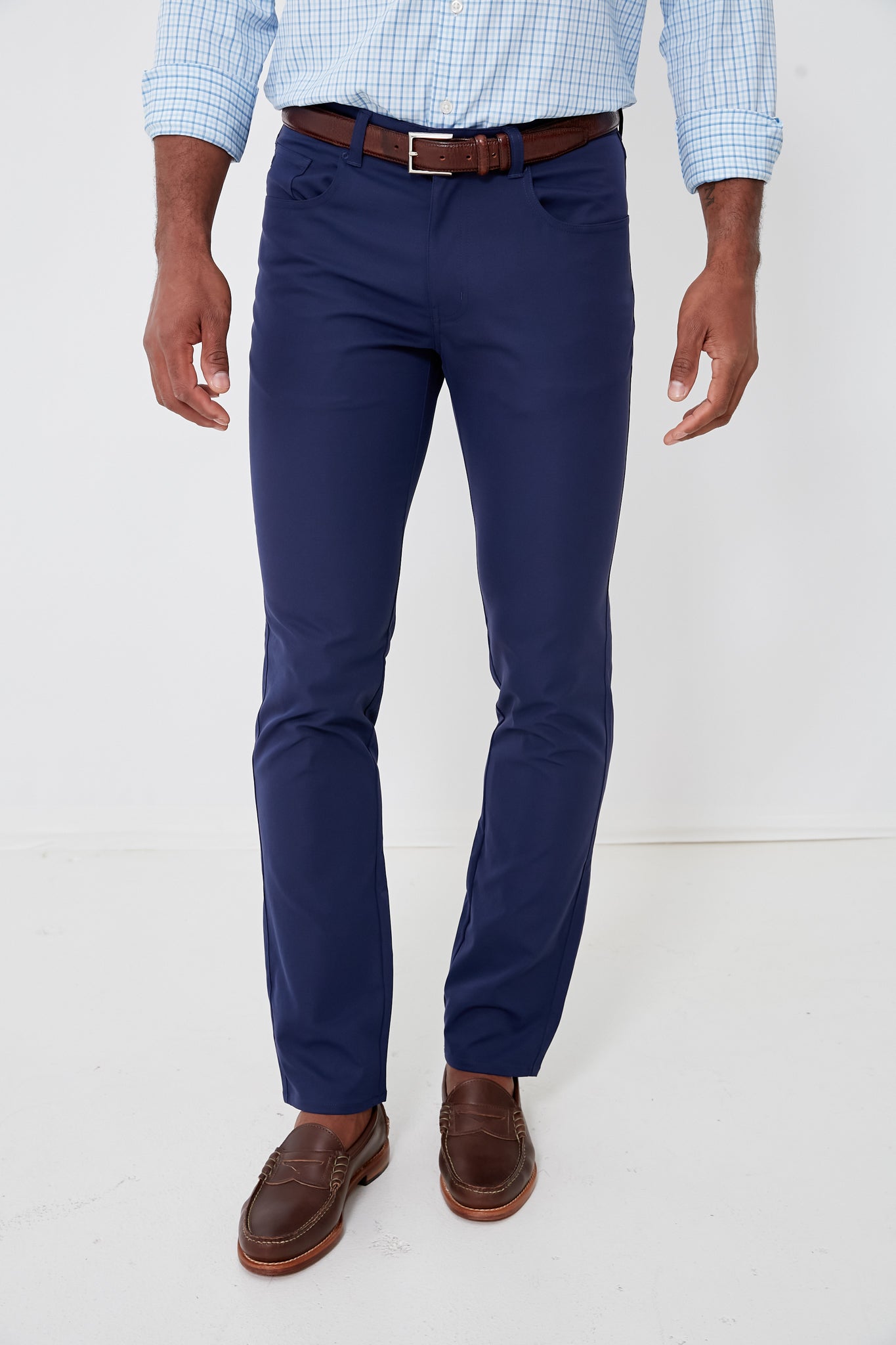 The Navy Five-Pocket Pant are a customer favorite season after season. Whether you're playing 18 holes or headed to lunch in town. these versatile performance bottoms are applauded for their unique combination of technical features. like two-way stretch. moisture-management. and easy care with a weekend-ready design. Add a henley and a vest and swap for a polo when the weather heats up!