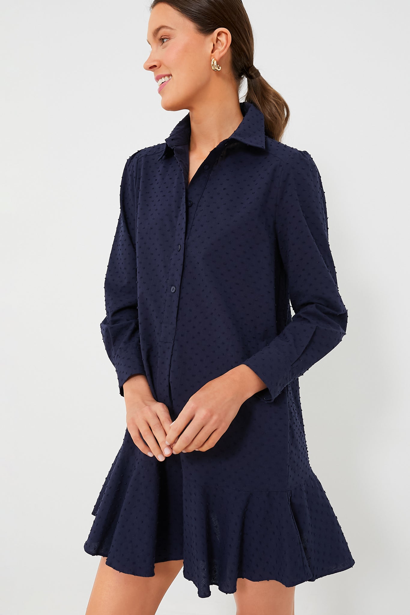 A sophisticated update to the closet staple shirt dress we love. the Navy Swiss Dot Callahan perfectly merges classic and trendy. This mini seamlessly combines functional details like invisible side pockets and a button front half placket with a flirty flutter hemline to create a style that encapsulates unfussy femininity. We are pairing this elegant piece with flats or sneakers for a casual look and switching to heels when the occasion calls for it.
