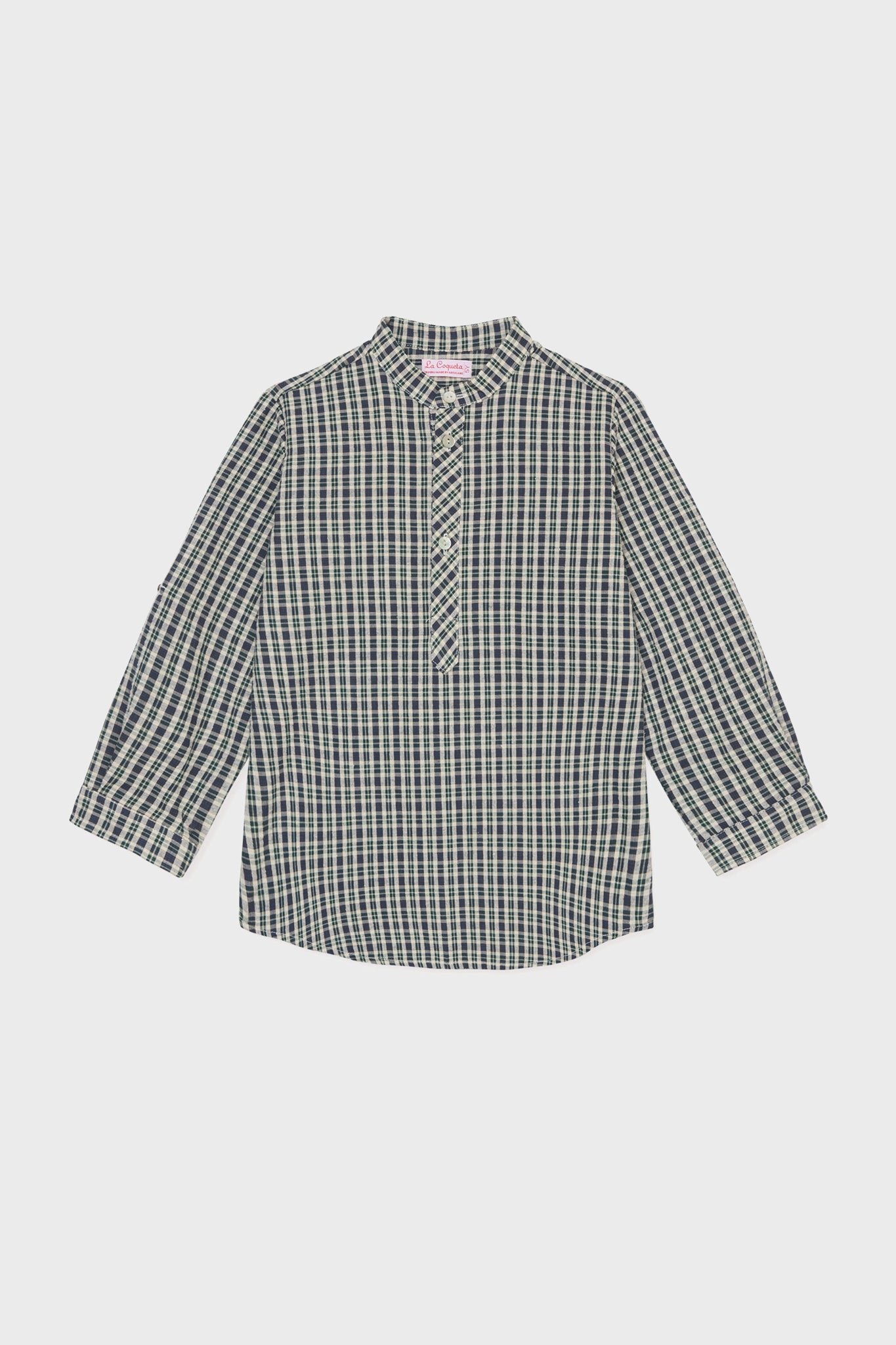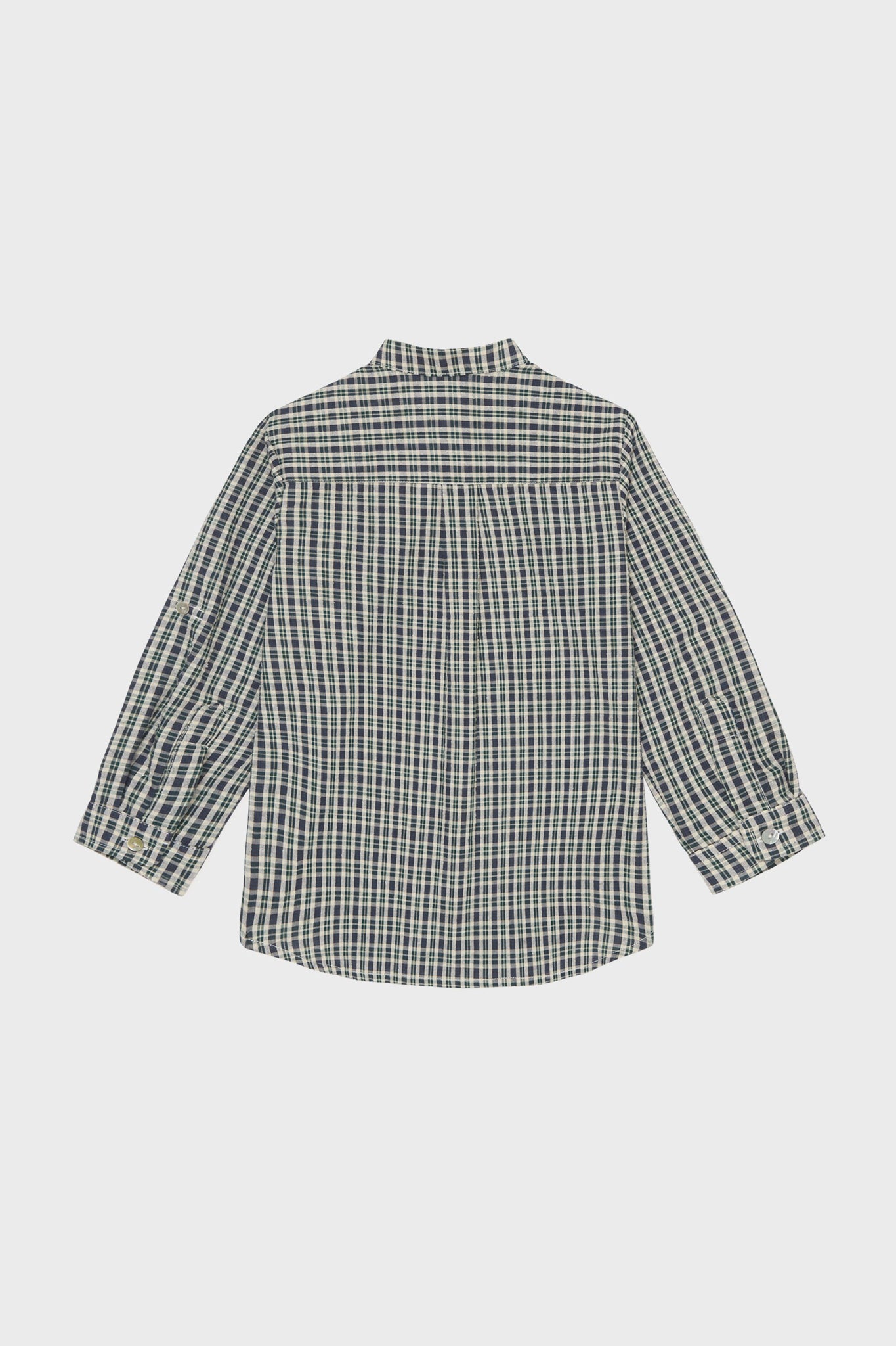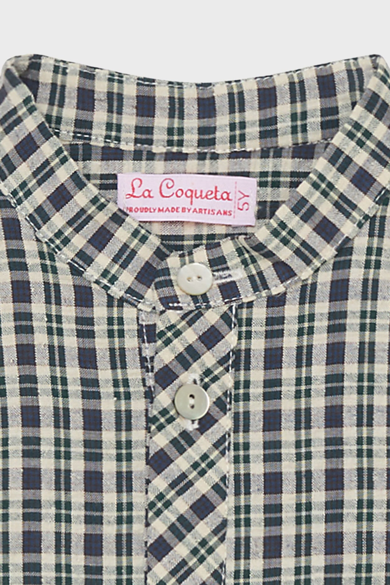 The Tartan Mateo Long Sleeve Boy Shirt is crafted from super soft cotton oxford and printed with a charming school-friendly navy blue tartan. It features a stylish mandarin stand collar. a classic long-sleeve popover silhouette with mother of pearl buttons. and a classic center box pleat for a relaxed fit that allows for a range of motion. perfect for little boys on the go. Perfect for school. special occasions. and anything in between. your little guy!
