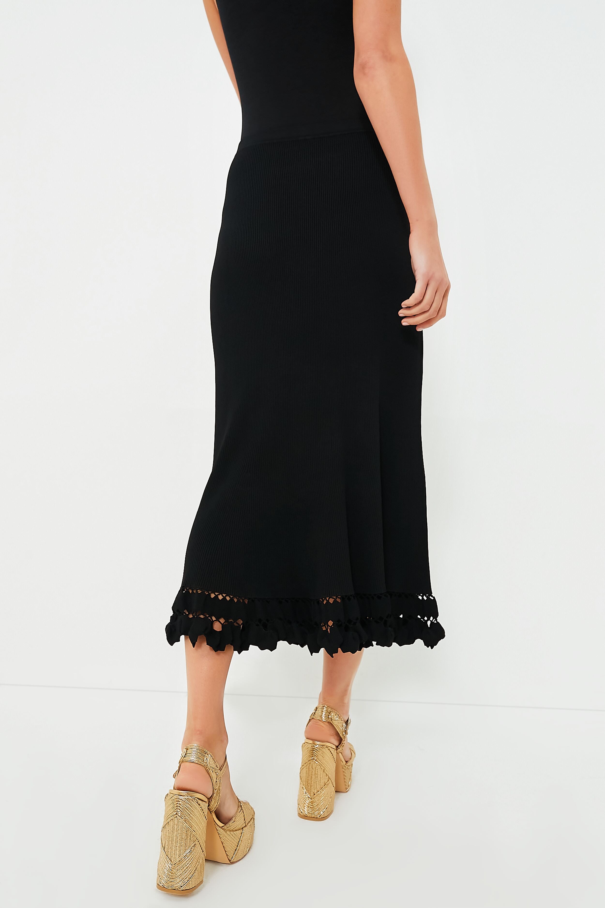 A classy staple skirt with an upgrade. the Noir Ayla Skirt is equal parts classy and fun. Spun from compact rib knit in a timeless black. it skims your silhouette and unfurls into a maxi hem adorned with hand-crocheted trims inspired by tulips. Pair with the Noir Esma Top and heels for a chic set.