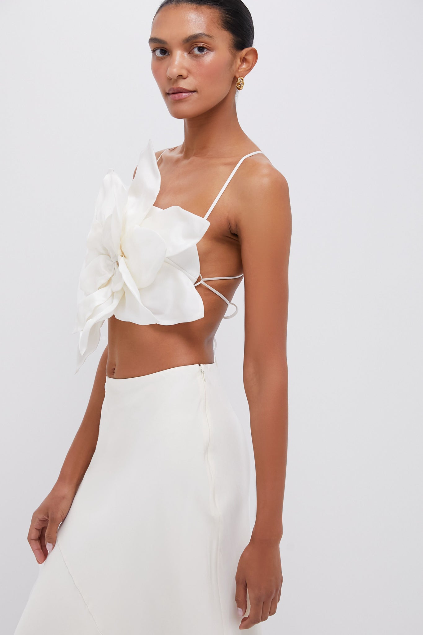 The Off White Amor Eterno Top is a delicate silk satin organza top with an criss-cross open back. With its flower-shaped design. it adds a romantic and ethereal touch no matter how you style it. We are pairing it with white denim and sandals. or with a silky skirt and heels for an elevated look.