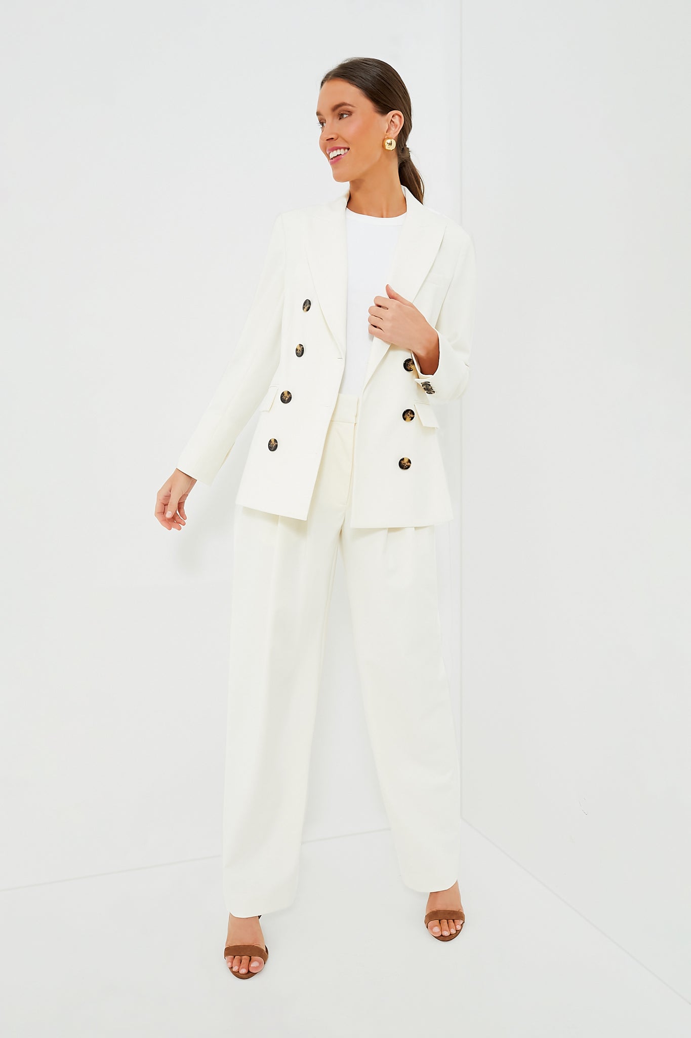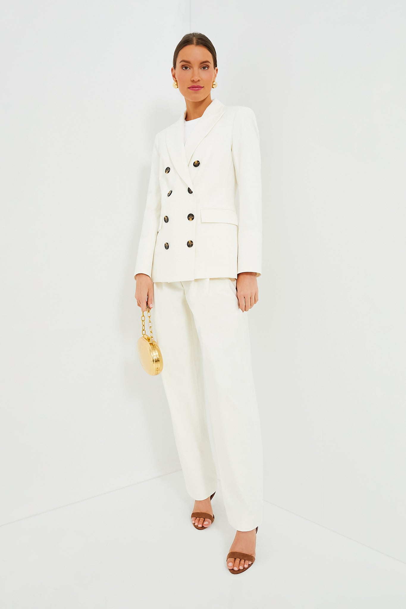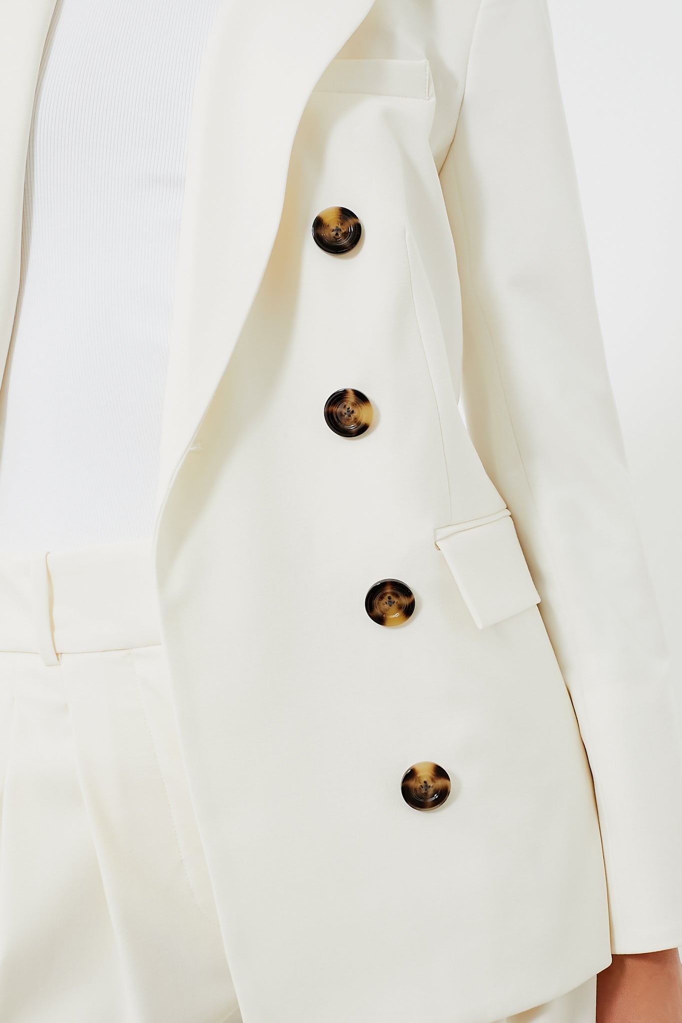 The Off White Fevre Dickey Jacket is a timeless staple you'll come back to season after season. year after year. Expertly tailored in a lightweight suiting fabric. this double-breasted blazer features an elongated silhouette that ensures all-day comfort. Complete with wide notched lapels. padded shoulders. flap pockets and tortoiseshell buttons. we love to style these with the coordinating Lagarde Pants for a power-suit moment or with a jeans and heels for a sophisticated yet effortless ensemble.