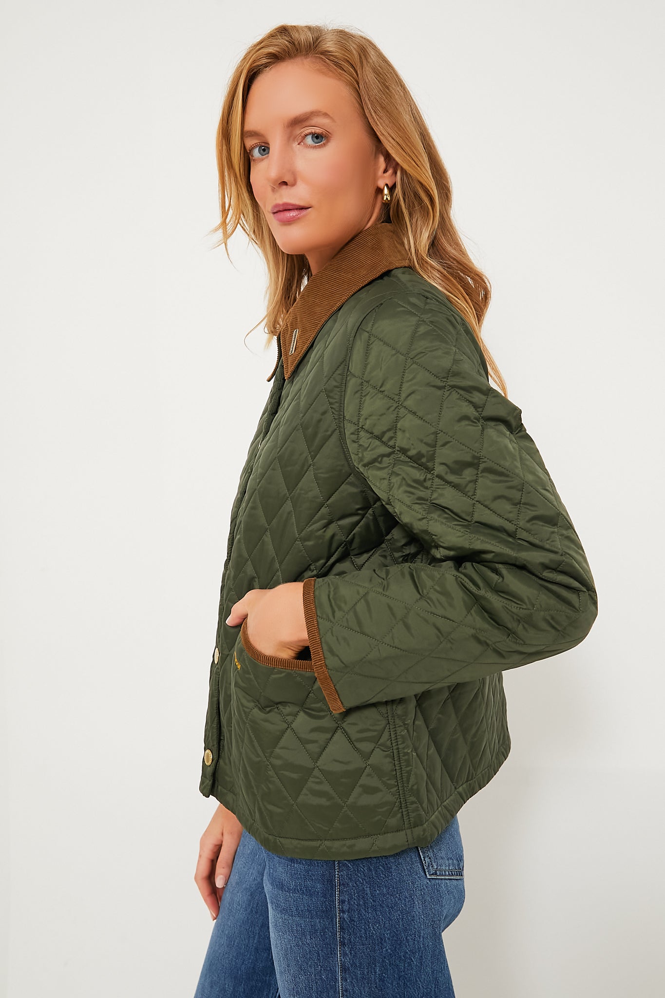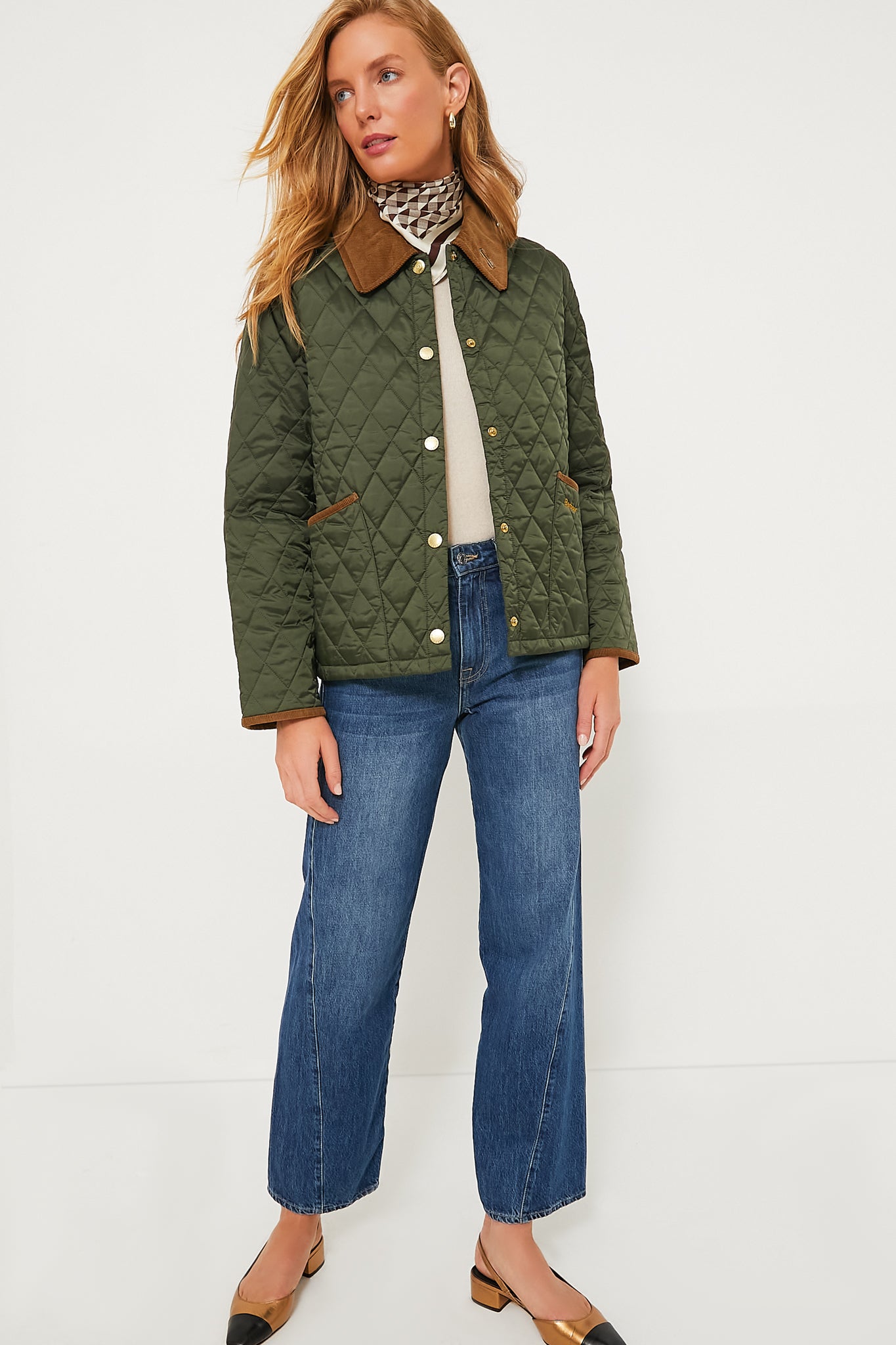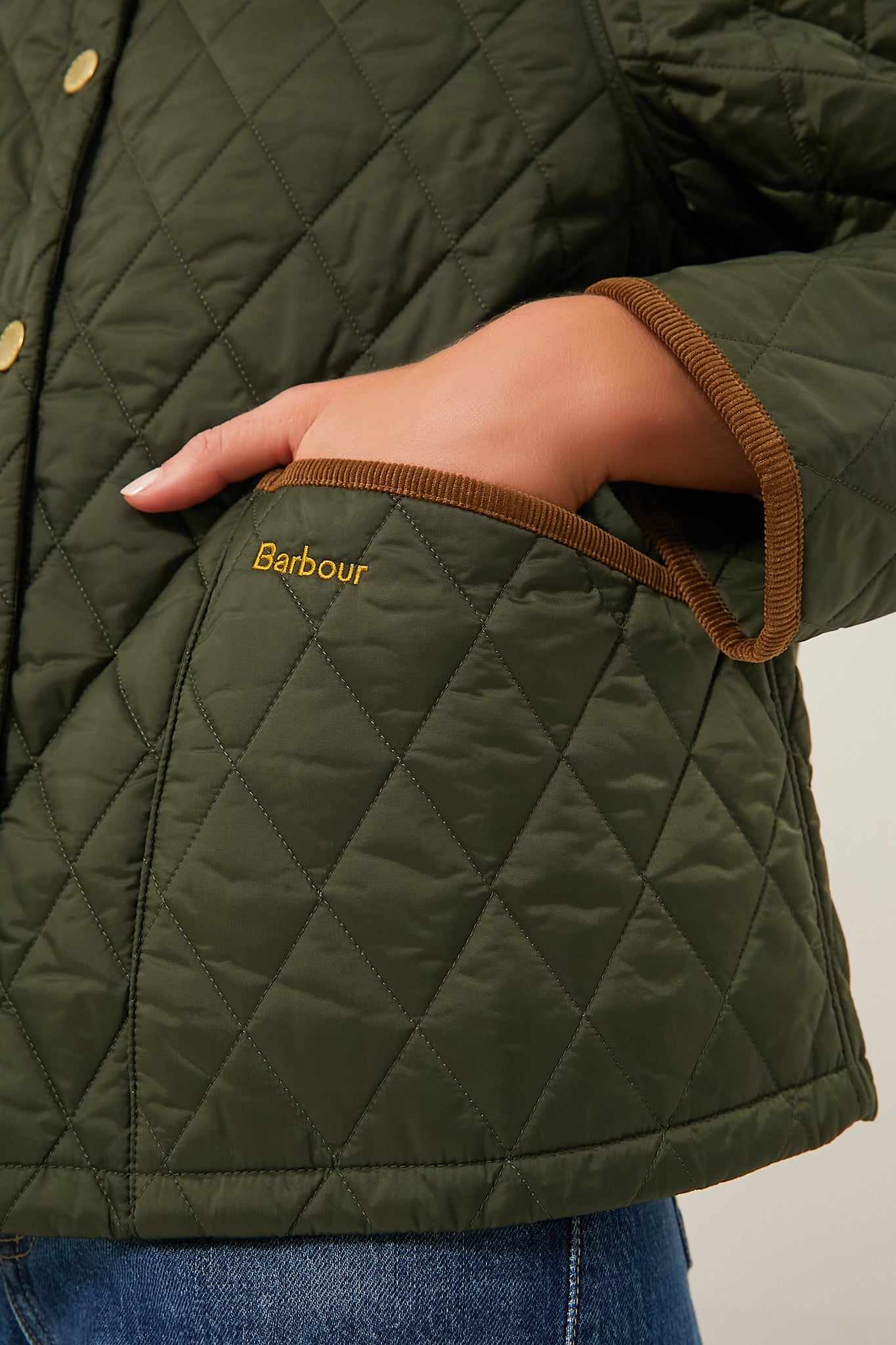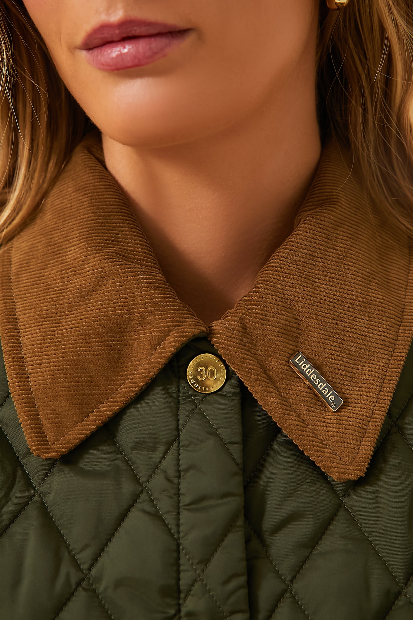 Boasting a relaxed - cropped fit with a contrast cord collar and trims. this Olive 30th Anniversary Liddesdale Jacket features practical side pockets. gold-tone buttons and complete with a plaid lining for a playful touch of print. Whether you're in the city or exploring the countryside. we are wearing this piece with denim. and boots for a stylish yet warm look.