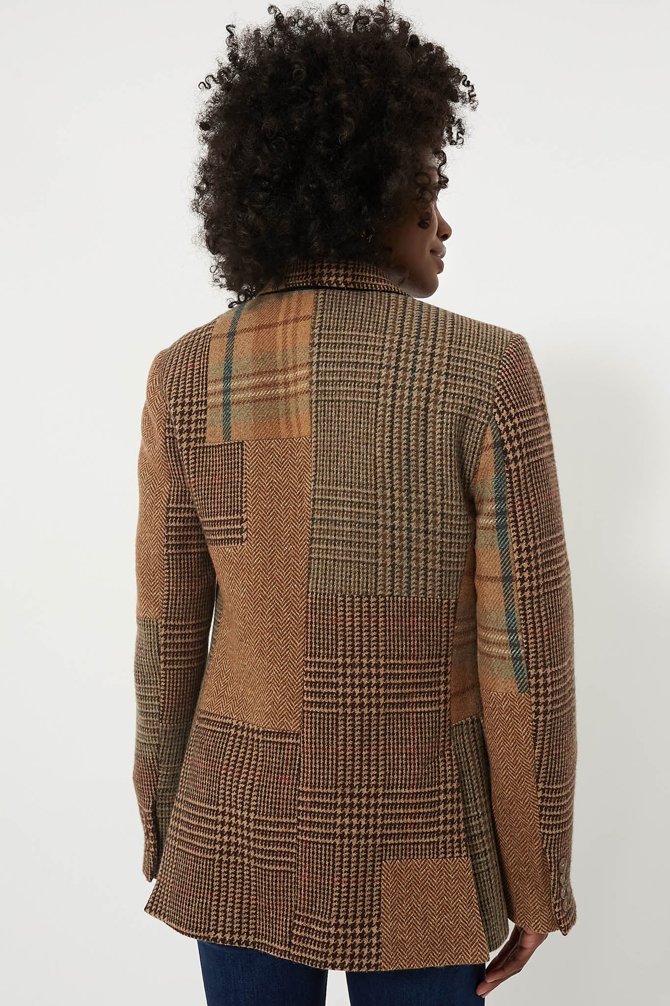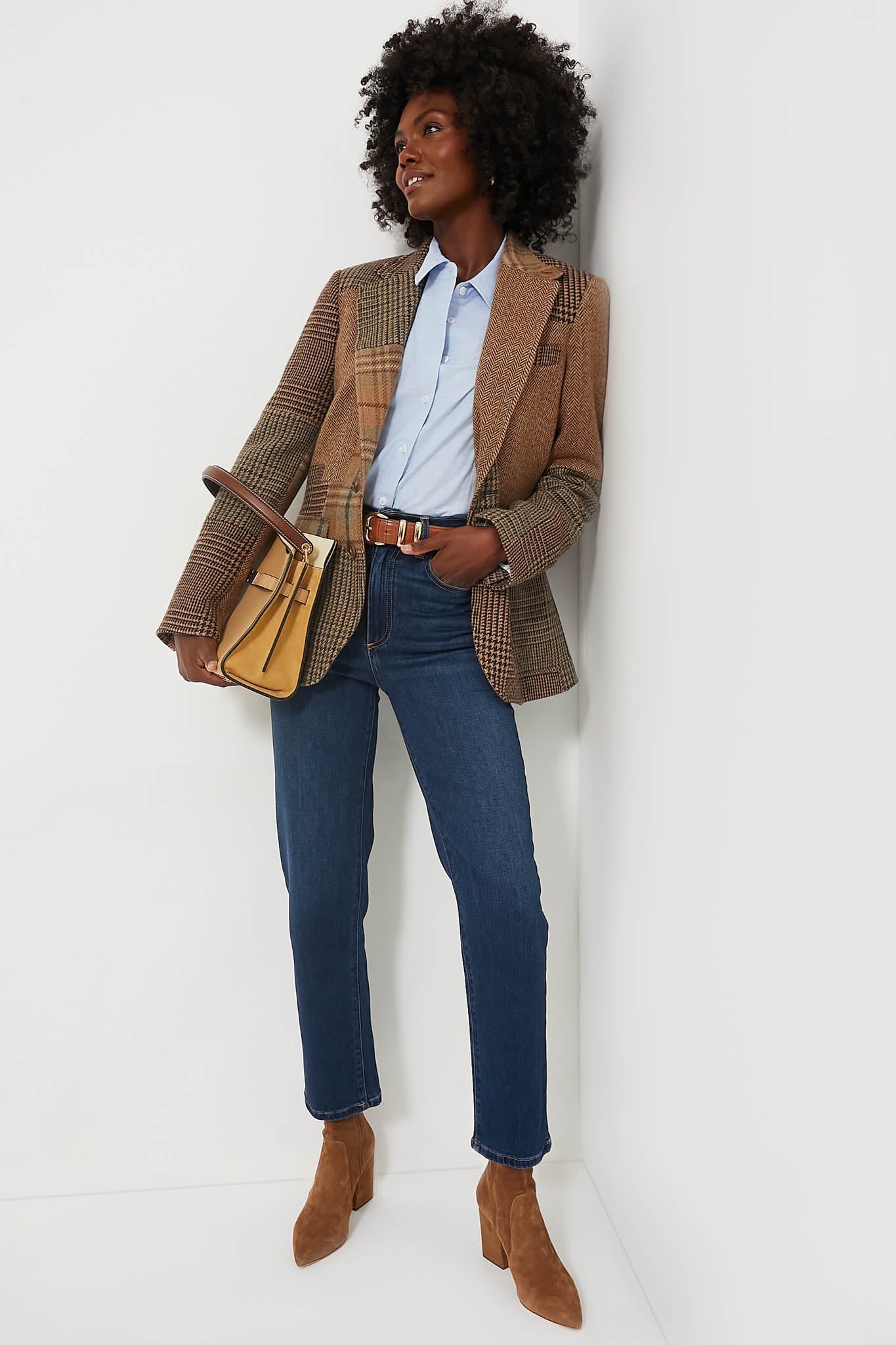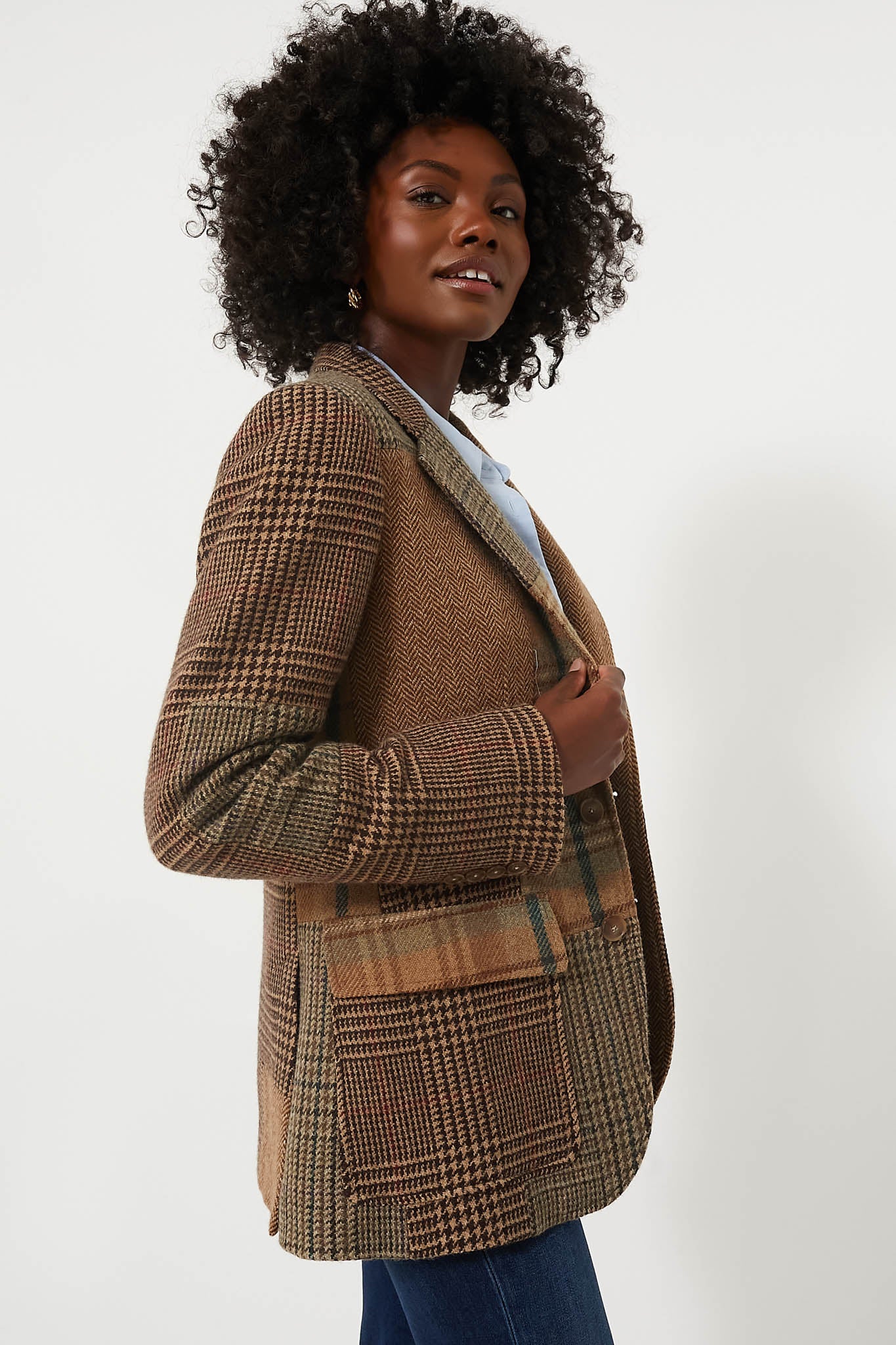 The Olive Brown Heritage Blazer is a timeless statement piece that will live in your wardrobe for years to come. Constructed with a patchwork motif featuring herringbone tweed and mixed plaids. this single-breasted blazer is tailored in wool-blend tweed for a slim silhouette. Complete with flap patched pockets and an interior chest pocket for your small everyday essentials. we are styling this sophisticated silhouette with a tee and denim for an ensemble fit for any occasion!