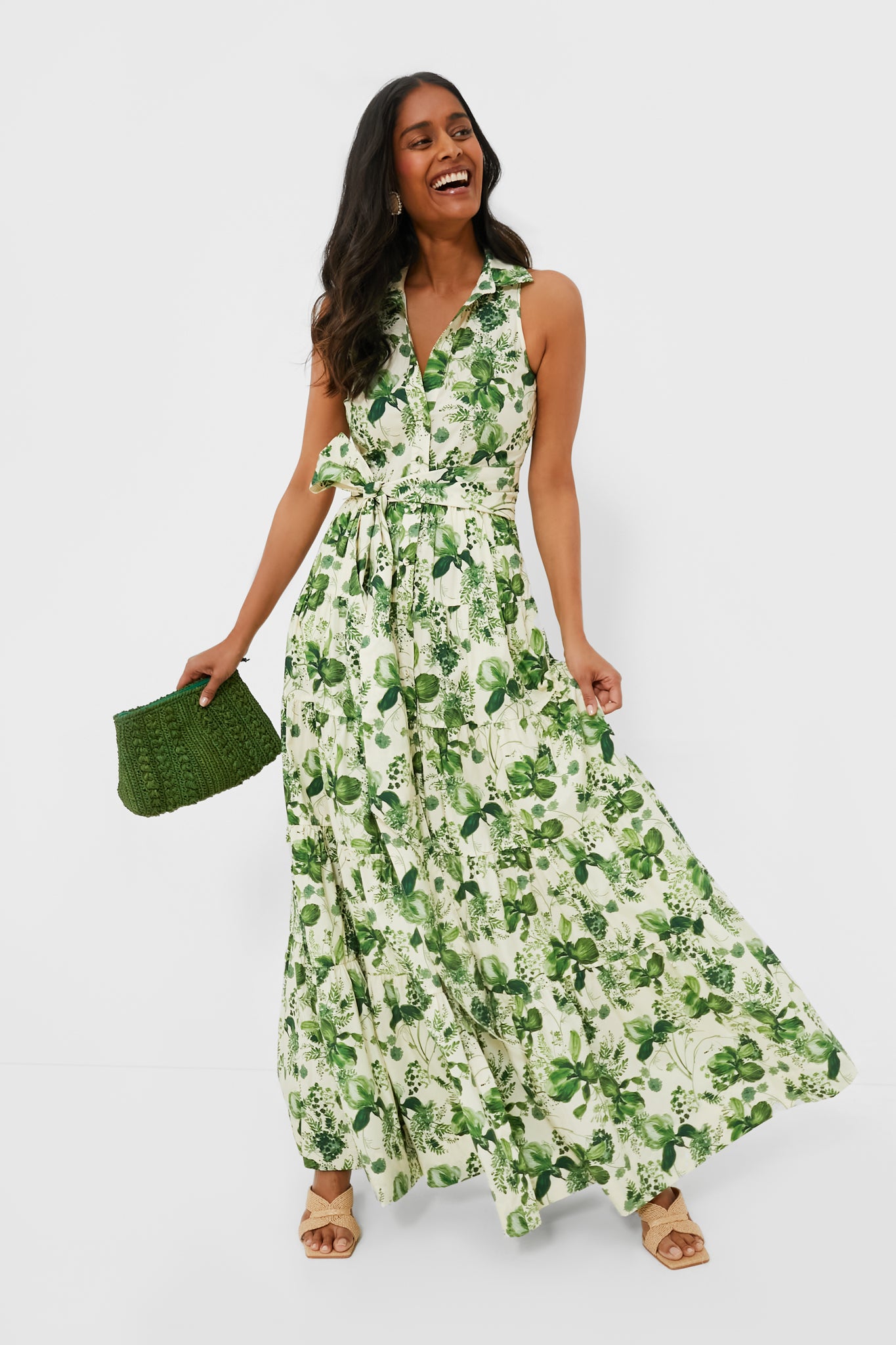 The Olive Hanging Orchids Adriana Dress promises to make you stand out in both comfort and style. Featuring a sleeveless shirt dress silhouette with flowy five tiered maxi skirt and a self-tie belt to cinch your waist. it makes the perfect “guest of” dress. We love to pair it with heels. clutch. and gold jewelry for an effortless look that works well for luncheons. baby showers. and cocktails..