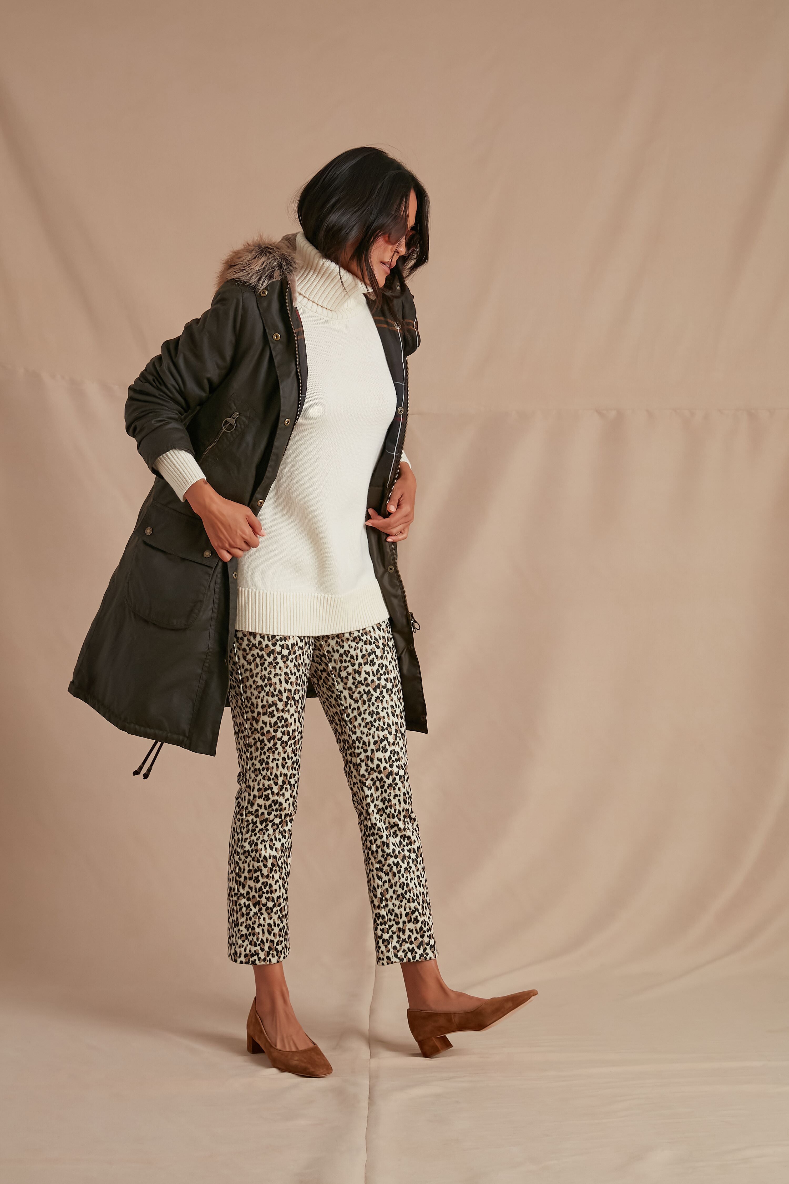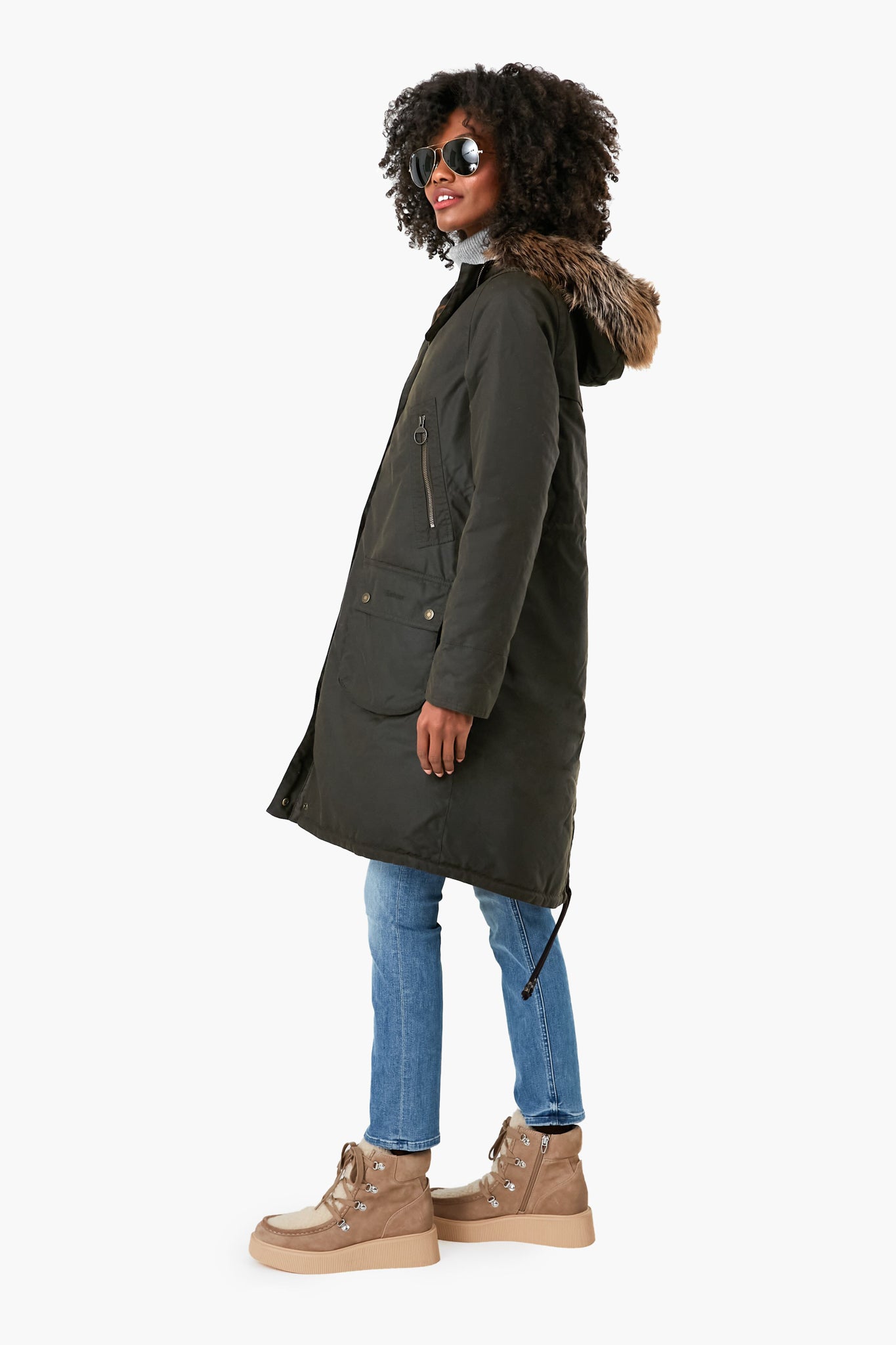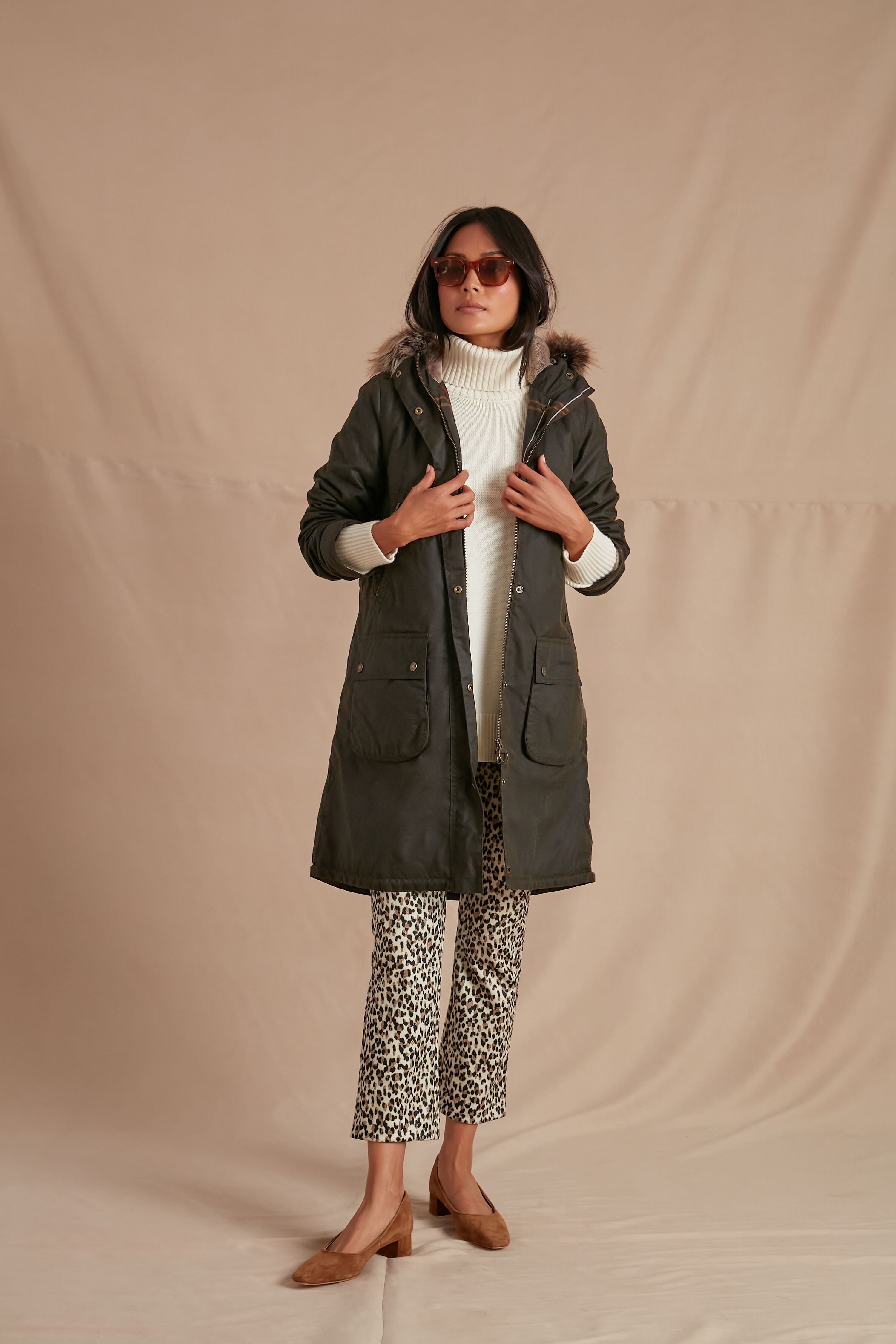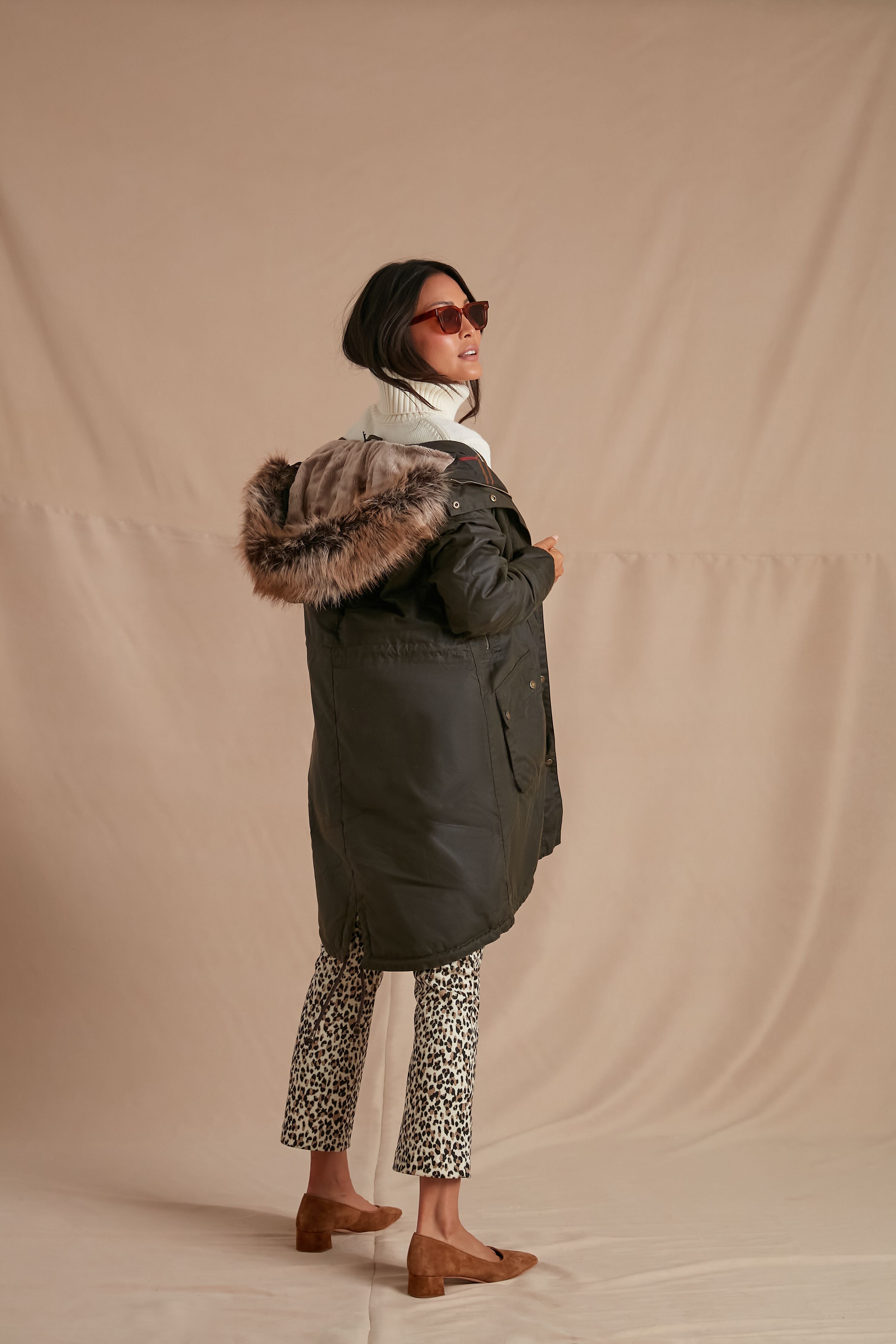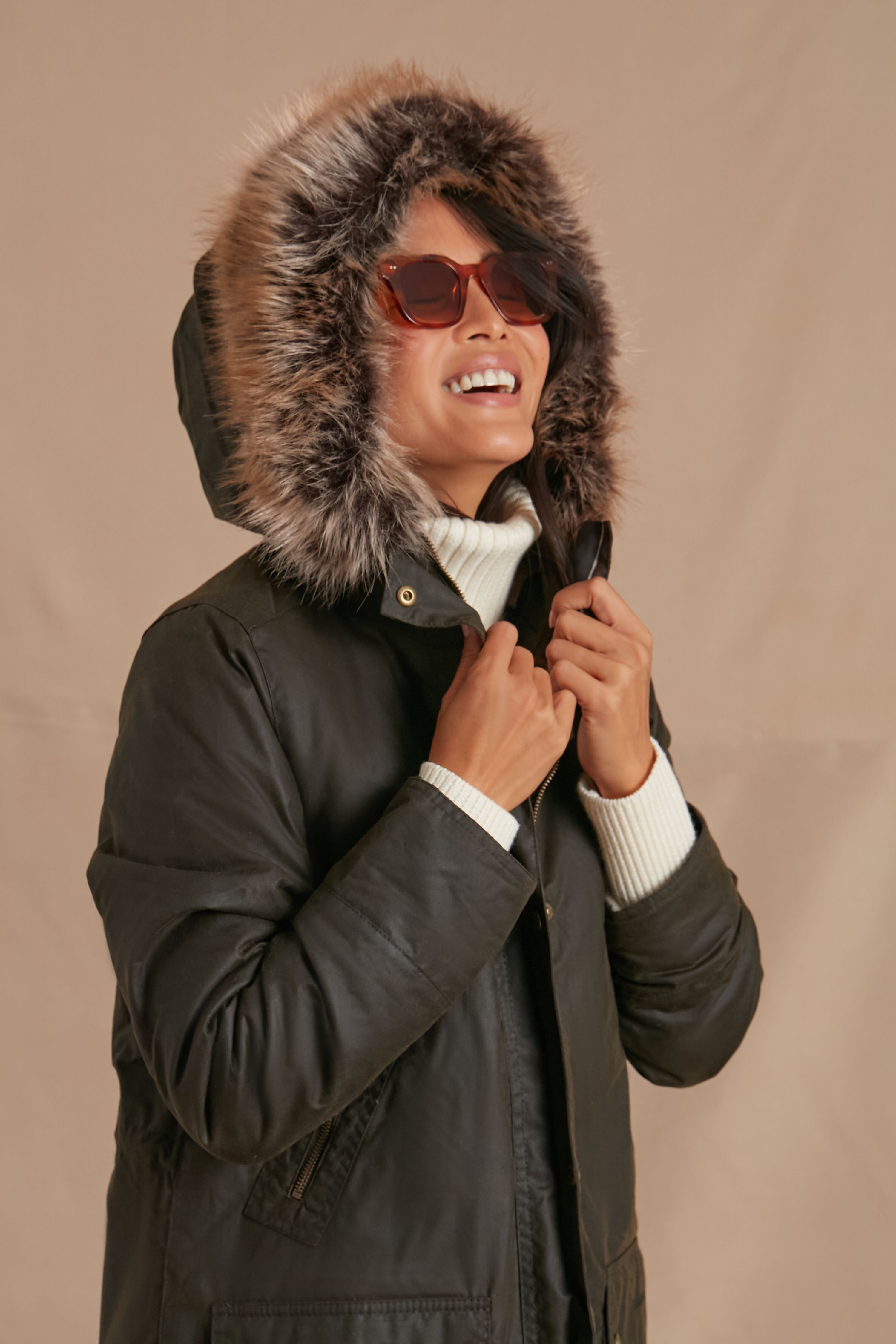 The Olive Stavia Wax is a timeless design. crafted from waxed cotton in a longer length for absolute comfort and warmth. With a luxe yet ethical faux fur trim at the hood. this jacket exudes an authentic country feel but blends it with contemporary style. Lined in a signature tartan at the body. and a sherpa lining at the hood. this is sure to become a favorite of yours when paired with chic boots and a scarf.