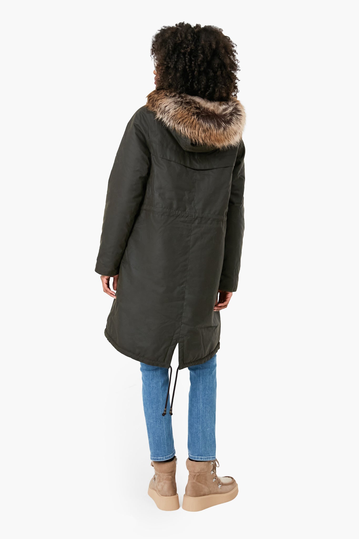 - Faux fur trim at hood