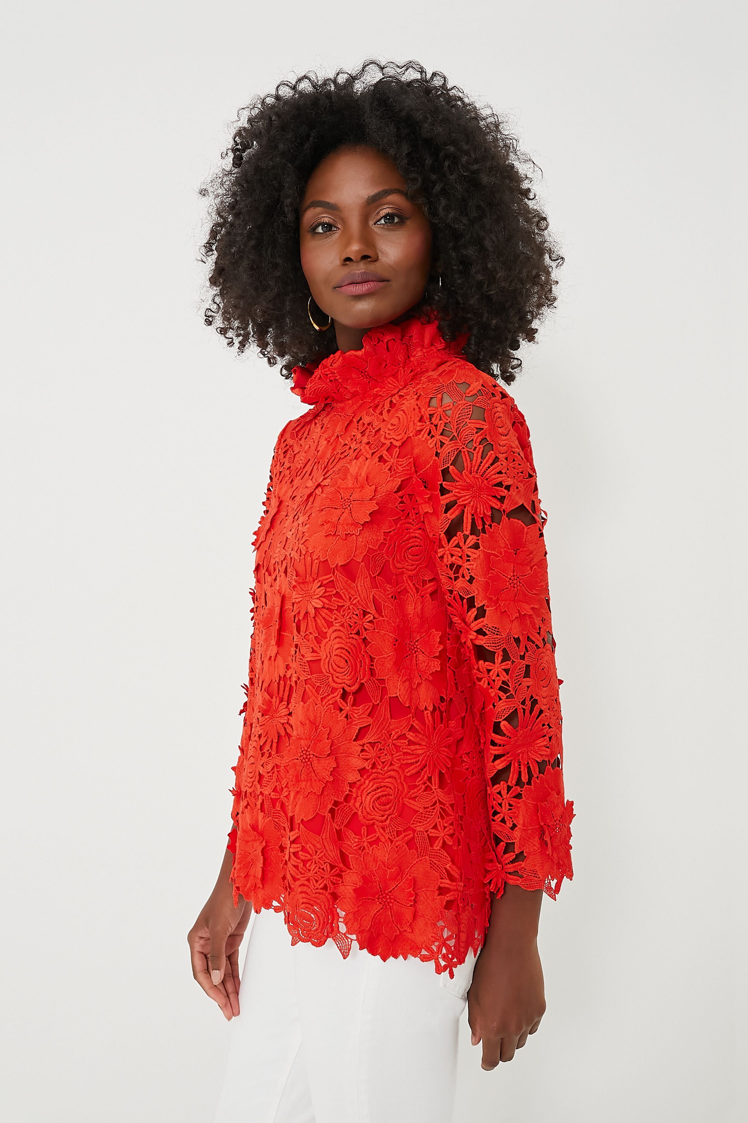 A Morningim style staple. the Faye is back and better than ever. Our design team spent months perfecting and testing our signature stand collar to get it just right. As Marvin Gaye once said: "Ain't no collar high enough." so bring on the ruffles and drama! Updated in a beautiful guipure lace fabric. this swing shape blouse reminds us of our favorite mod silhouettes from the 60s and 70s. Ready for dinner celebrations with family. cocktail parties with friends. and every social event on your calendar. the occasions are endless for this bow tie-back top!