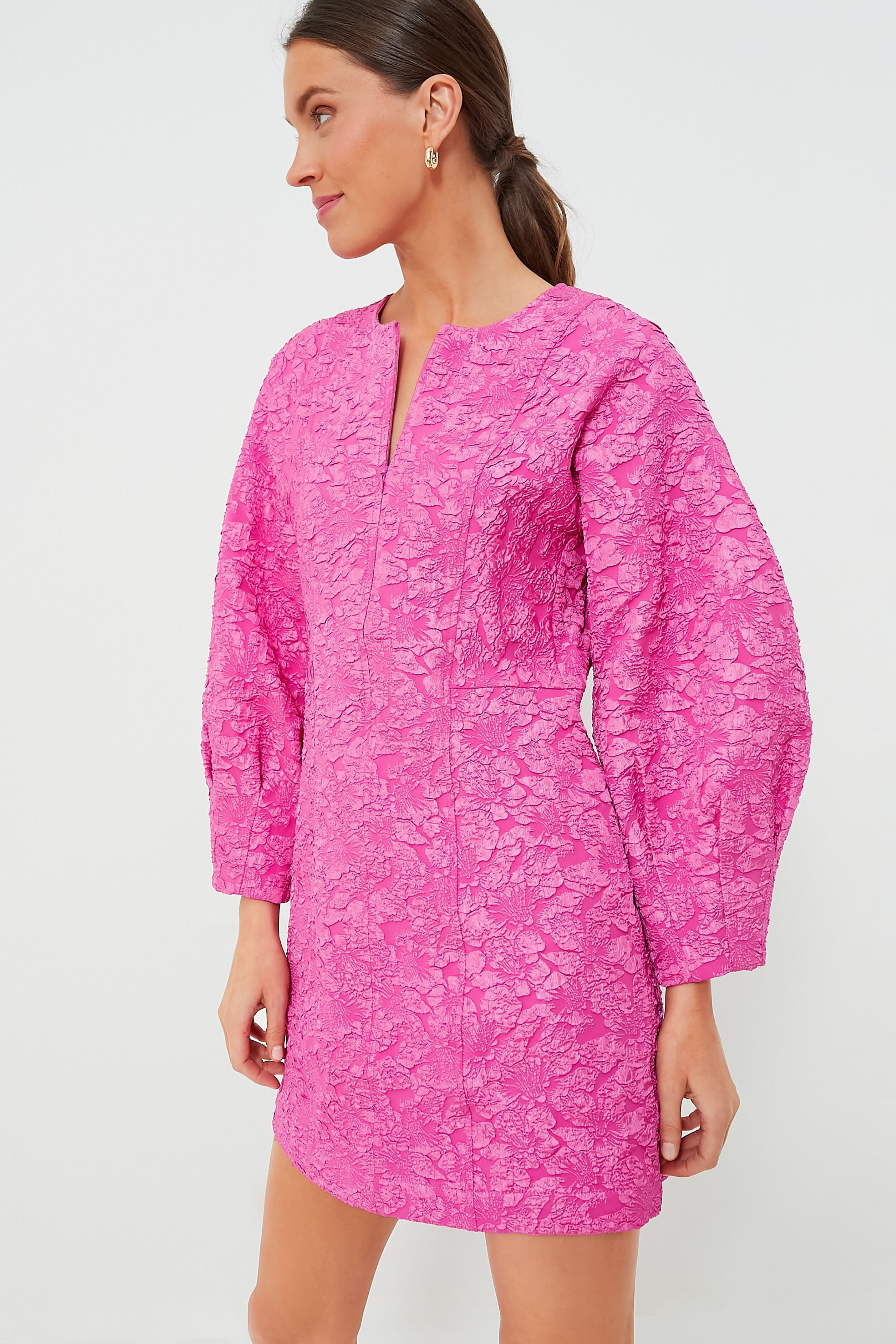 Come on Barbie! The Rose Violet Amyra Dress is a fun. feminine mini in a vibrant hot pink color. Boasting a front zip closure. balloon sleeves. and a textured fabric. this flattering style will turn heads at your next function. Pair with silver heels and drop earrings for the ultimate party look.