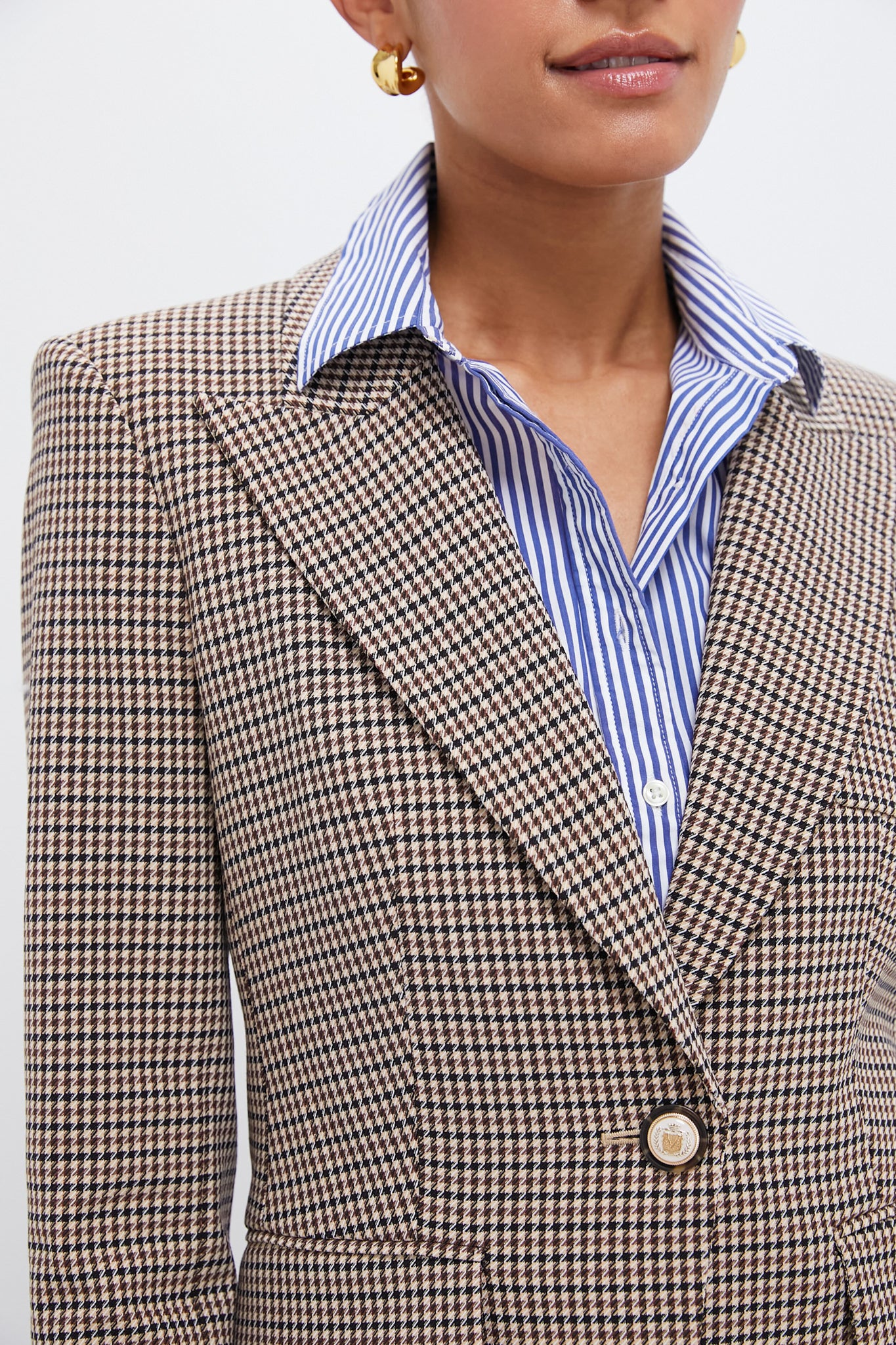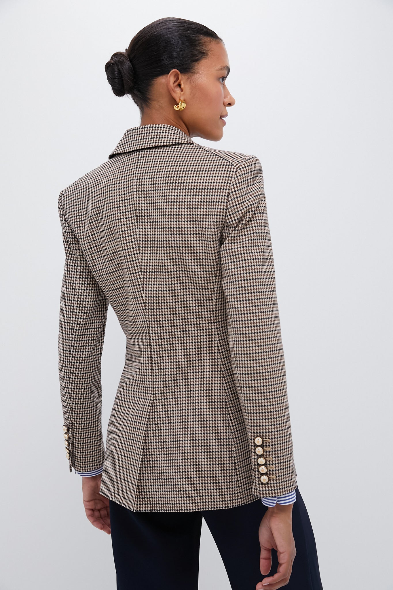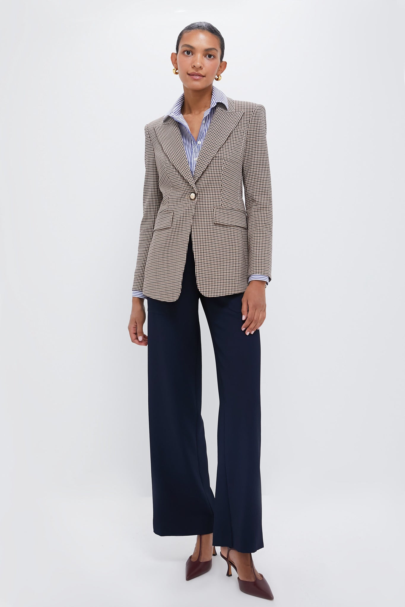 Featuring a micro houndstooth print. the single-breasted Livvy is tailored for a relaxed. elongated fit. A wide peak lapel and flap and patch pockets complete the look. Pair with trousers or jeans. flats or heels. and your go to bag!