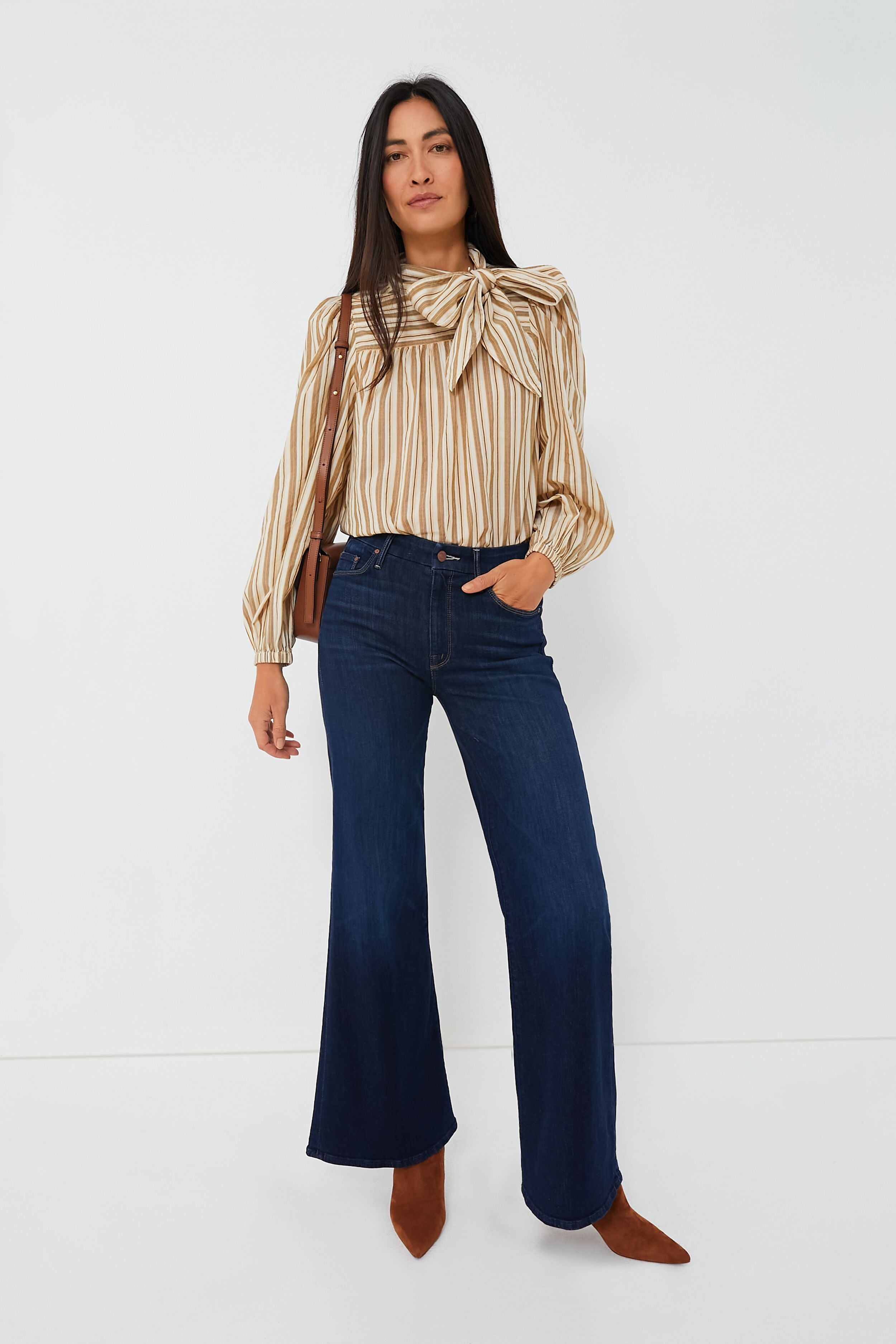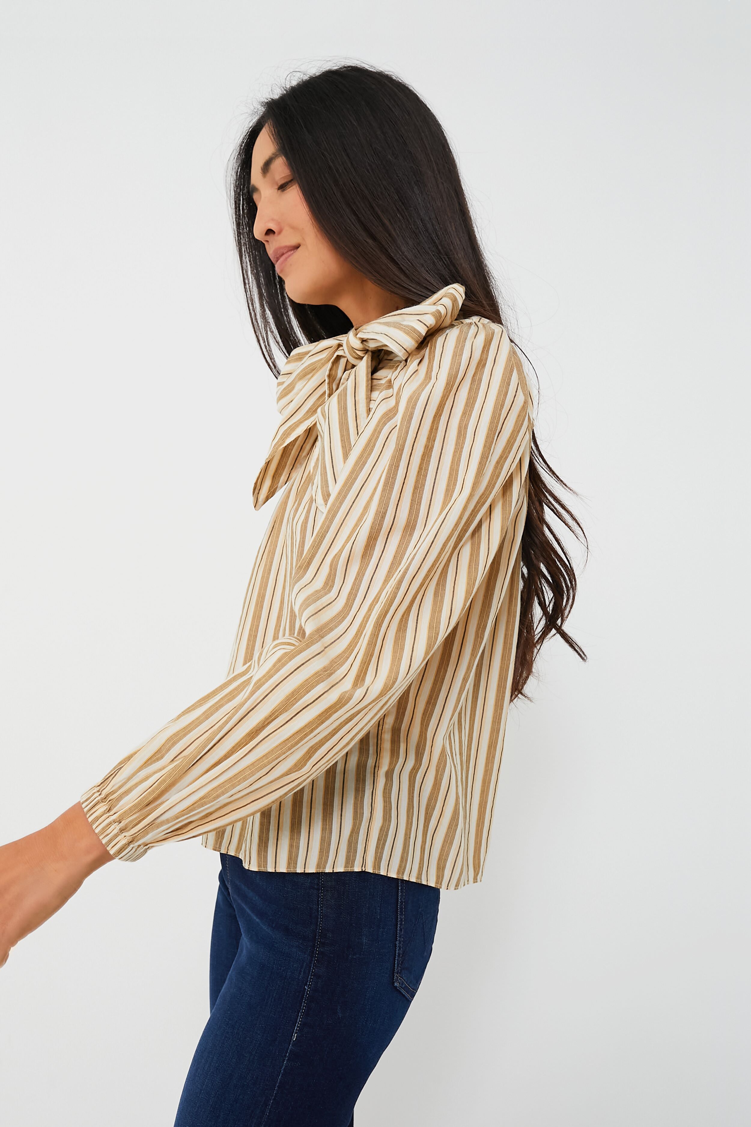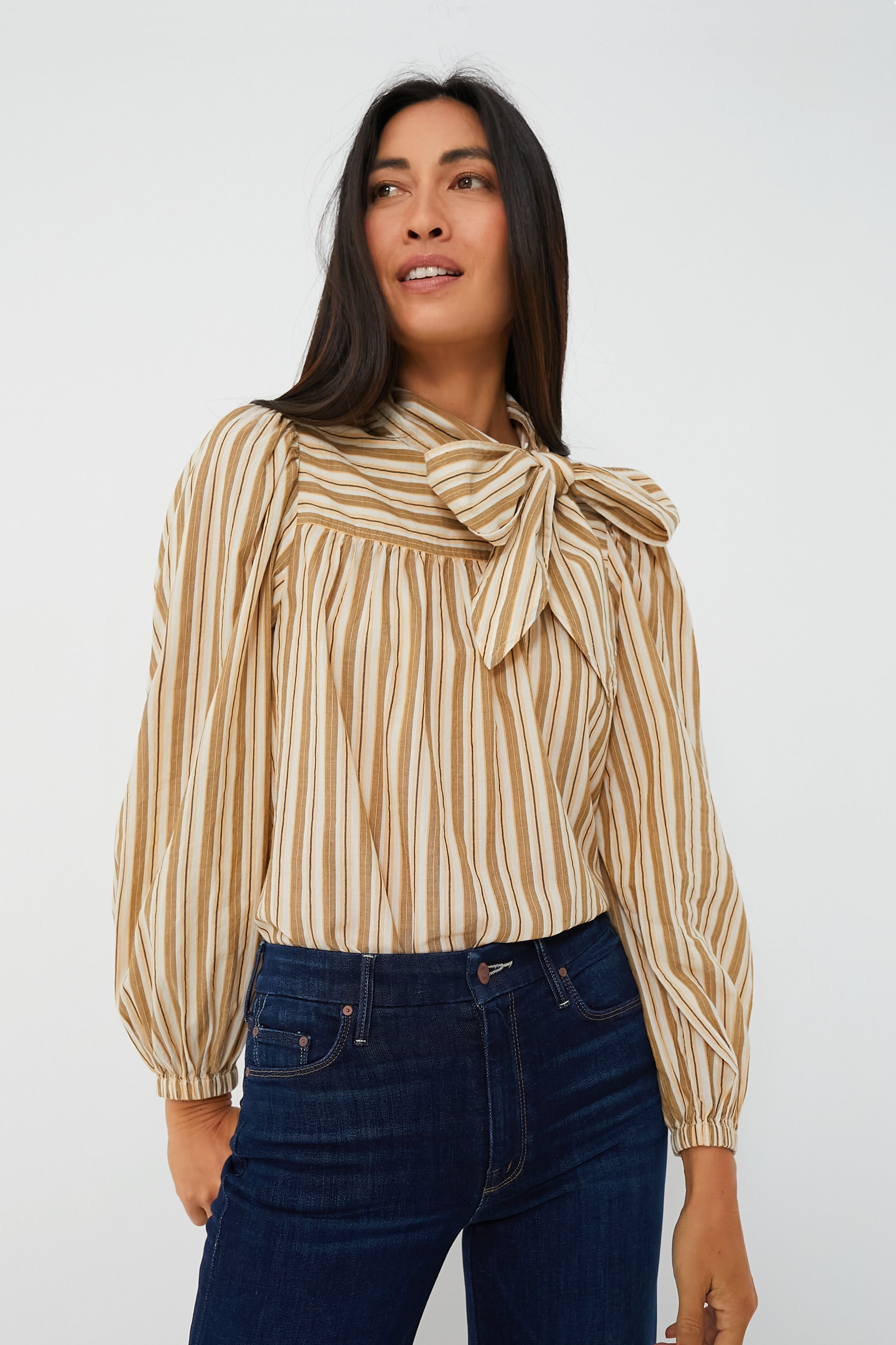 Now that's what we call chic! The Sand Opal Blouse is made from lightweight. hand-loomed cotton shirting with muted cream. tan. and black stripes. as well as a mock neckline complete with a dramatically feminine bow and billowy blouson sleeves. It pairs well with all of your high-rise favorites — we love styling it with wide leg jeans and gold jewelry for a retro lunch date look. or with trousers and loafers for an in-office meeting.
