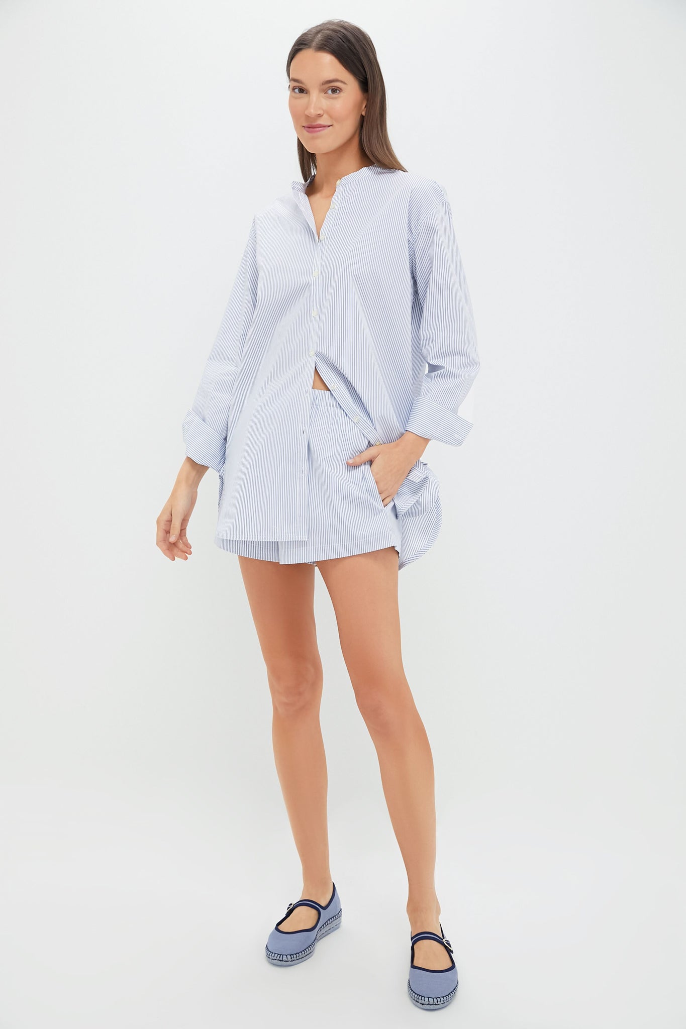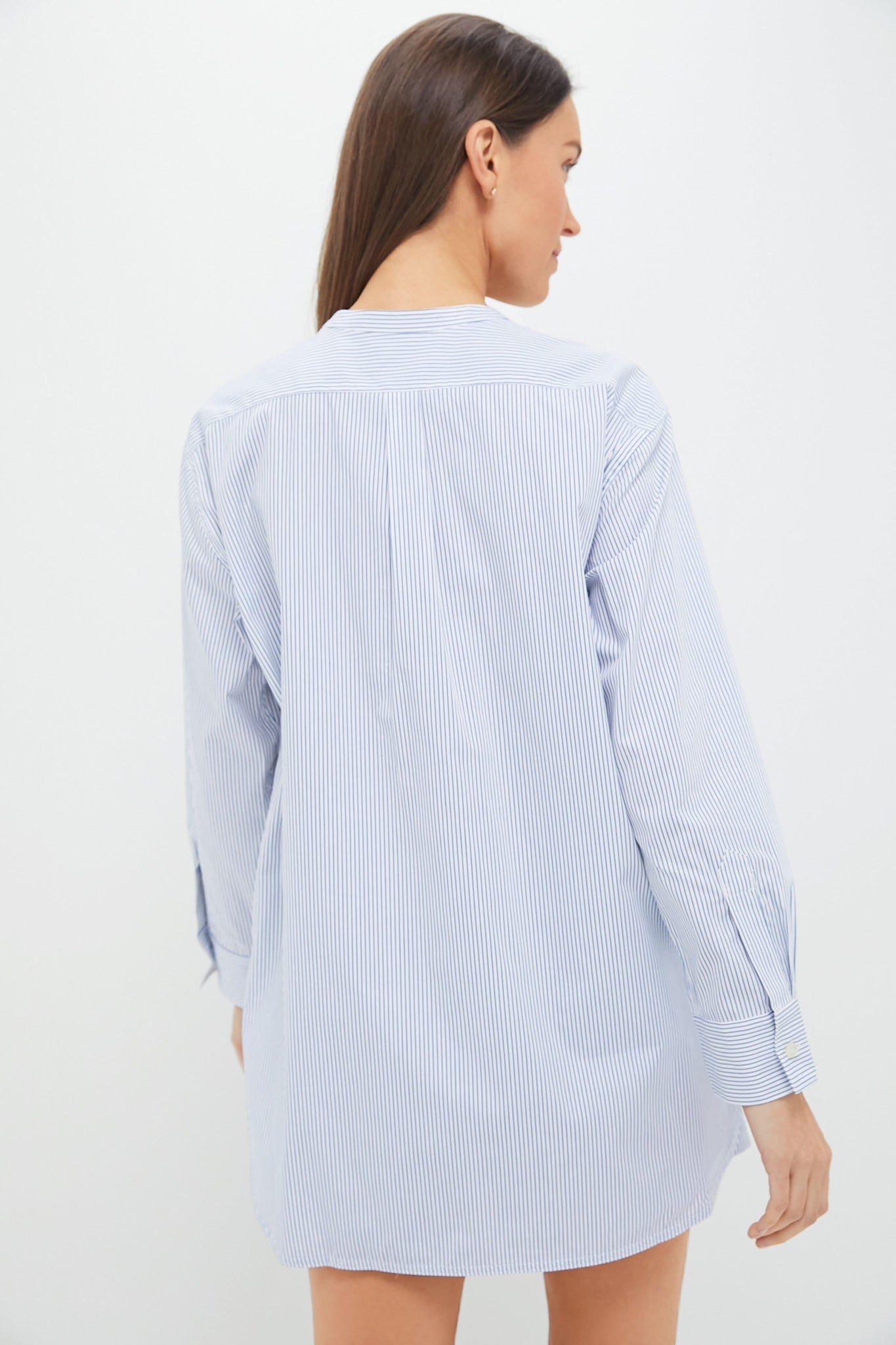 Cut in a timeless striped Yoshi Cotton Twill. The Yoshi Collarless Button Down features a classic grandad collar. full length sleeves. and a slightly elongated length. From desk to dusk — we're wearing this to the office with chic knits and then to bed with the matching Seaside Stripe Yoshi Boxer Shorts!