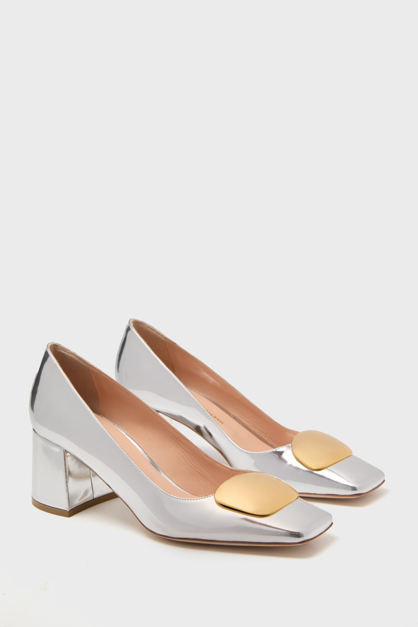 Make a statement in the Silver Mirror Naxos Heels. These chic beauties boast a square toe and gold pebble detail on a comfortable splayed block heel. Perfect for special occasions or just to dress up an everyday look. we are pairing these with wide leg denim. LBDs. and flowy maxi skirts!