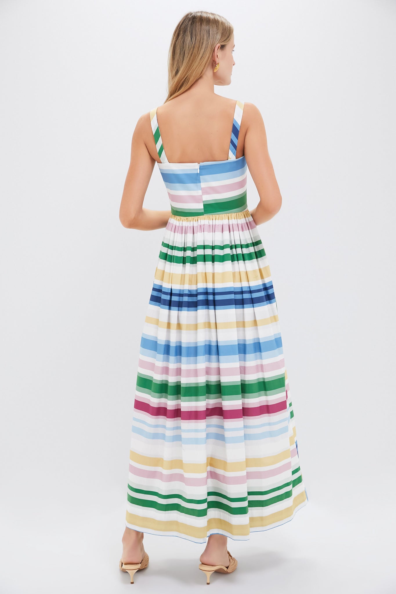 The Sofa Stripe Scoop Neck Dress is a flattering silhouette in a refreshing. colorful colorway. The fitted bodice flows into a full skirt with side pockets (our favorite!). Perfect for special occasions or just 'cause. we are pairing it with heels and a clutch or dressing it down with sandals.