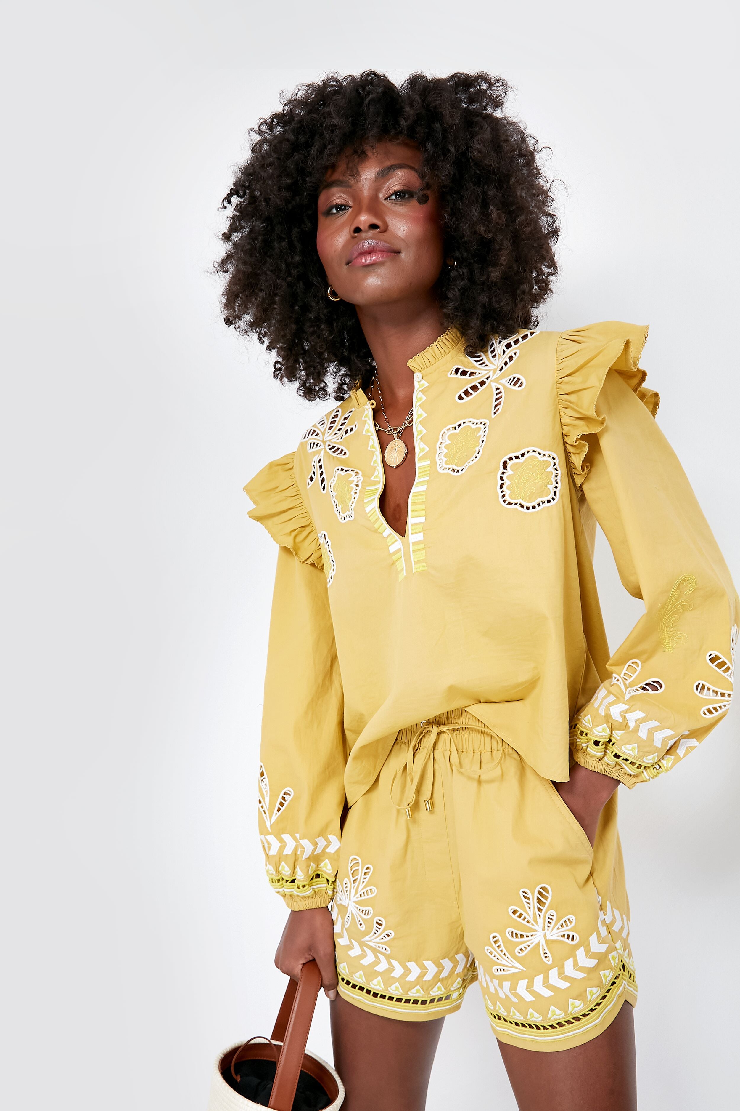 In a darling yellow-green shade. the Soumy Olive Henry Shorts are the boho style we have been dreaming of. Perfect for quickly slipping on for your morning coffee run. or for leisurely strolling by the sea. these high rise bottoms with an elasticated waist and cutwork embroidery details are effortless yet mindful — and you're going to freak when we tell you they have pockets too. Style with a tee and sandals for an easy outfit formula or with the matching top and espadrilles for a statement look.