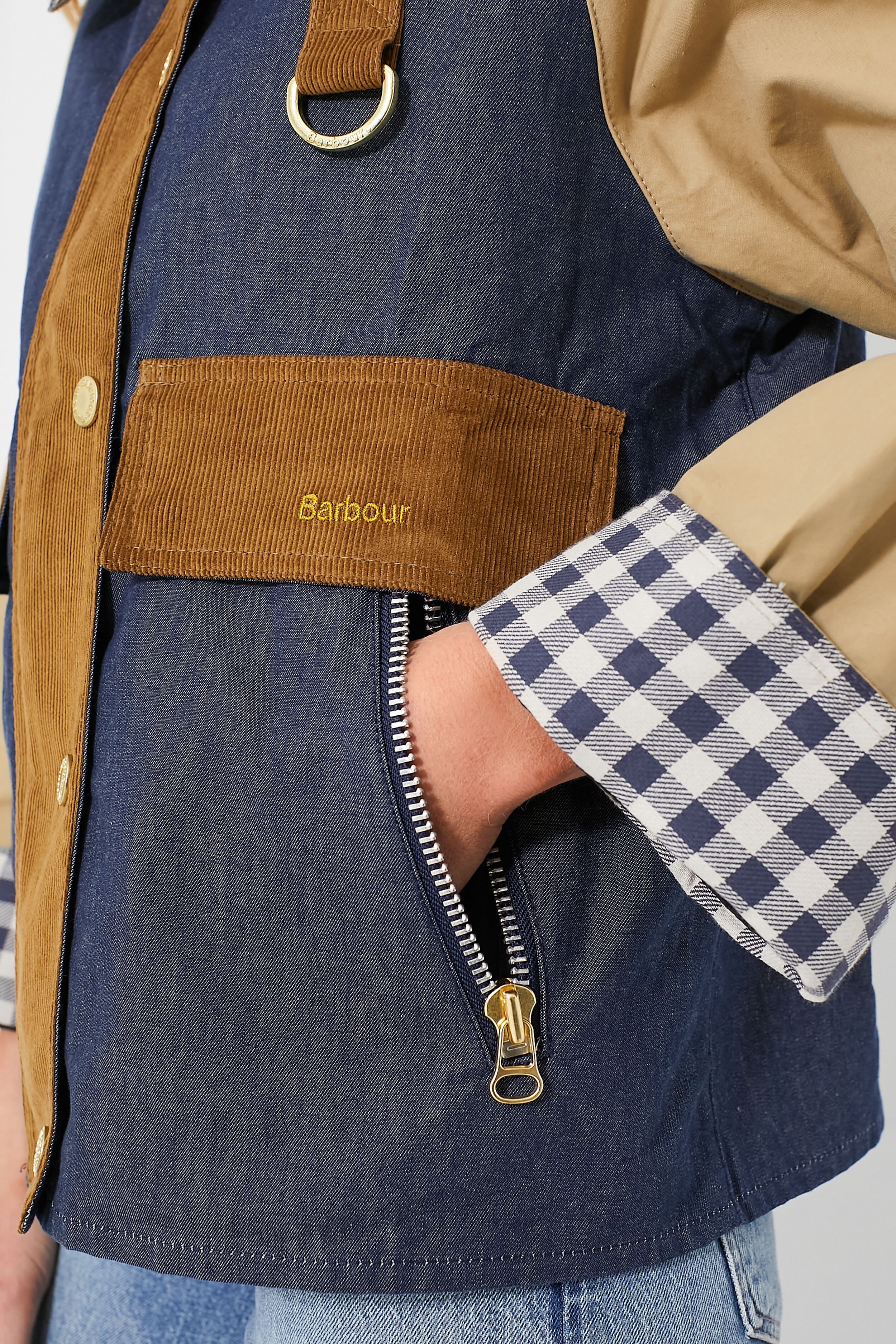 The Summer Navy Northumberland Catton Patch Showerproof expertly plays with proportion. contrasting fabrics. and colorblocking to create an outerwear icon. With statement-making details like an oversized gingham collar. a cropped length perfect for pairing with high waisted bottoms. and plenty of gold hardware in the form of a D-ring. snaps. and zippers. this is a cool-girl take on a classic. Style with a mini skirt and loafers for a flirty styling. or go for straight leg denim and flats for an elevated everyday look.