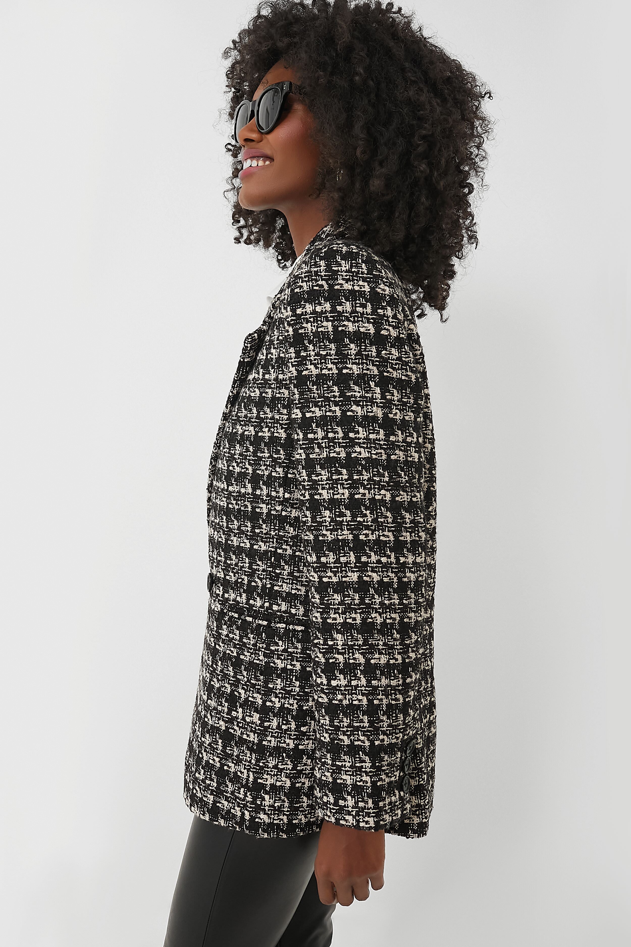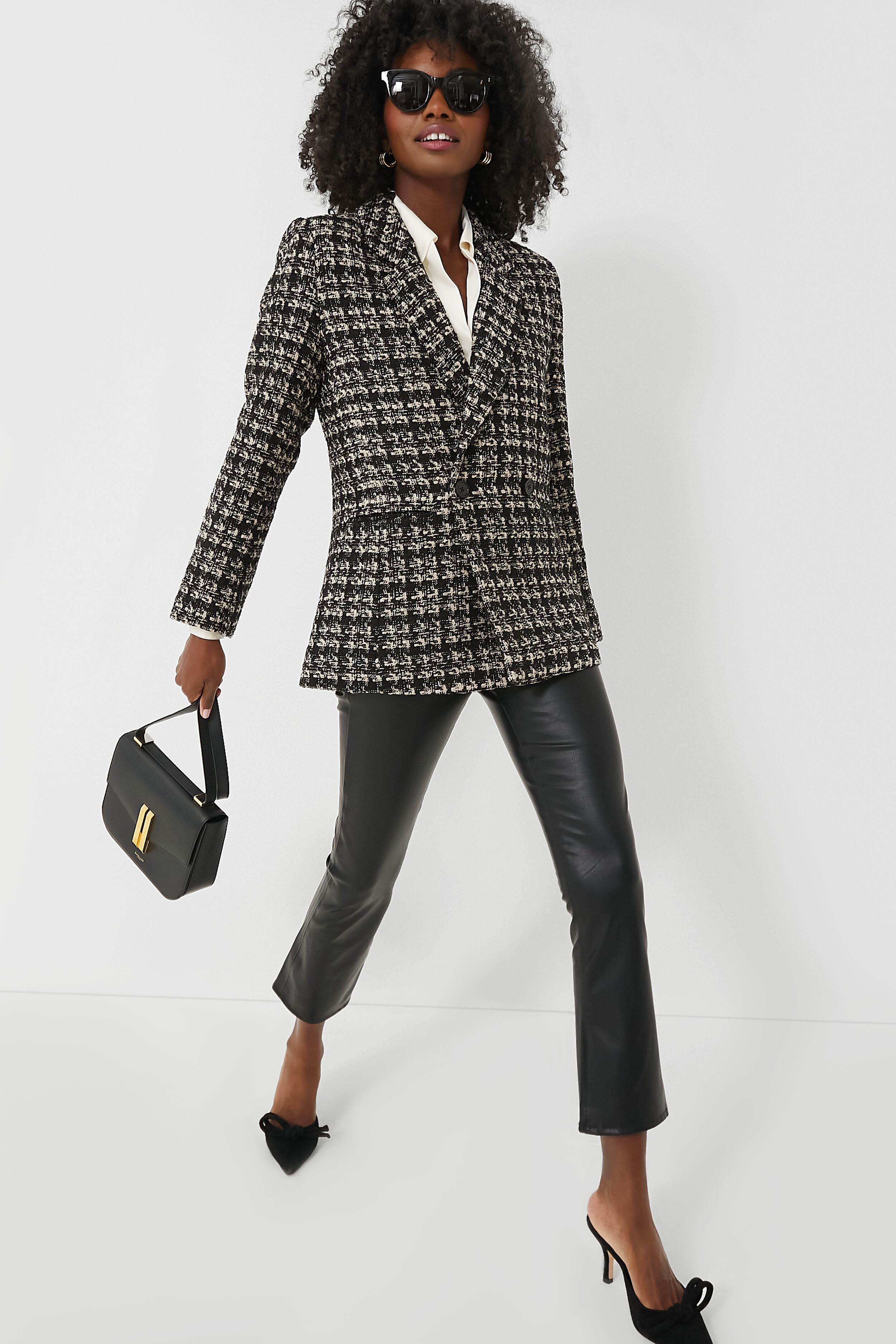 Designed for light layering. the Tan and Black Tweed Madeleine Blazer delivers a universally flattering fit and a super-chic look. Featuring a lapel collar. structured shoulder pads. and a double-breasted front. this timeless statement piece will live in your wardrobe for years to come. Complete with welt pockets at the hips and an interior chest pocket for your small everyday essentials. we are styling this sophisticated silhouette with a tee and denim for an ensemble fit for any occasion!