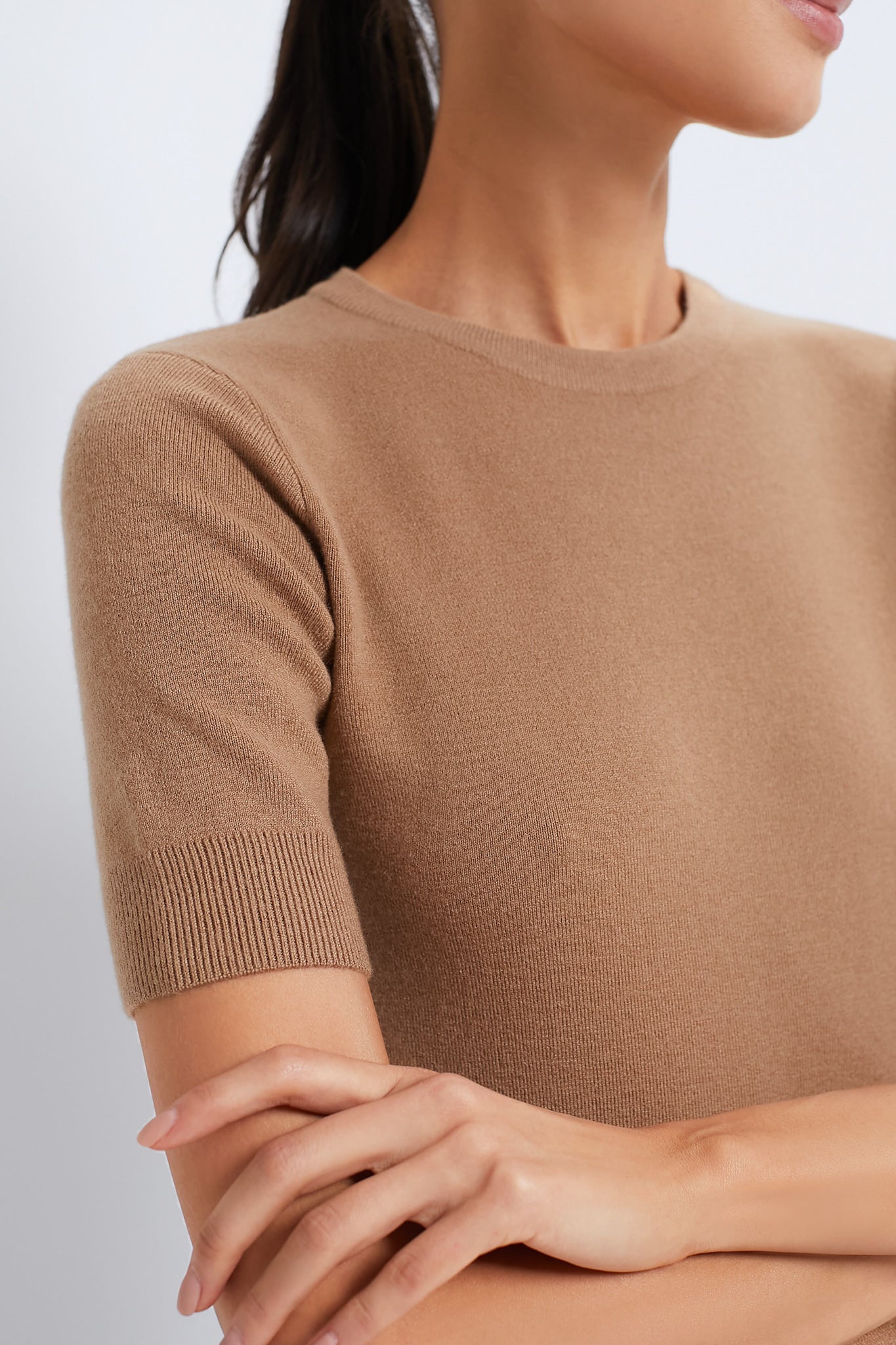 The tee is a true staple for the cooler months. with its sleek figure-hugging silhouette. neutral colorway. and soft cashmere construction. Pair with dark wash denim and boots or a mini skirt and ballet flats!