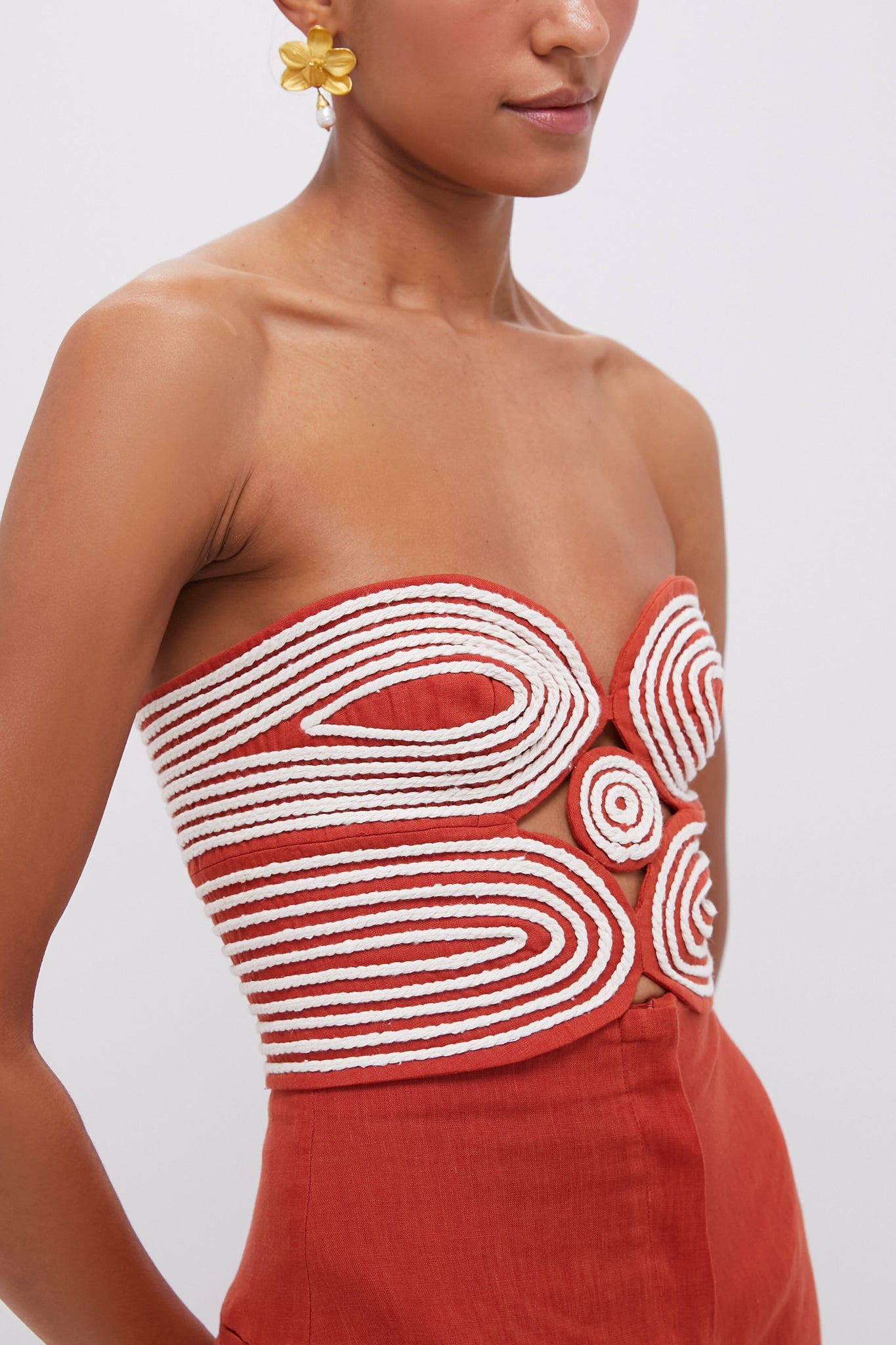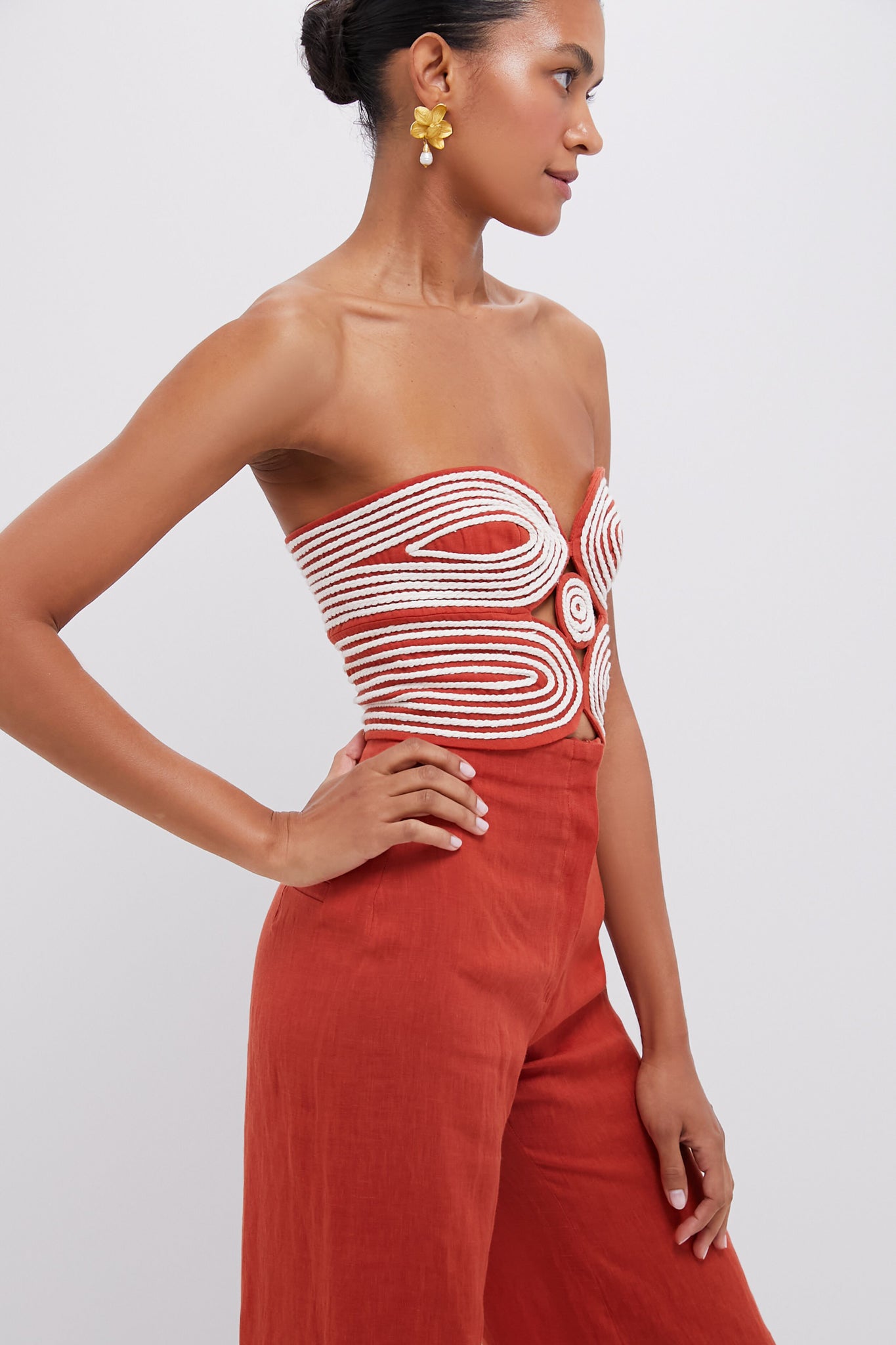 The Terracotta Baia Top stands out with a stunning embroidered bodice. that adds a fresh. artisanal touch to your wardrobe. With a fitted. strapless bodice and cut outs at the center. this top is sure to be a showstopper. We recommend pairing with the matching Terracotta Poesia Pants. heels or sandals. a mini bag. and a tan!