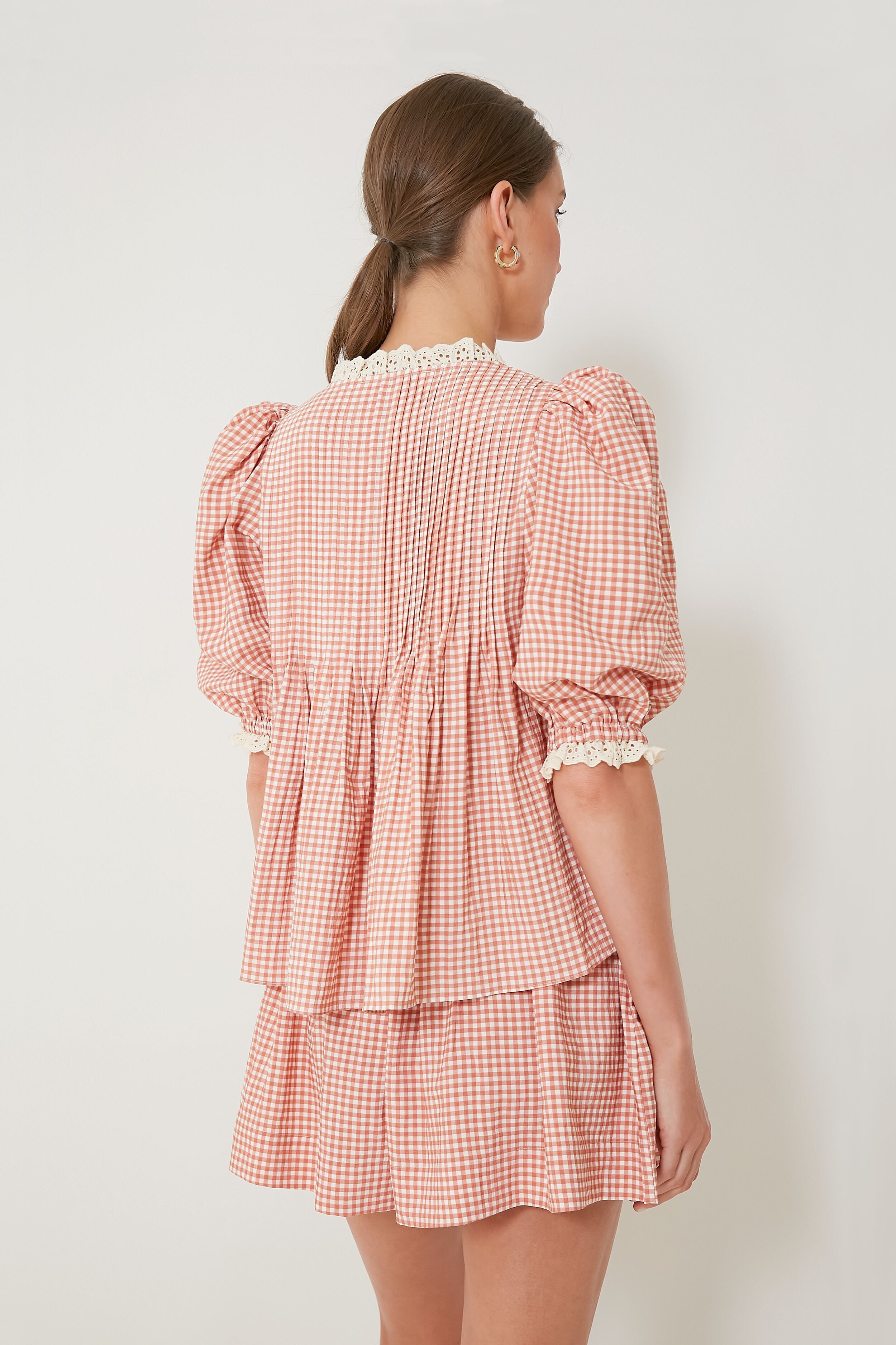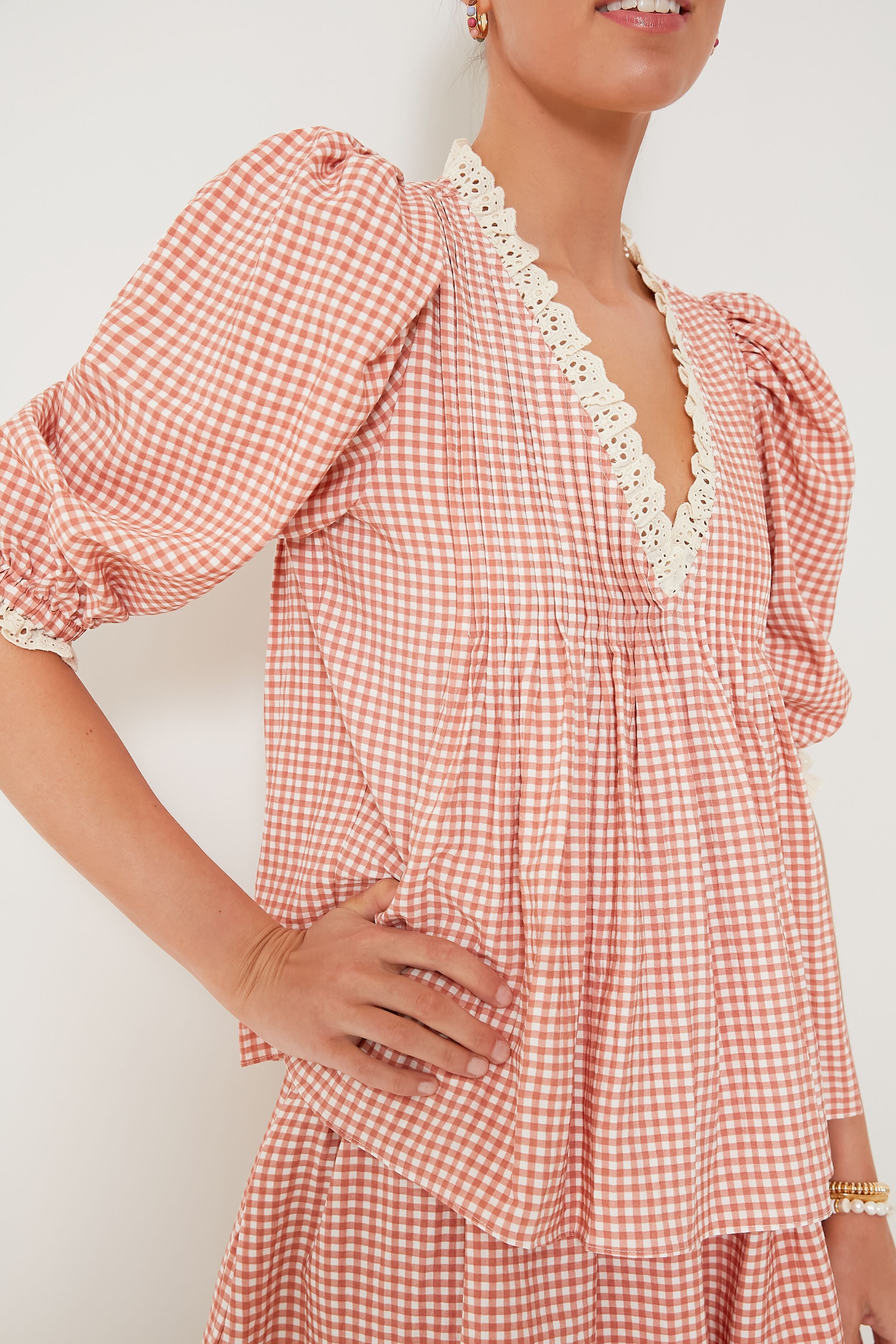 The Terracotta Gingham Mia Top epitomizes picnic chic with its super charming checkered print. Eyelet trim at the V-neckline and cuffs take it to a whole new level with sweet feminine touches. while balloon sleeves compliment the loose fit to create a relaxed silhouette with plenty of playful volume. Perfect for pairing with your favorite white denim. or with the matching shorts and your best sandals. this look is ready for weekend adventures from park hangouts to patio drinks.