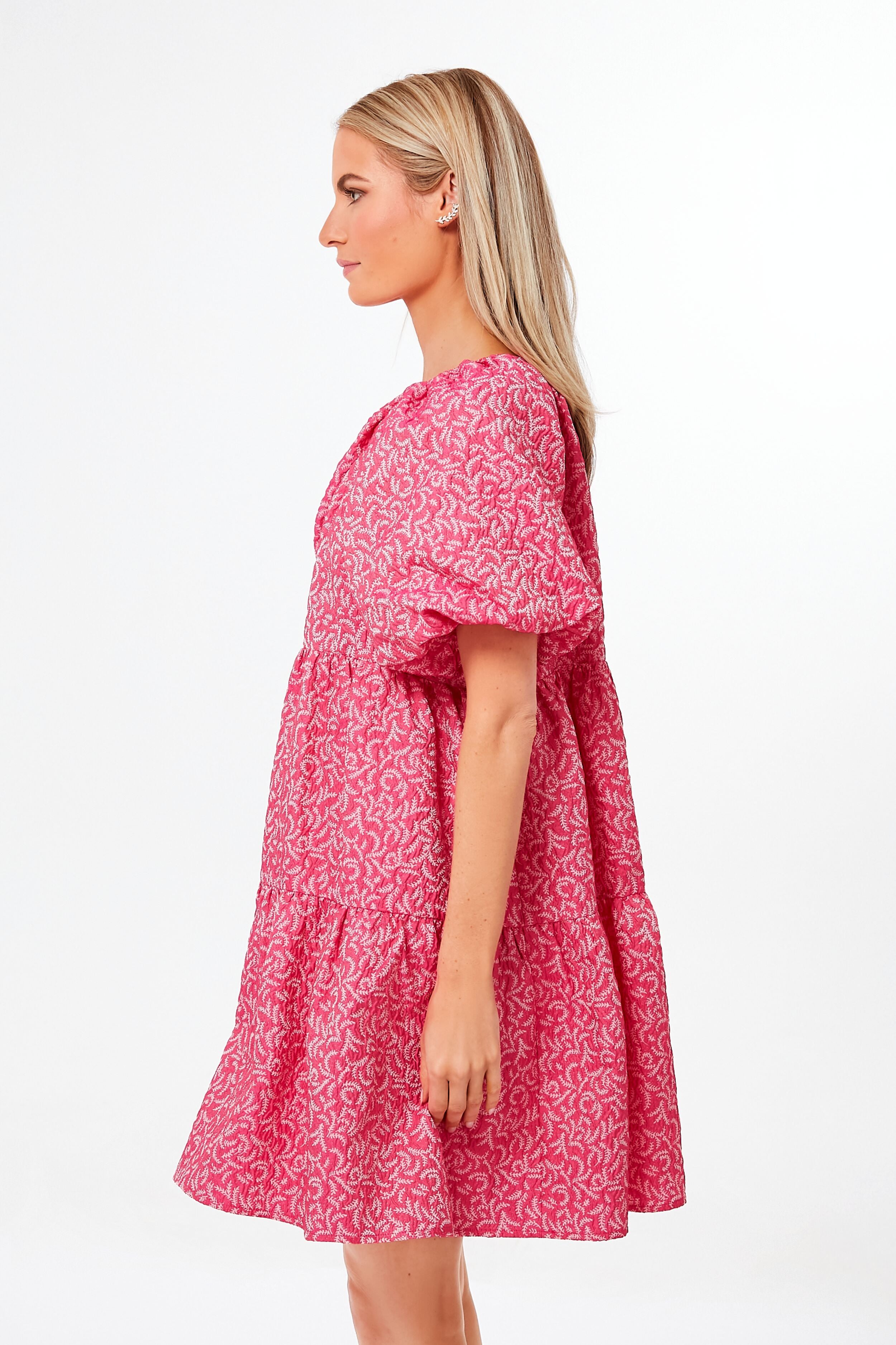 Bring on the color and drama with the voluminous shape and punchy pops of the Fuchsia Belinda Dress. Featuring puff sleeves. a tiered skirt. and flirty keyhole back ties. not to mention the all-over textured fabric for a fun update. this pink mini is ready for a good time! Pair with gold heels and accessories for a sassy and glamorous party look.