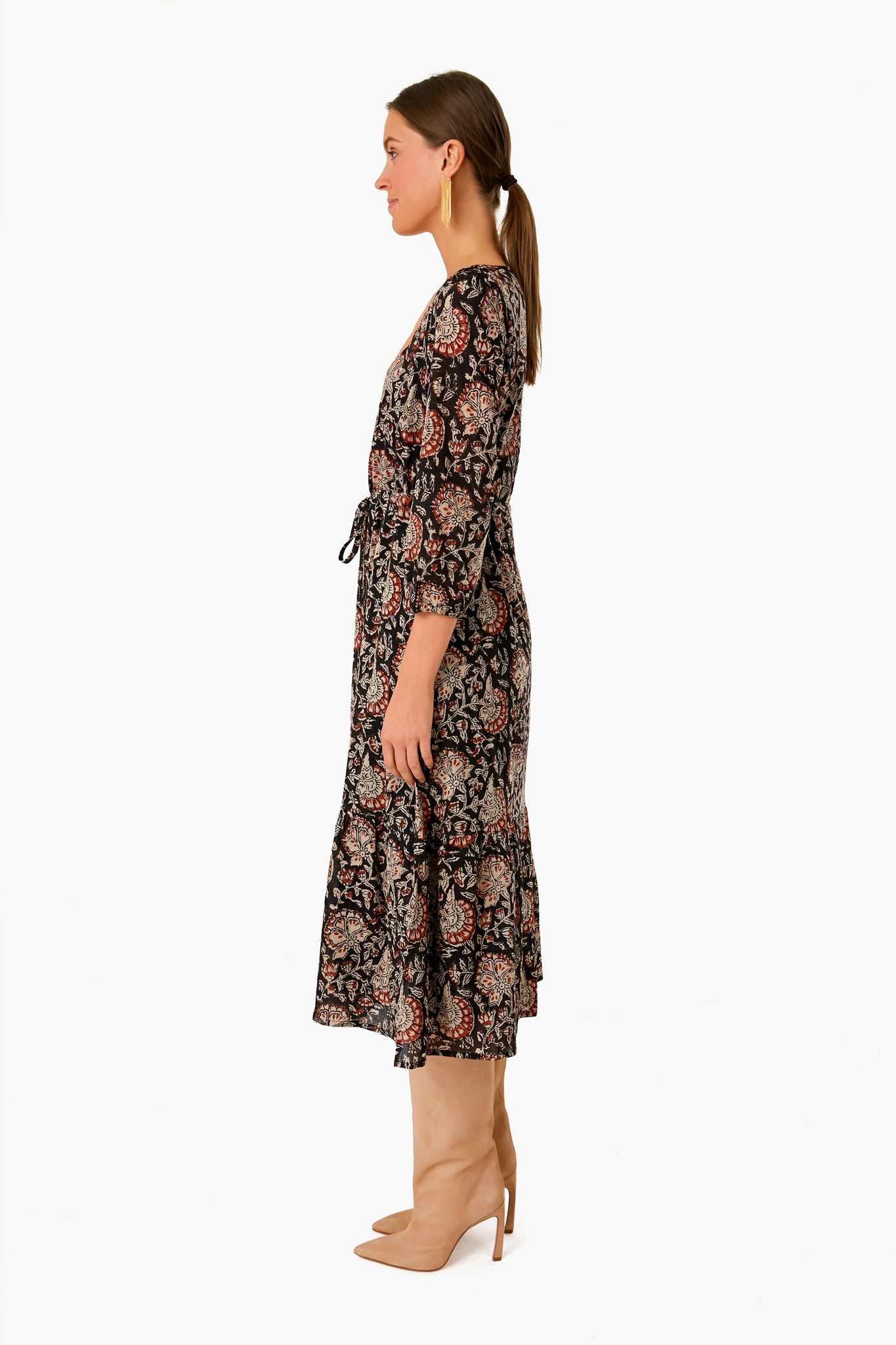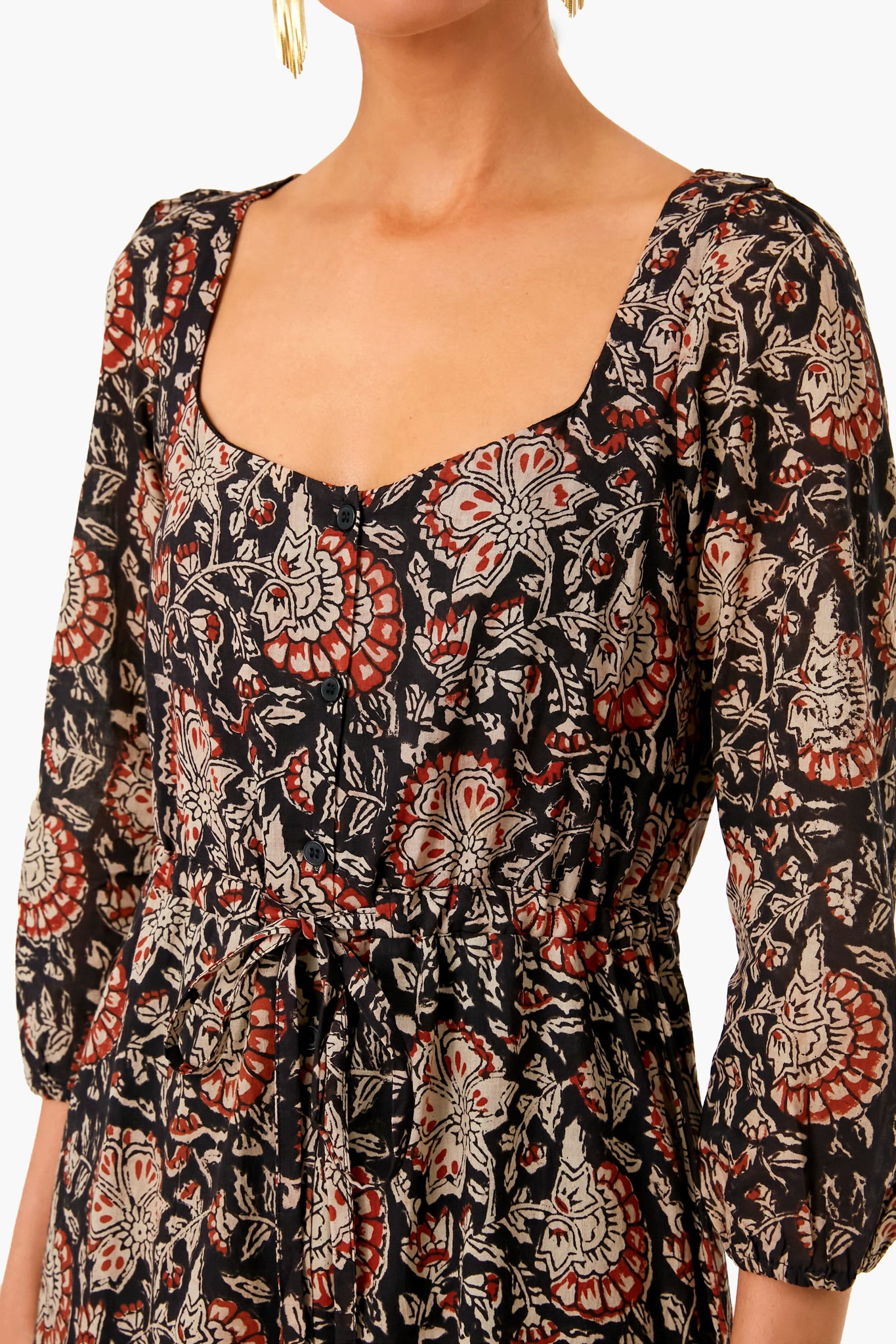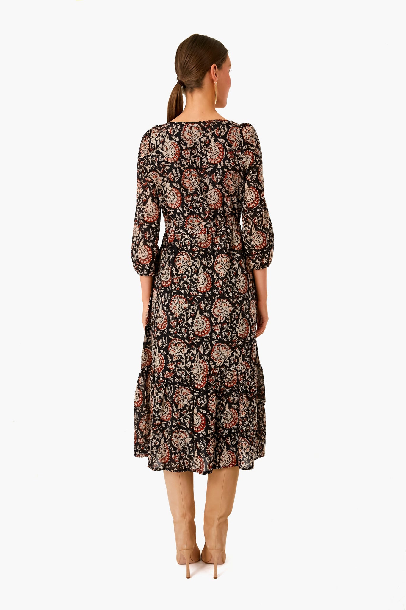 Hand-block printed using low impact dye. the Thalia Print Organic Lucy Long Sleeve Dress features a gorgeously detailed paisley design. A scoop neckline. gathered shoulders. and ruffle cuff and skirt details create an effortless silhouette that can be easily dressed up or down. three seasons a year. Add statement boots and gold accessories for a picture perfect fall outfit.