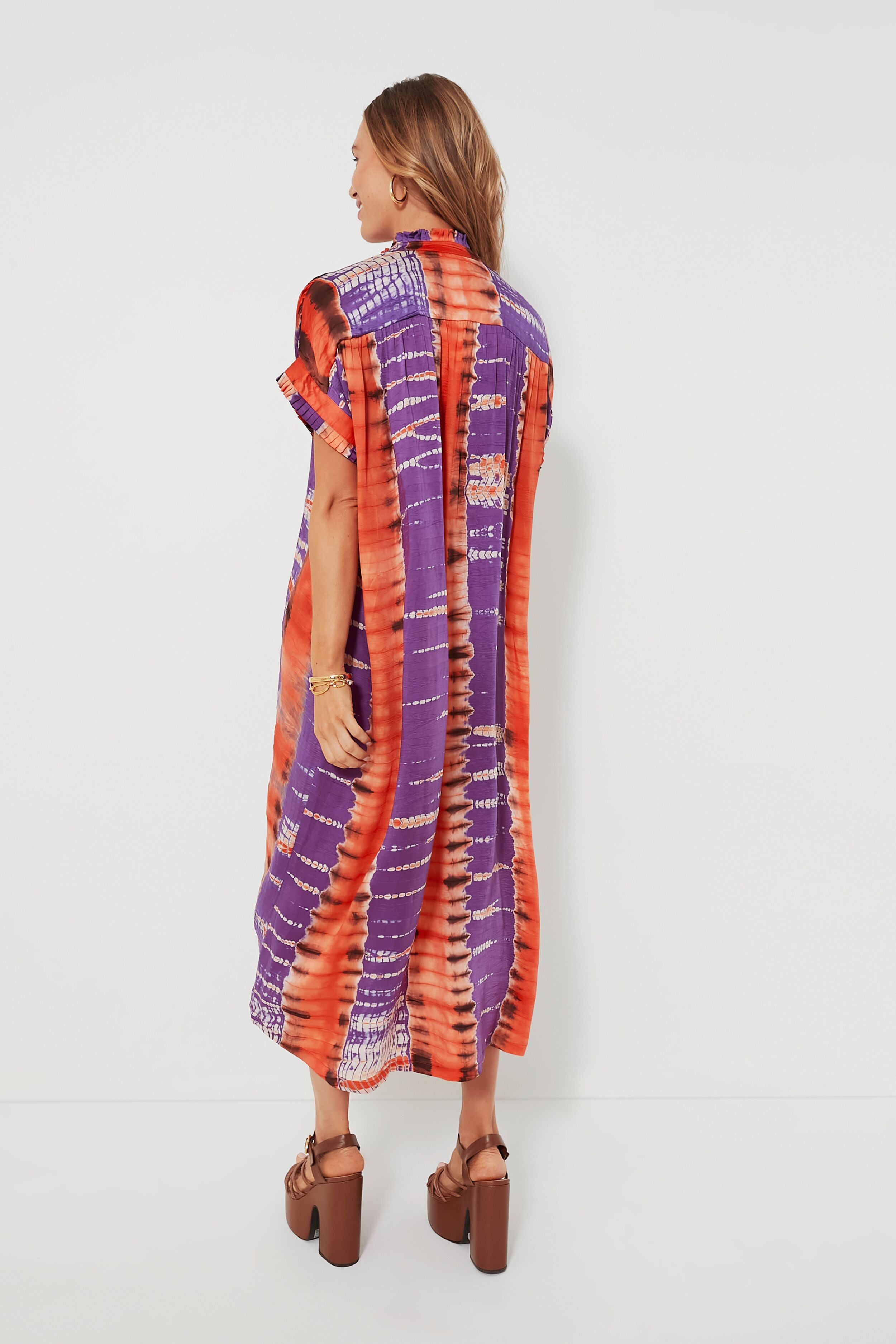 Slip away to sunny days outside with the Valerie Kaftan. Rich in colorful hues. this tie dye style features a spread collar. short sleeves. a curved hem. and a removable tie at the waist so you can choose to wear it loose or cinch the waist. This relaxed silhouette is breathable and allows for optimal movement! Style with sandals and your favorite sunnies for a day in the garden or brunch with friends.