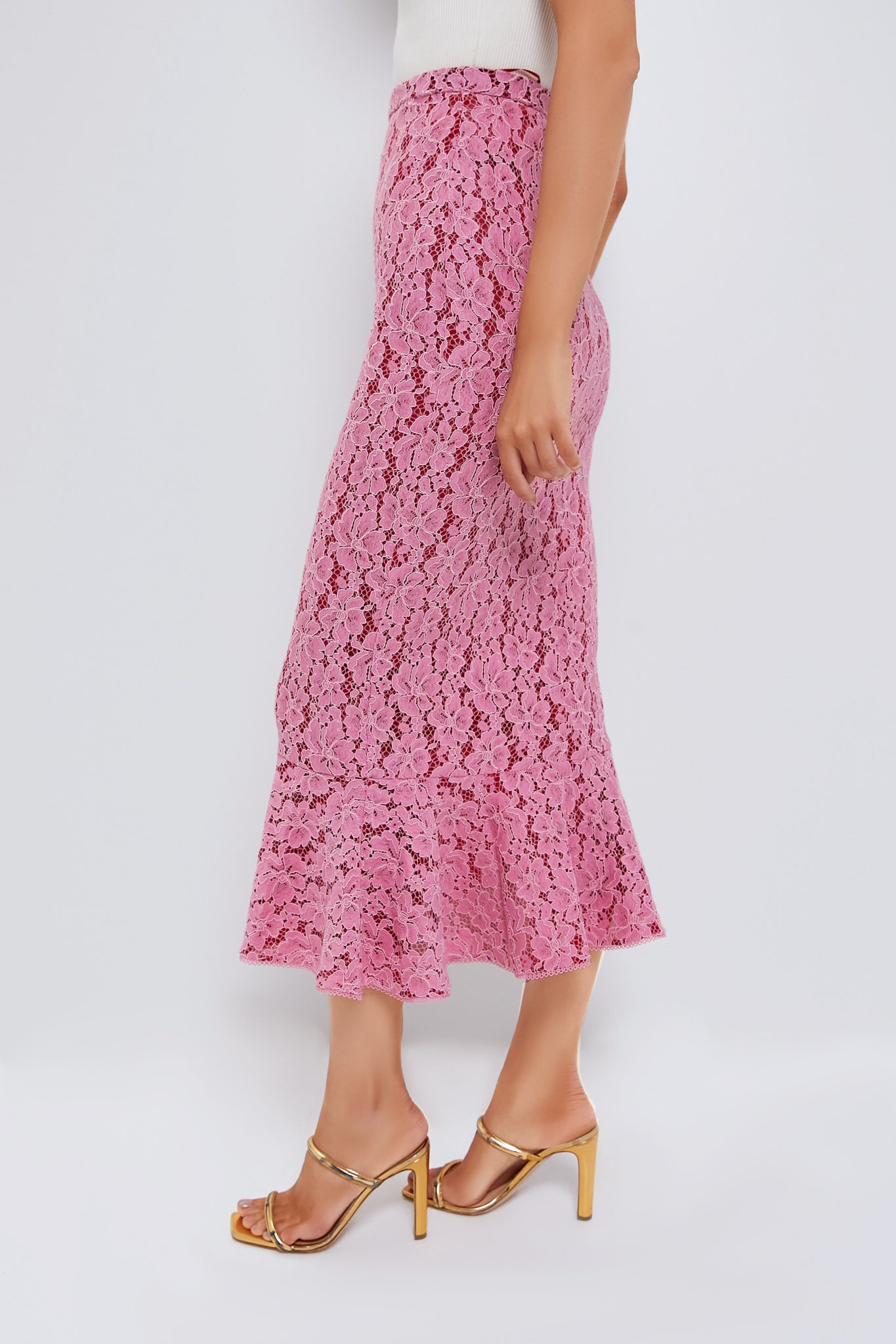 The Aidan Skirt Valentine Pink offers a fresh take on the classic fishtail silhouette. Crafted from elegant pink Guipure lace and lined with romantic red. this midi skirt creates a stunning double-layered effect. The skirt features a slim. fluted hem with a delicate pink scallop edge that adds a touch of refinement. Pair with a white sweater or button-down and heels and accessorize with gold!