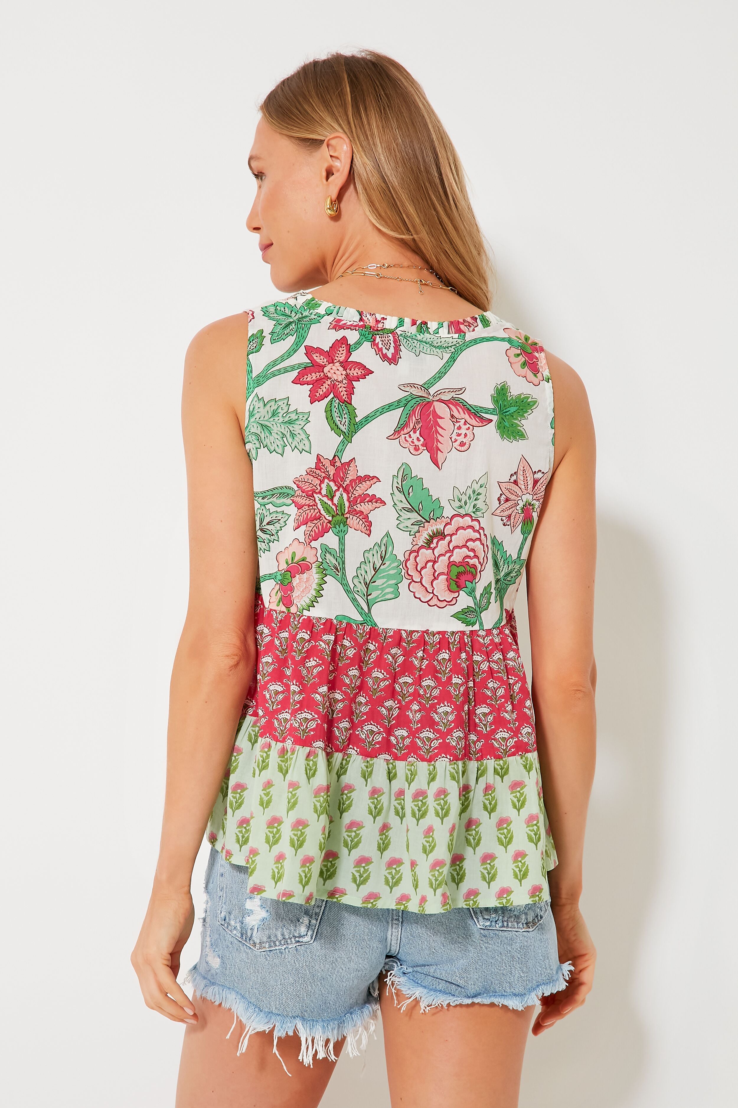 Our favorite Morningim Beach style has been updated in a top version– introducing the Watermelon Bloom Sleeveless Salty Paloma Top. We love the florals and colorblocking that create the most gorgeous and unexpected design that perfectly embodies bohemian-chic and unfussy dressing. With its tiered relaxed silhouette that'll keep you feeling breezy. this blouse is the piece you will want to throw on in the morning and keep on until dinner. pair it with denim. cutoffs. skirts. shorts. zero thought required.