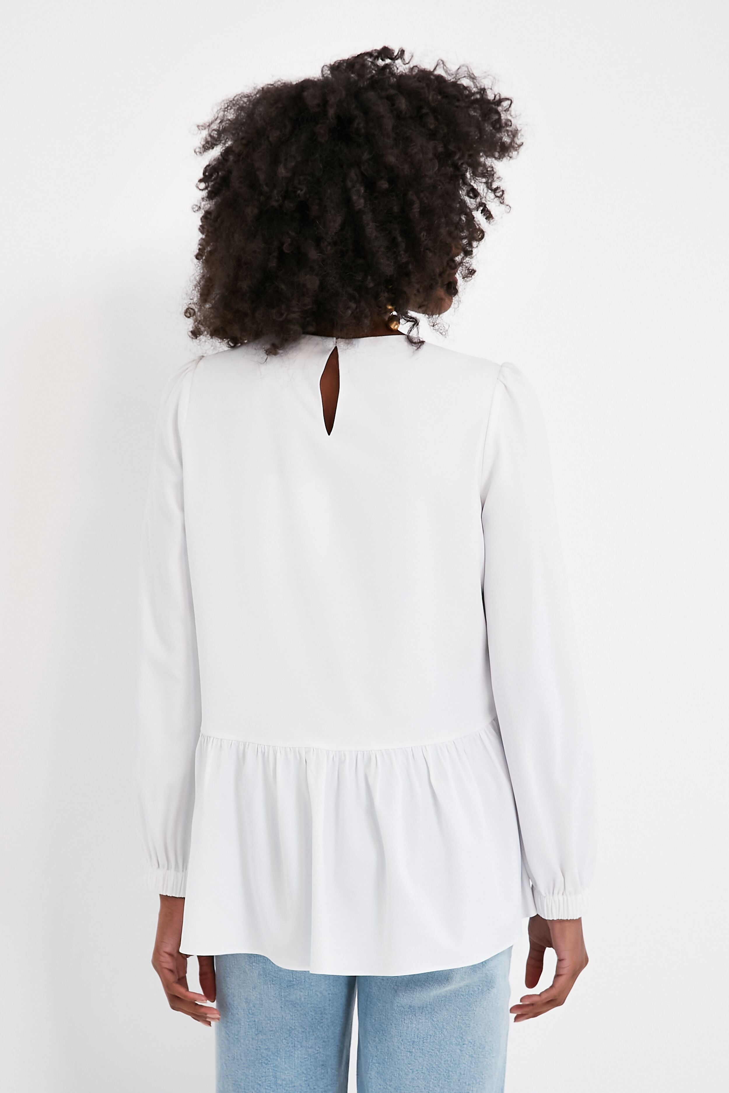 Flowy and flattering. the Carlota Peplum Blouse is a wardrobe must-have. This classic white top features puff sleeves with elastic wrists. keyhole button back closure. high-low silhouette. and a peplum hem detail. Pair with denim and a change of accessories for a fresh look that will take you from desk to drinks with ease!