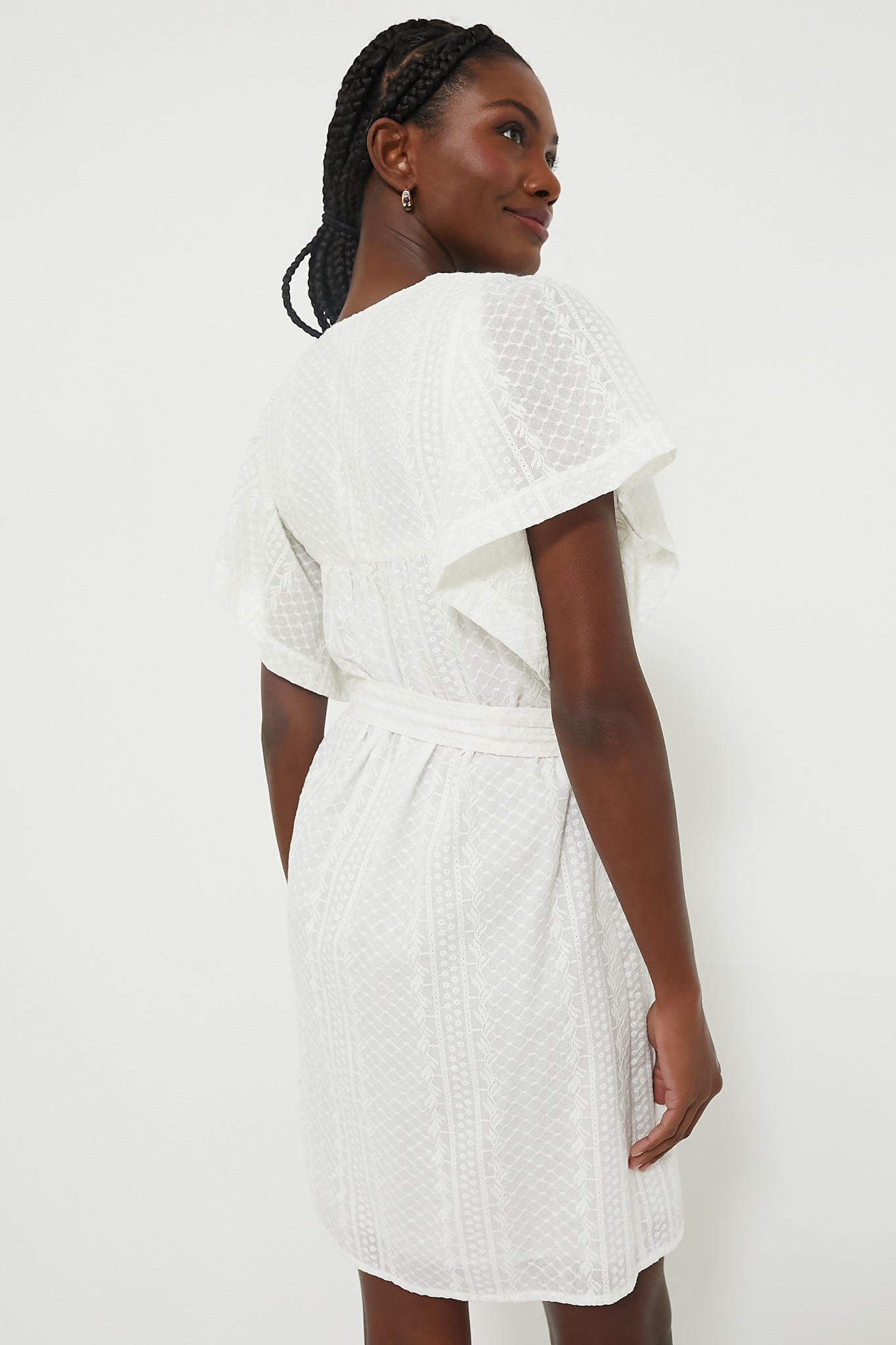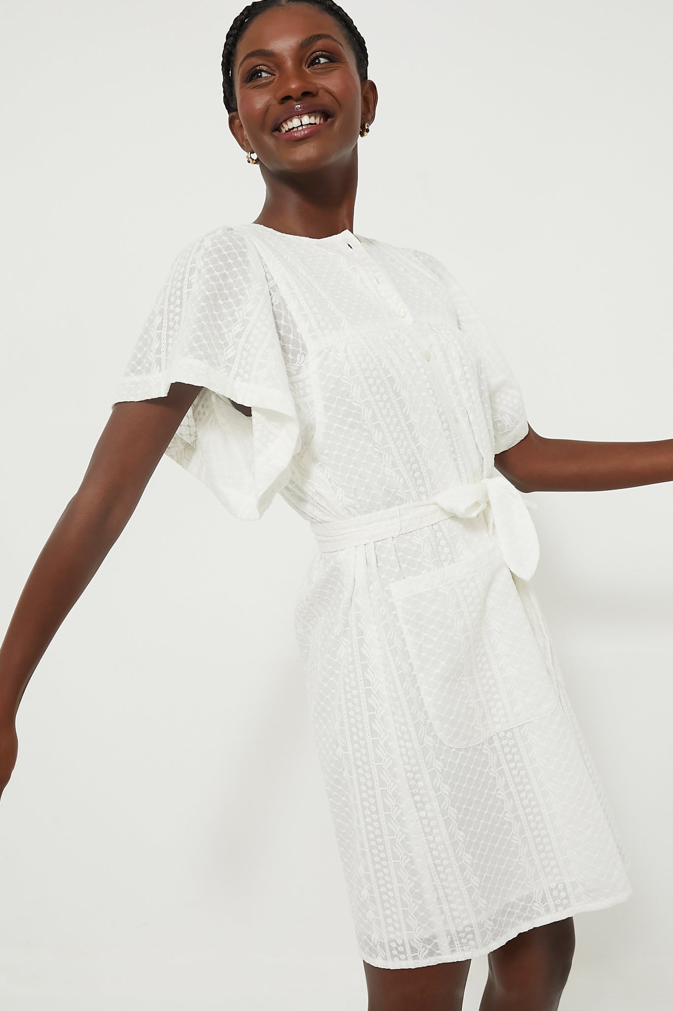 Step out in style and comfort with the White Embroidered Marion Button Dress. This timeless stunner features an elegant yoked neckline. front button placket and fluttery sleeves. Finished with patch pockets and removable sash around the waist. this mini will keep you cool and collected all summer long.