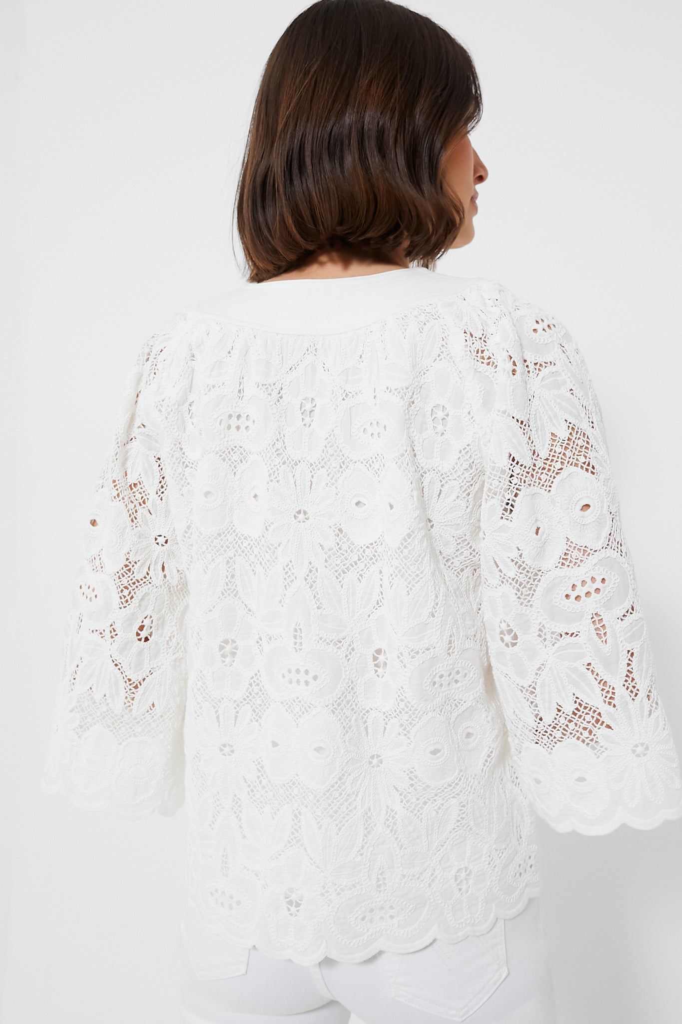 The White Eyelet Lace Florian Blouse is your new summer staple. Crafted from cotton. this top has an elegant notched neckline with stitch detailing. capacious three-quarter length sleeves and an eyelet floral design that leads into a scalloped cuffs and hem. Pair with a white denim and strappy sandals for a chic mono-tone look that will turn heads.