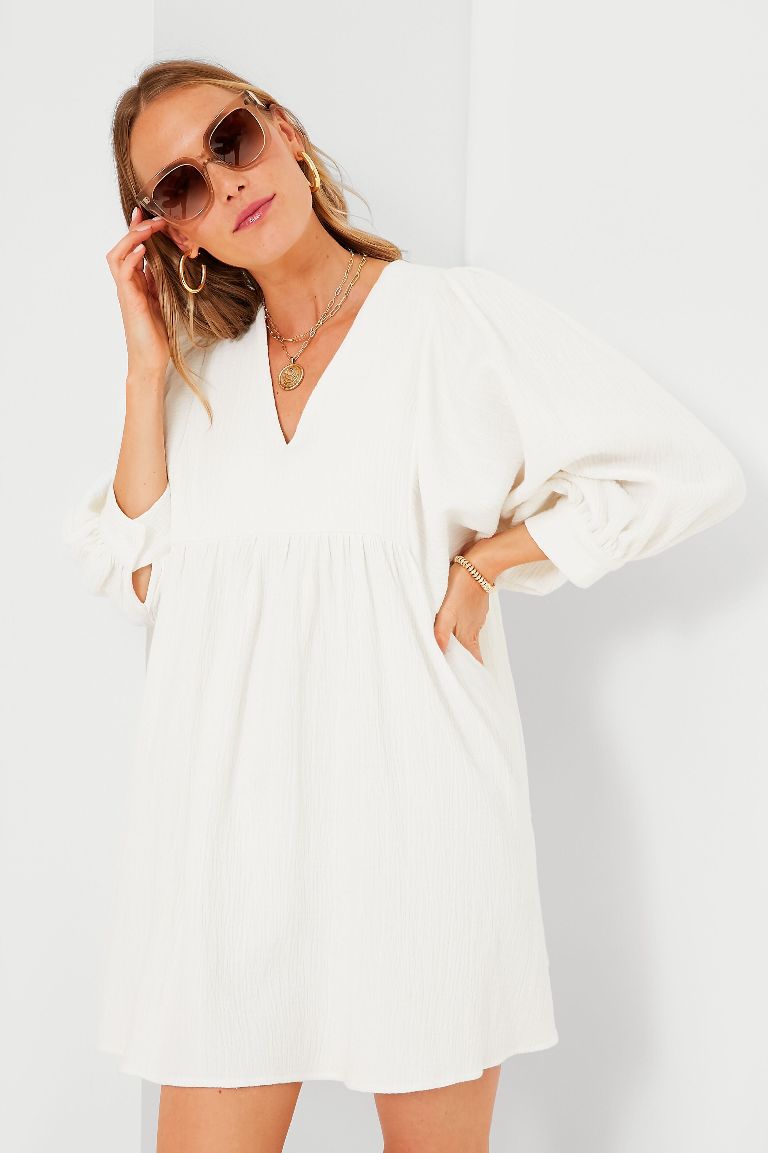 Exaggerated proportions like the slouchy. slightly puffed sleeves and a flattering empire waist are balanced by a feminine and flirty mini length. In a lightweight. breathable cotton that effortlessly skims and drapes the body. the White Gauze Millie Dress is perfect for the season– bonus points for the anti-wrinkle fabric. Add some neutral raffia accessories for a relaxed. yet put-together look whether you're out with the girls for a casual lunch or running weekend errands.