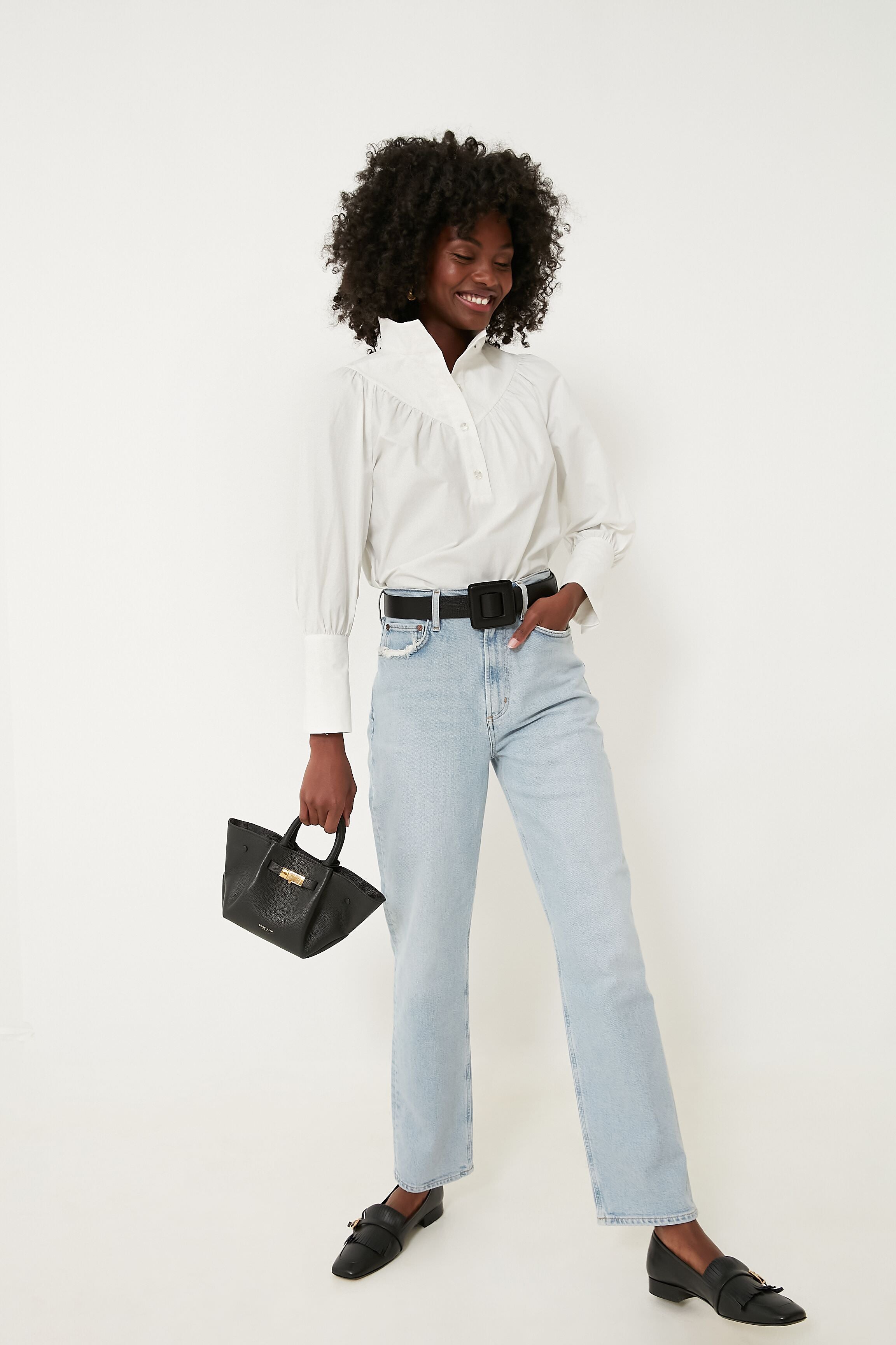The White Corrigan Blouse is the top that will instantly refresh your wardrobe. This updated classic features a stand collar with a quarter length button front placket and long cuffed sleeves for a chic. modern look. We love wearing this for an easy desk to drinks look. swapping from flats to heels and adding gold accessories for a dash of subtle glam.