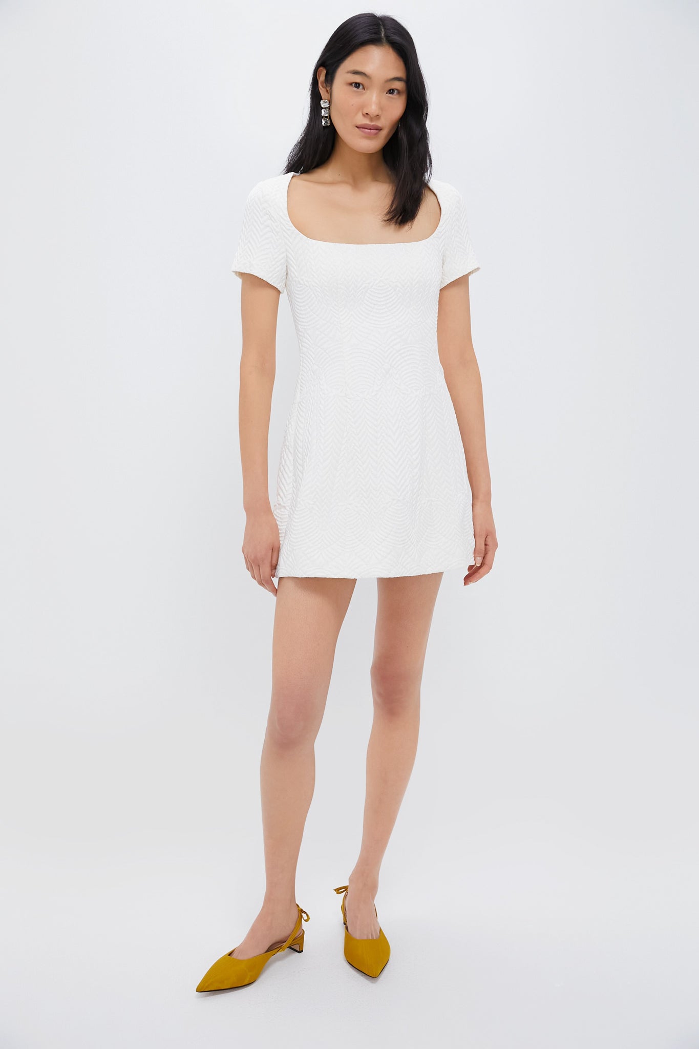 The Priscilla Mini Dress is a charming blend of elegance and playfulness. crafted from a luxurious textured jacquard fabric. Featuring a flattering square neckline and cute cap sleeves. this fully lined dress offers a feminine silhouette that's perfect for any occasion. We styled it with fun colored heel and silver jewelry and clutch!