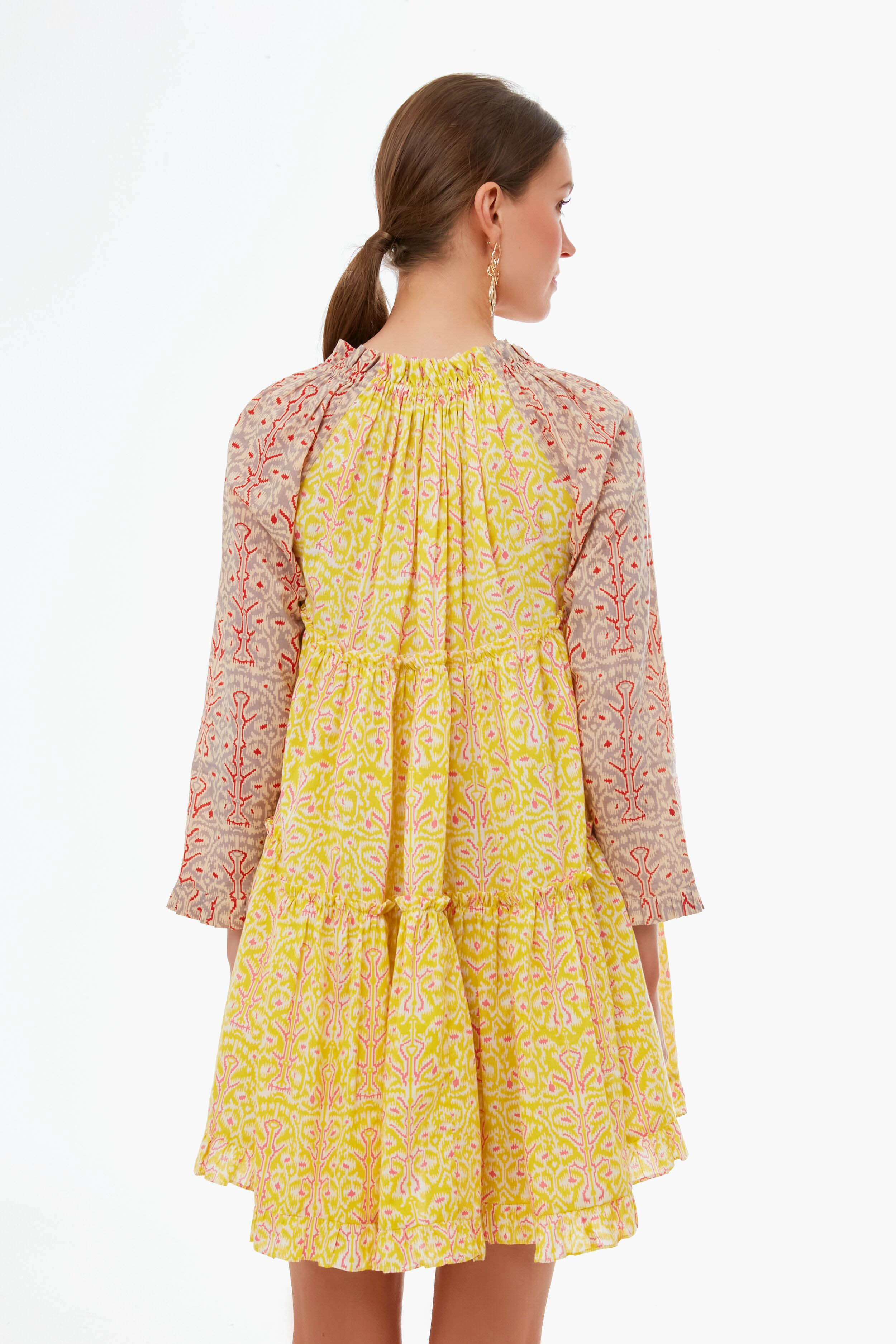 The Yellow and Sand Ikat Swing Dress is made from bright block-printed cotton in two prints. A flirty. tiered mini skirt makes this the perfect little number for dancing the night away. From sunny vacations to summer weddings. it is a must-have!