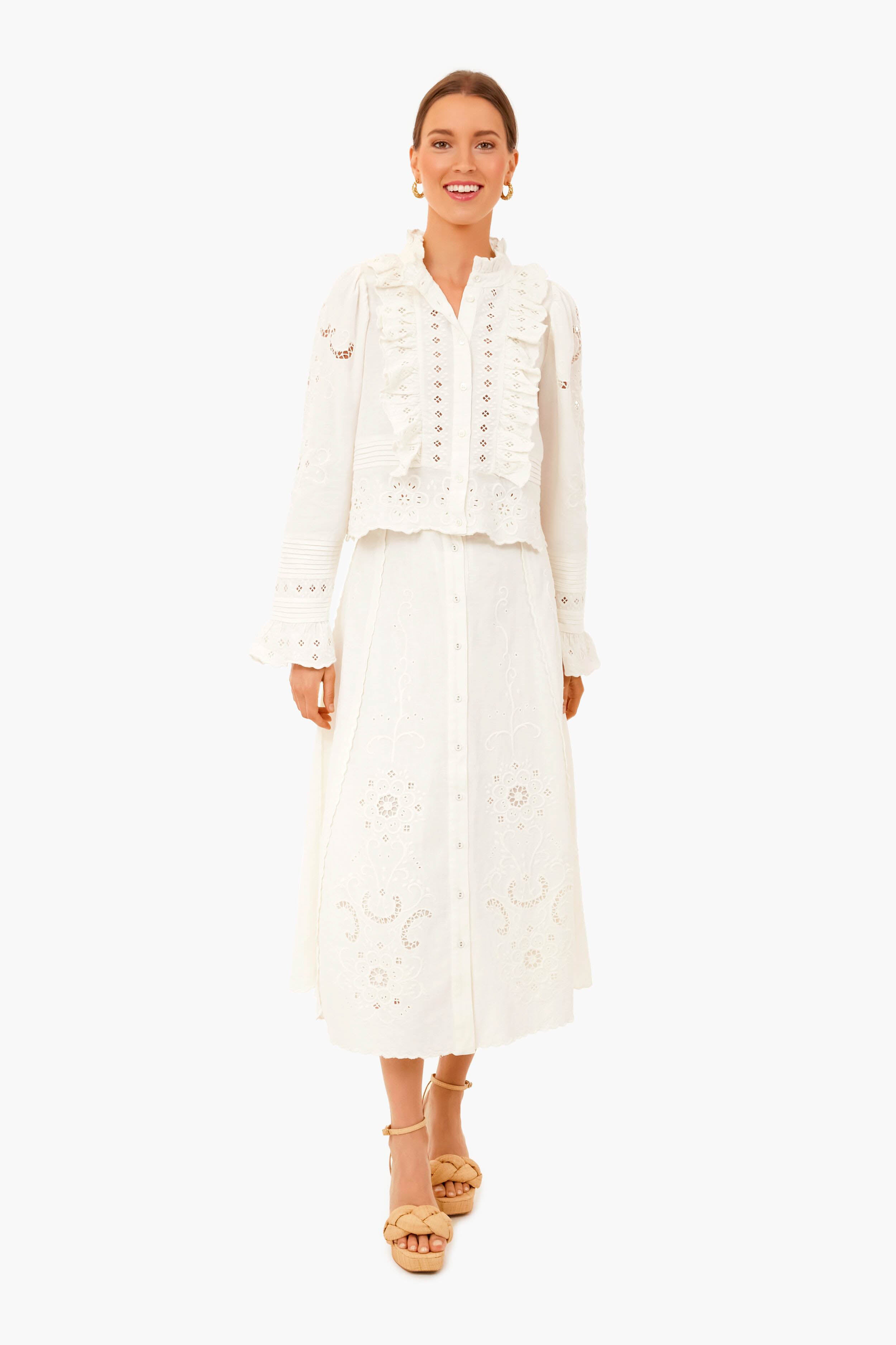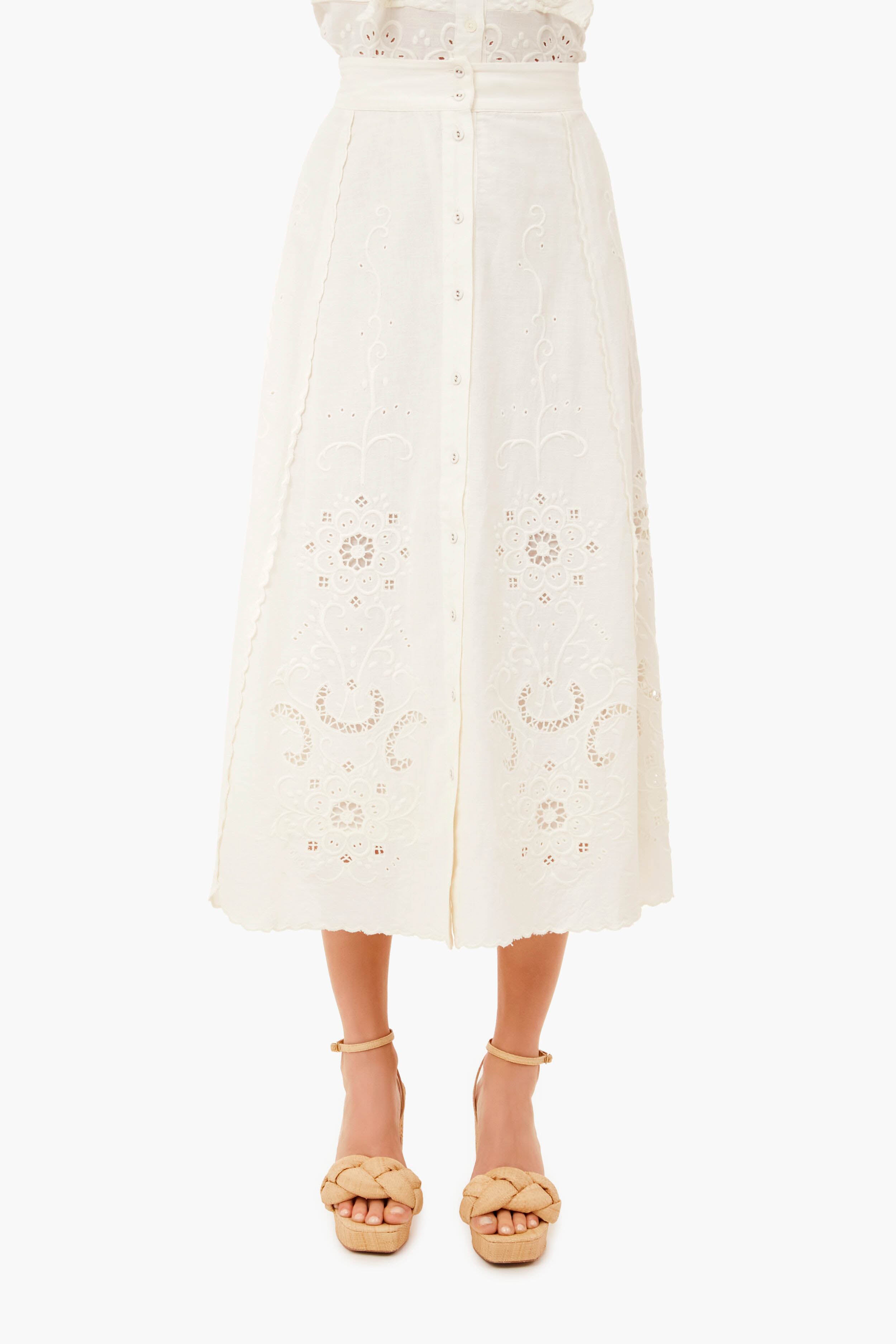 White Kiara Embroidered Button-Down Skirt