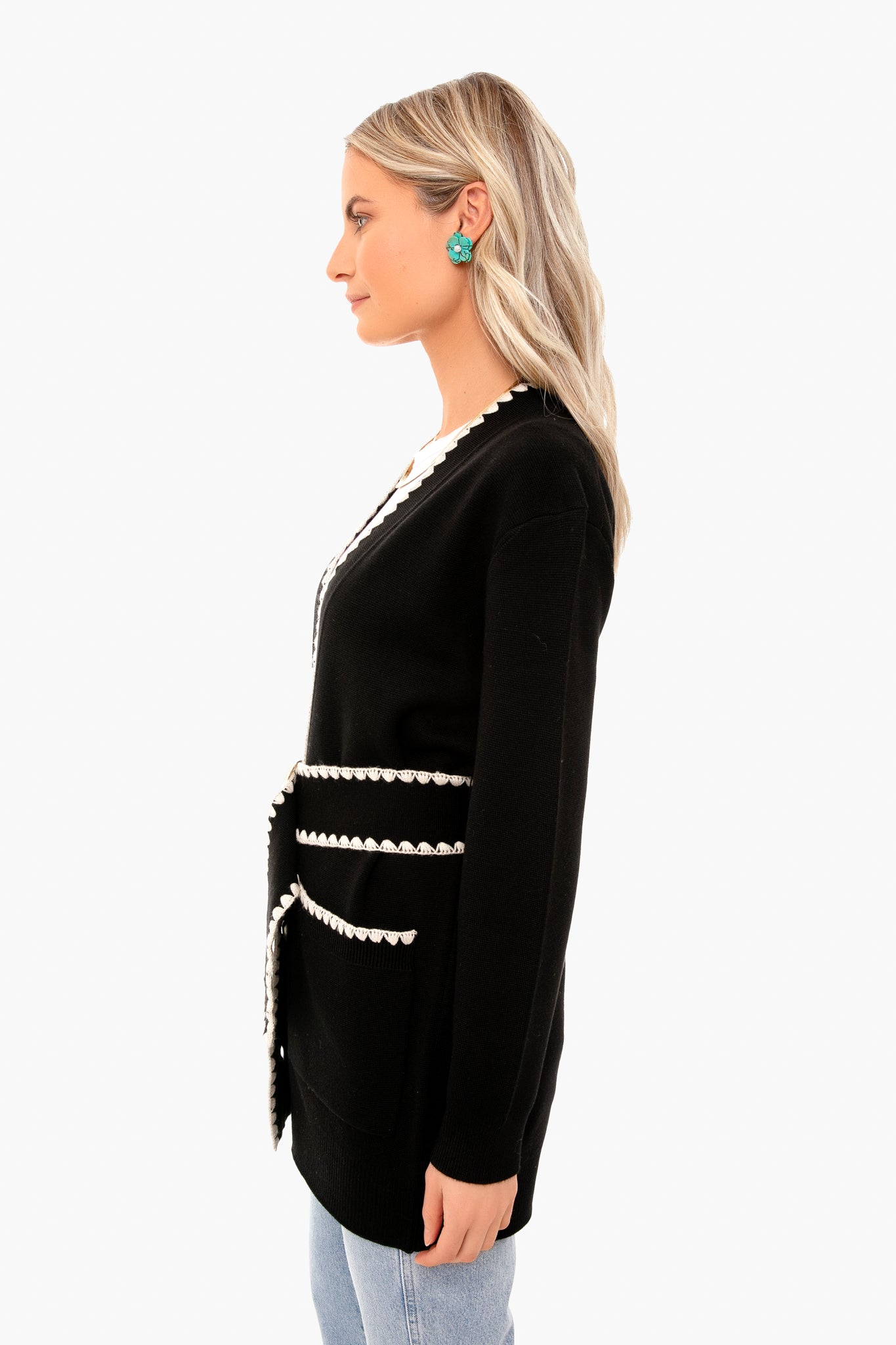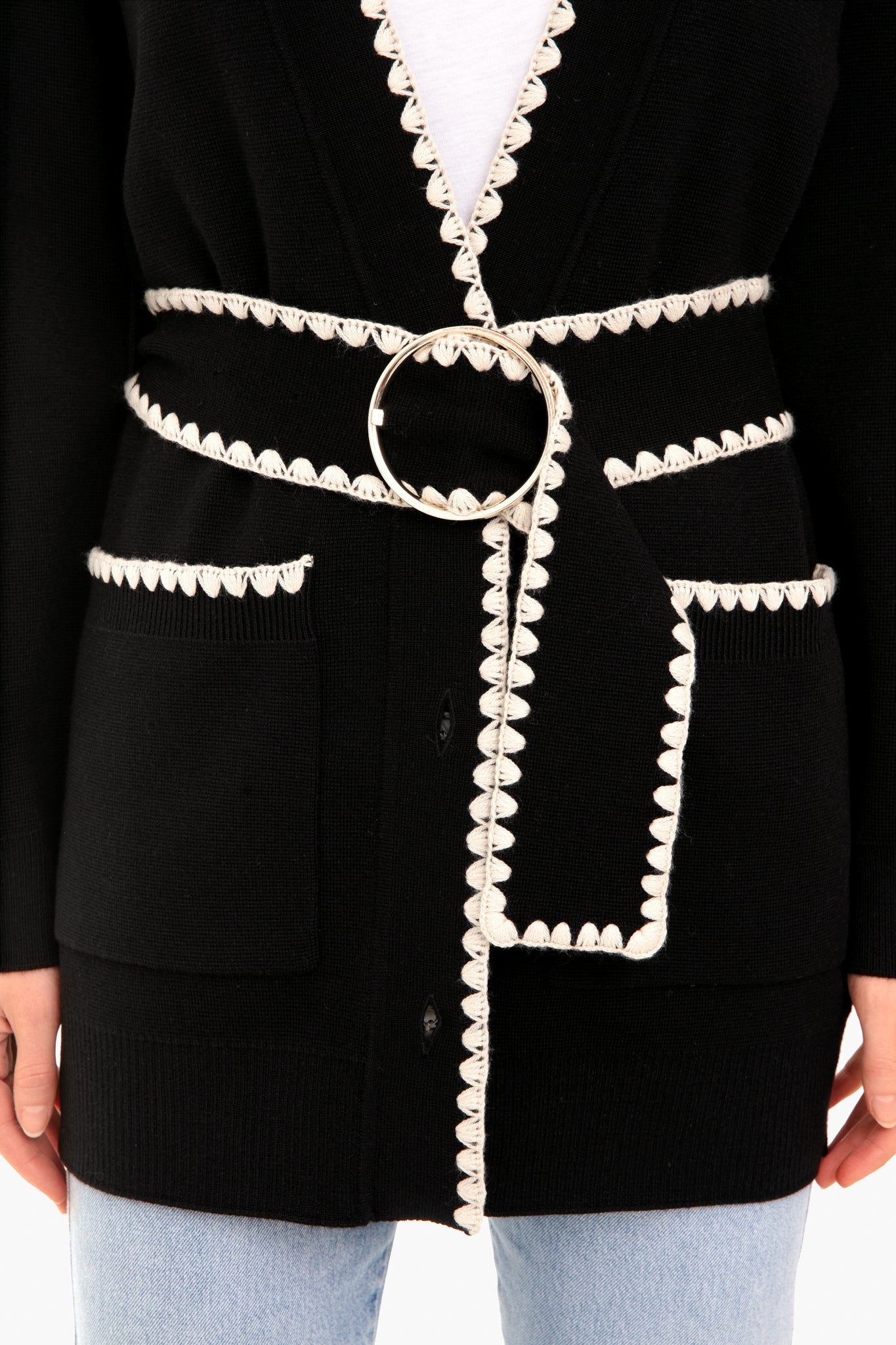 The Black Belted Cardigan is made from a merino wool blend with intricate. hand-crafted whipstitch crochet details on the trim. Featuring a season-less weight and a removable simple circle buckle. this cardigan is modern and sophisticated. Pair with denim and wedges for brunch with friends.
