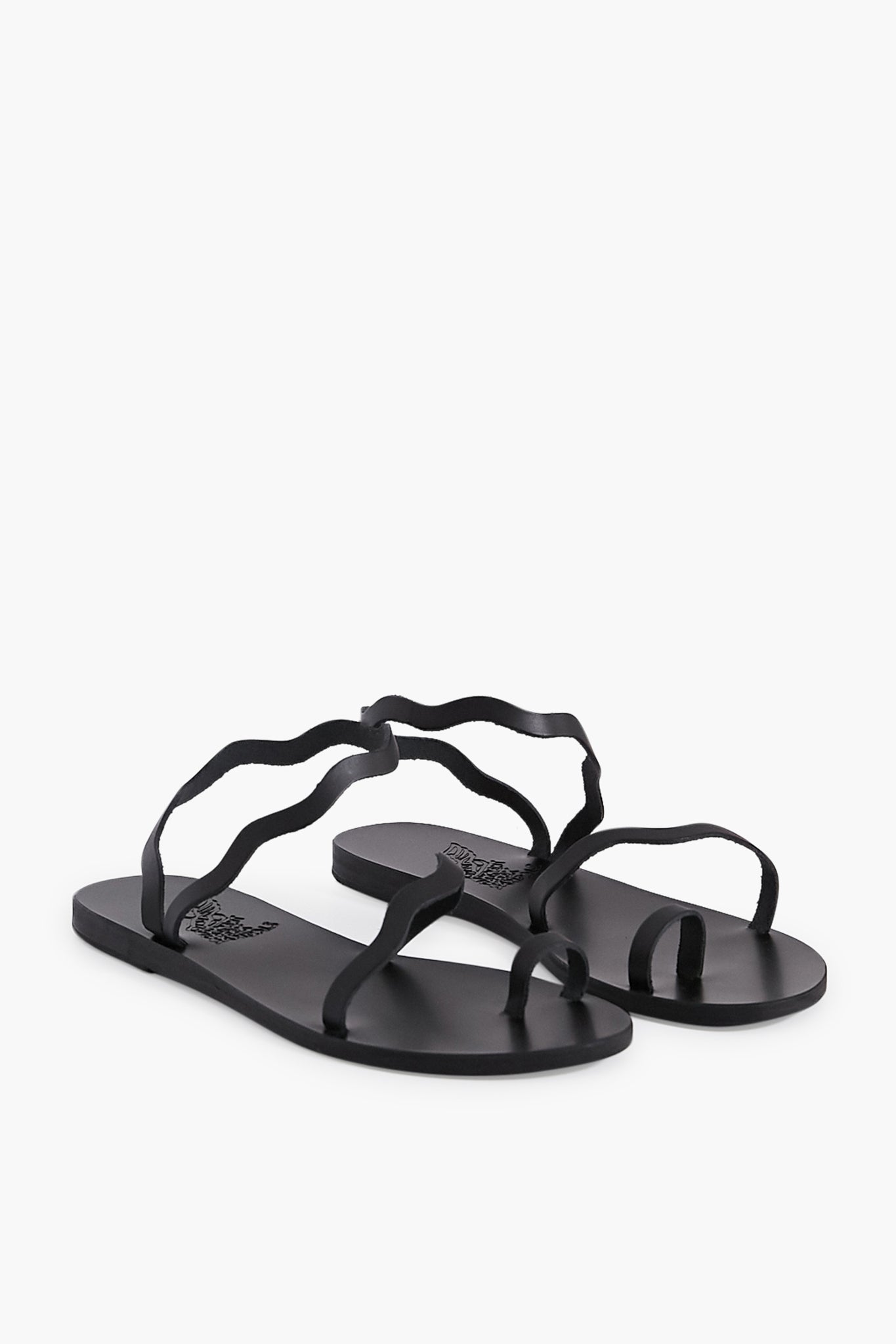 Feeling like a goddess is no myth in the Black Elafonisi Sandals! With a creative and whimsical wavy strap design that brings some fun. and a toe loop. cross-foot strap. and ankle strap create a secure and comfortable fit. These unique shoes pair beautifully with a variety of looks; our favorites include with a caftan and sunhat for a day spent poolside. or with a sleek midi for romantic dinner dates.