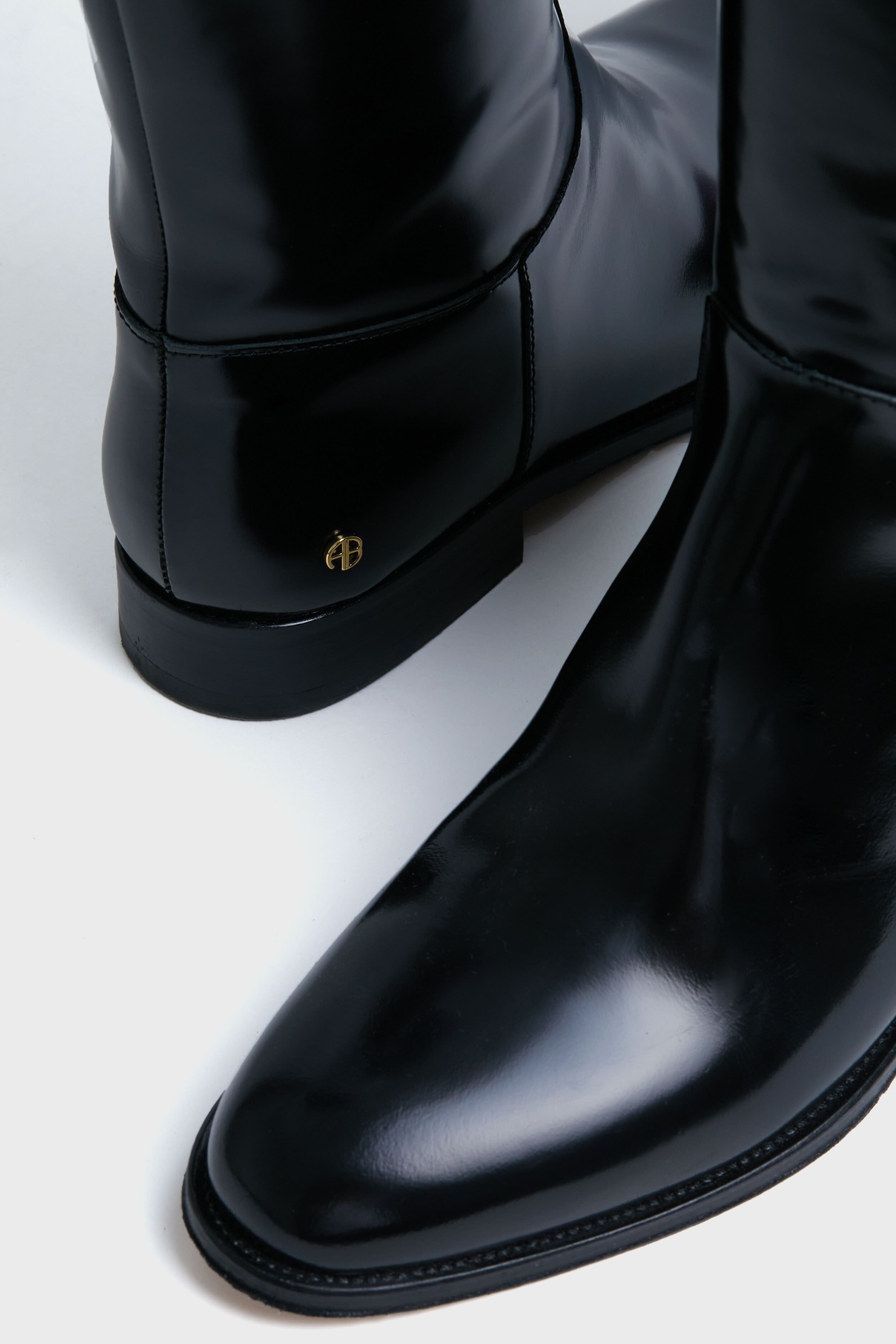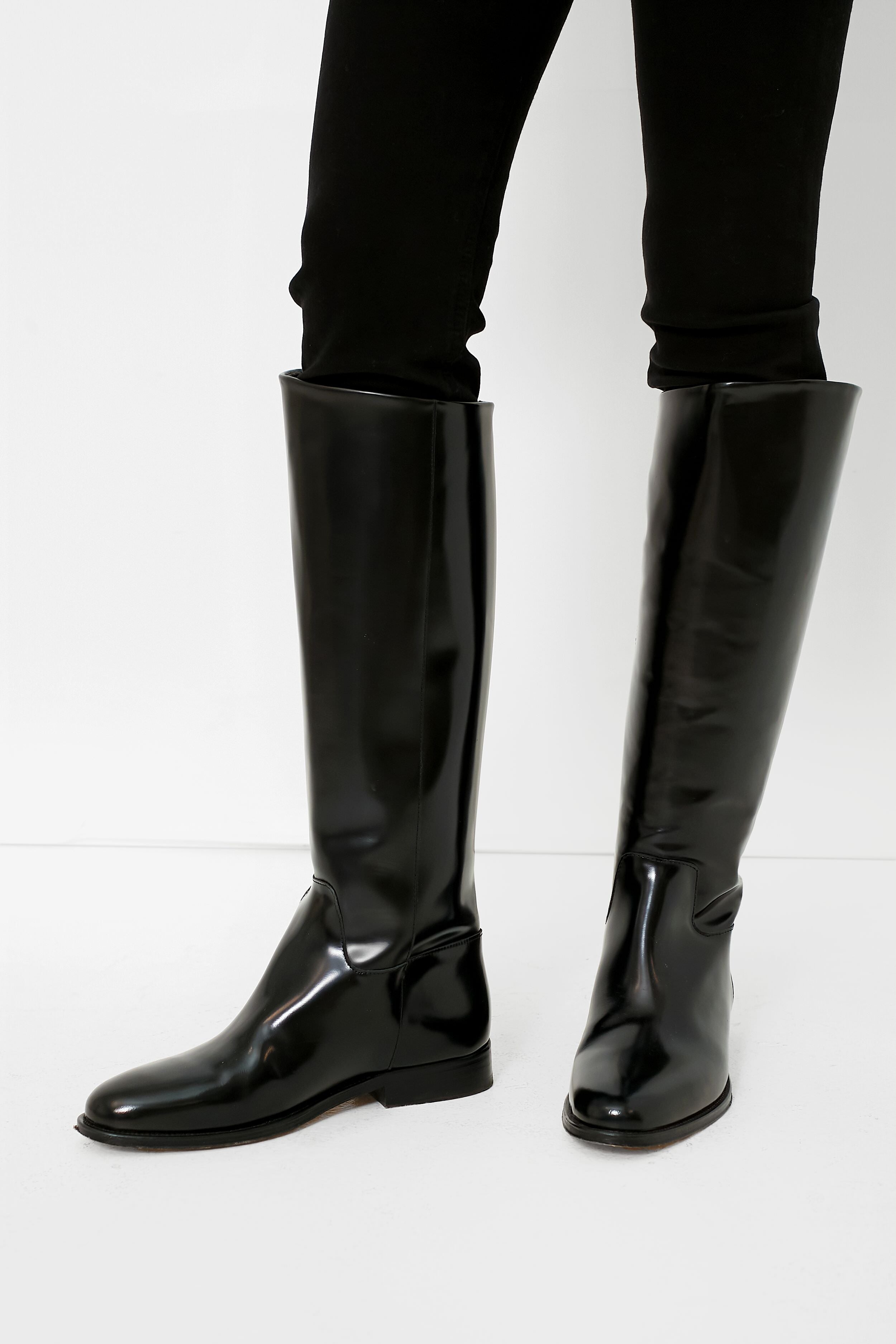 Black High Shine Kari Riding Boots. a timeless addition to your shoe closet. Designed to have a minimalist design and crafted from 100% leather. this classic knee-high silhouette features a slip-on construction. asymmetrical shaft. low heel and a gold-tone logo at heel. Slip them on for easy styling. then wear these stunners with midi dresses. maxi skirts. denim and more!