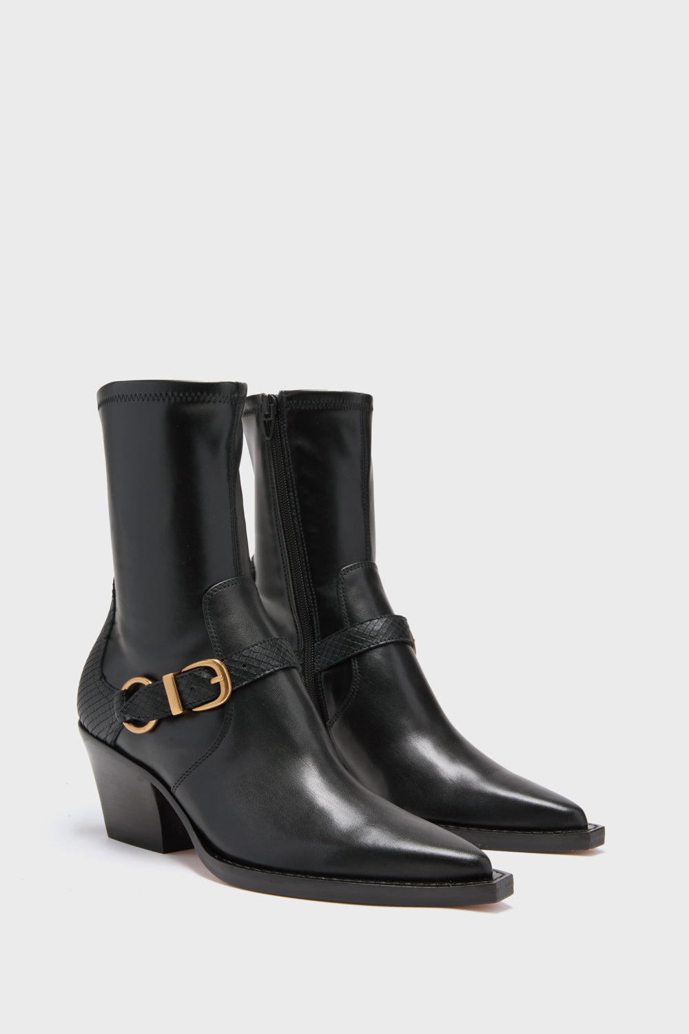 The Black Rave Boot's sharp details. sleek silhouette. and chic metal buckle will keep the compliments coming. Elevate all your cool weather layers by pairing these with sweater dresses. boot-cut denim. or maxi skirts!
