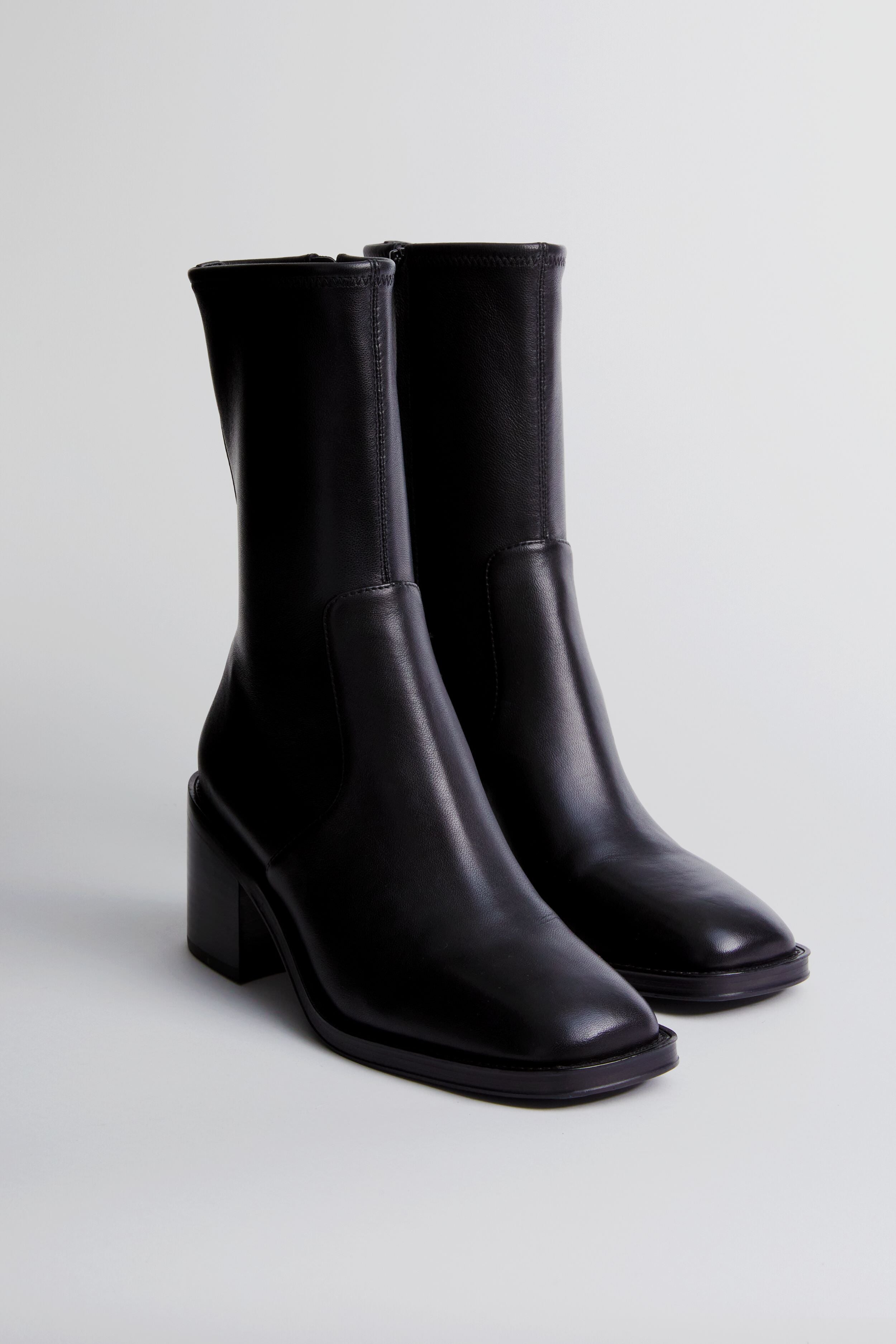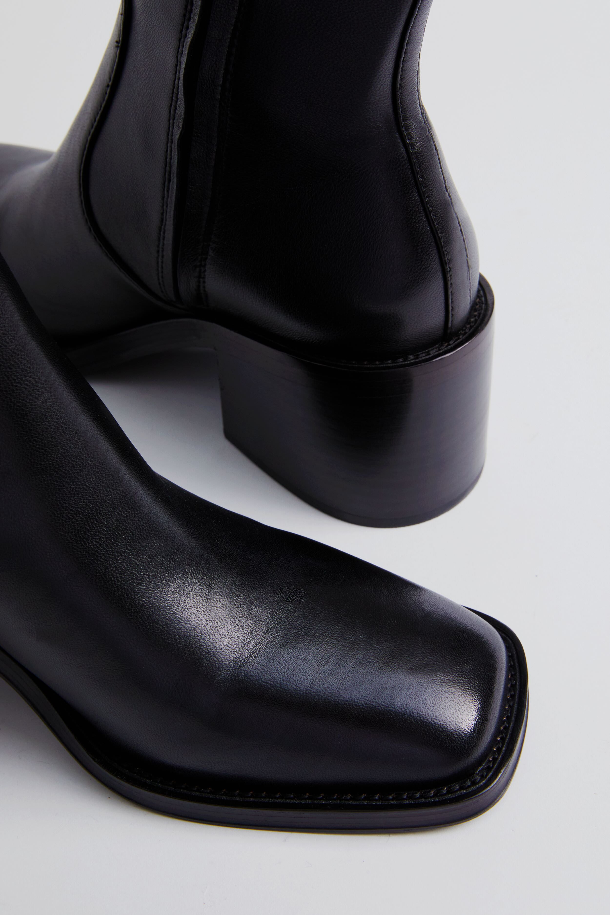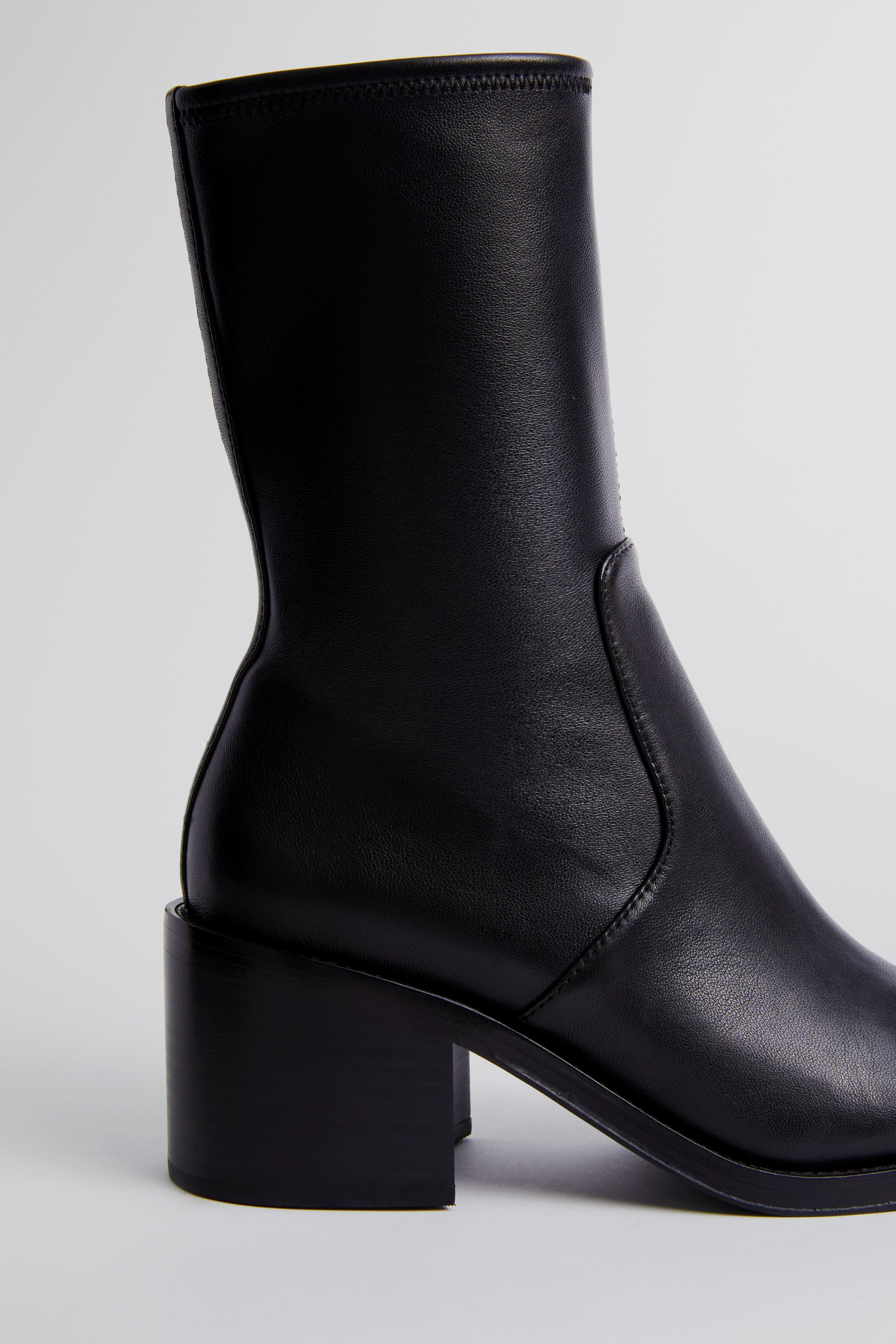 The Black Stretch Nappa Nolan Boots offer a sleek silhouette that ensures all-day wearability. Featuring a slightly squared off toe. a comfortable padded footbed. and a sleek block heel. these beauties have got you covered. Sure to be your go-to this season. we are styling these with dresses. denim. trousers. skirts. and more!