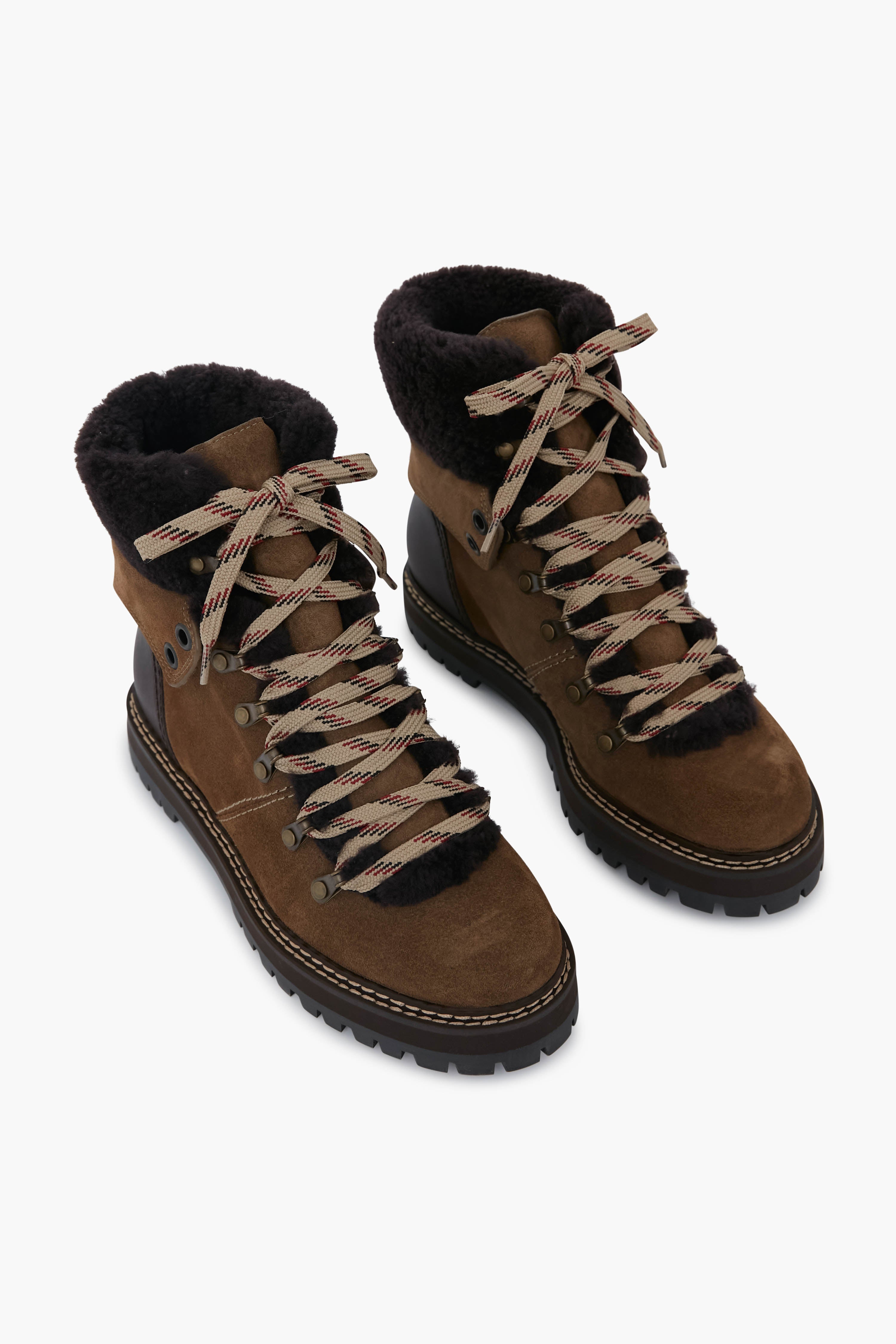 The brown Eileen Boots are a cool. chunky shoe. that feature a nubuck calfskin and warm shearling upper. While the cotton laces and hiking hooks ensure a comfortable fit. the lugged rubber outsole evokes a sporty aesthetic of this snow boot. We are wearing these with denim and scarves for a comfortable. yet chic look.